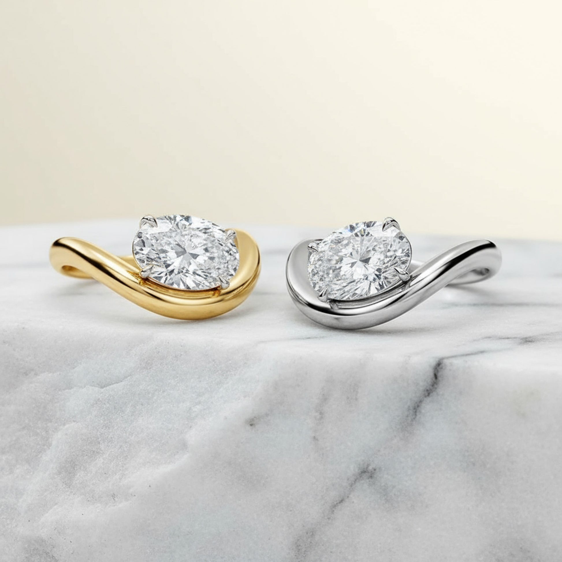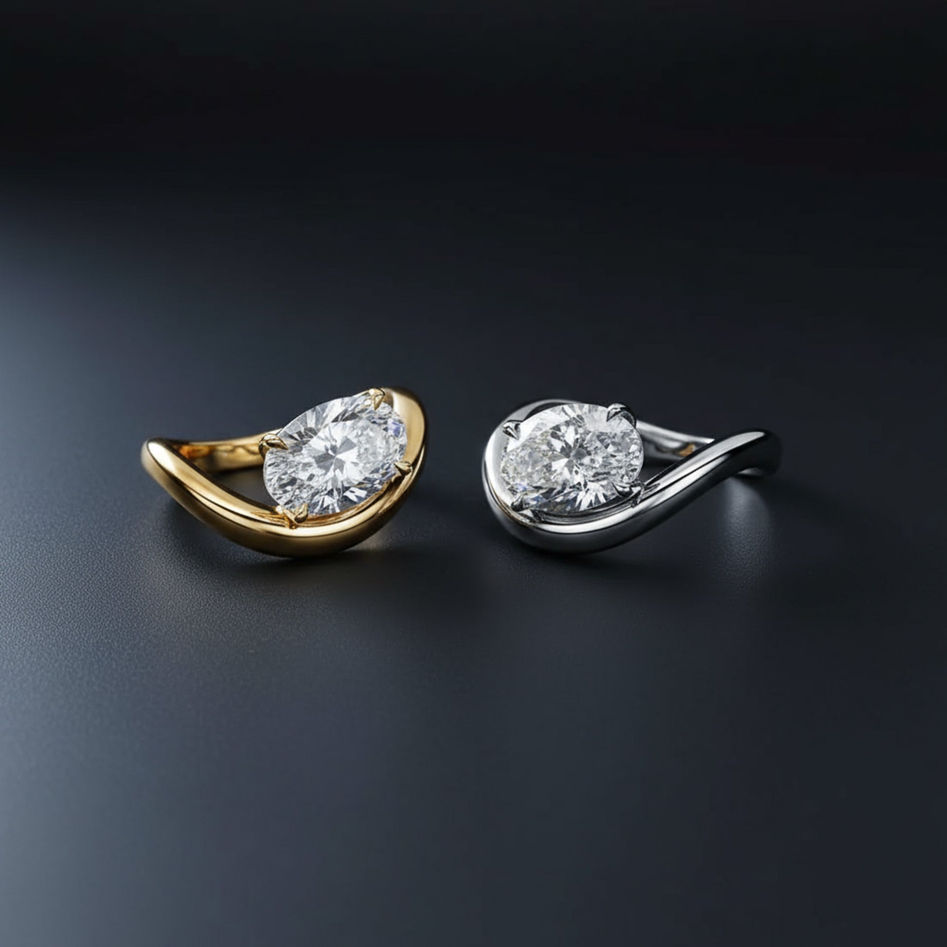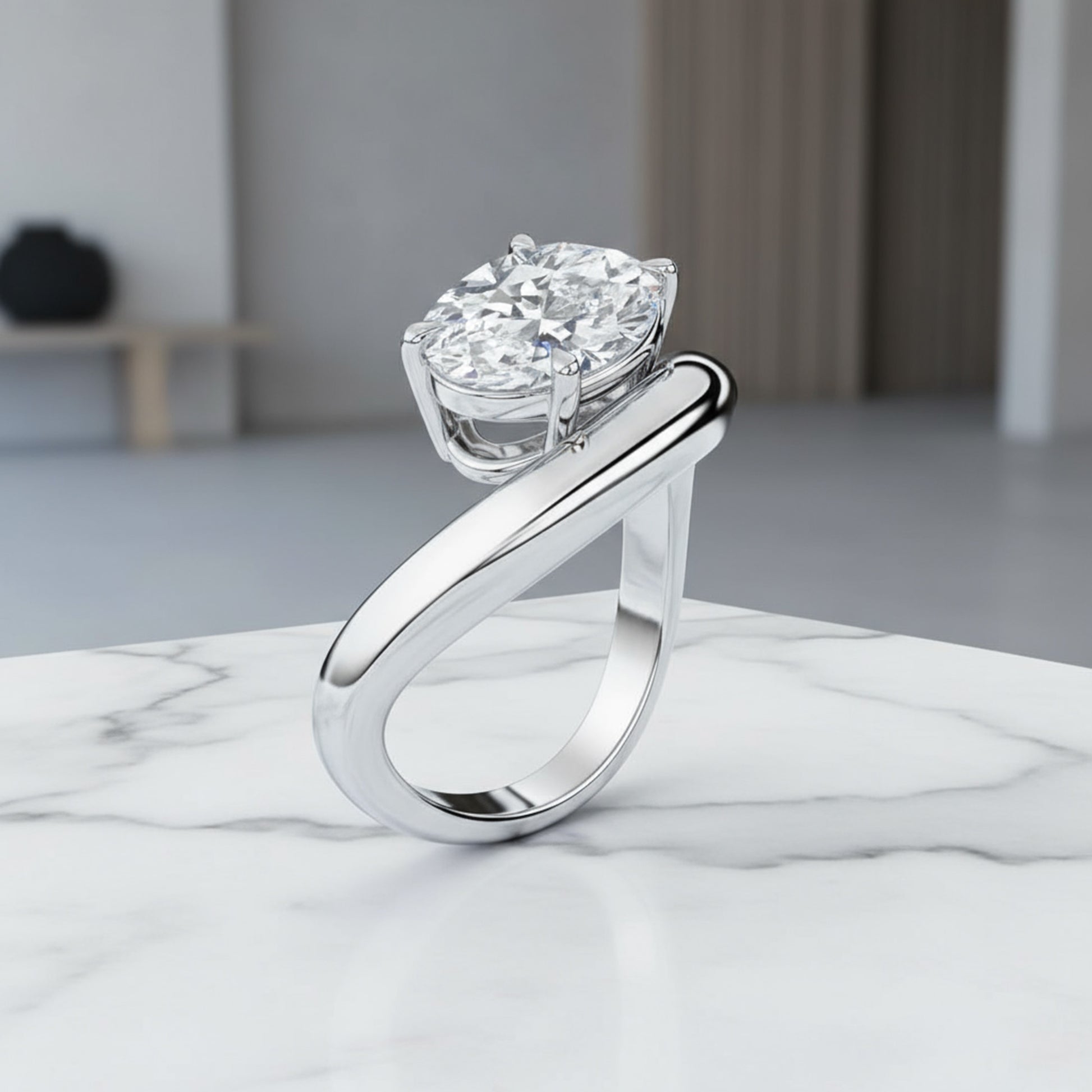 This unique oval-cut engagement ring features a captivating diamond nestled gracefully in the curve of the band, set to the side for a modern, artistic touch. The elegant design highlights the stone's brilliance while offering a fresh take on timeless romance.