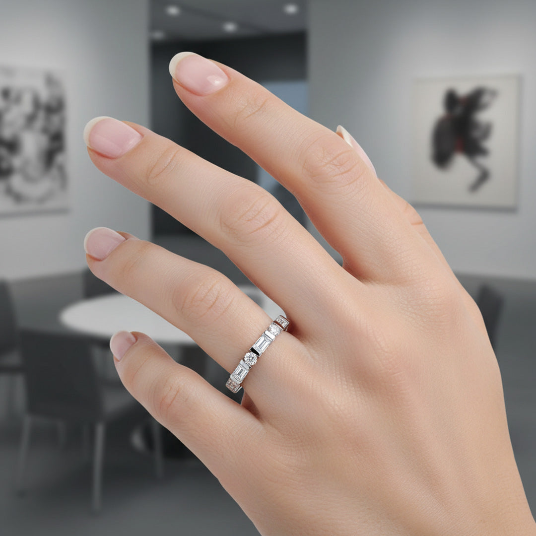 Emerald and round diamonds alternate in this 2.50 ct eternity wedding band, blending clean lines with soft brilliance for a timeless design that sparkles from every angle.