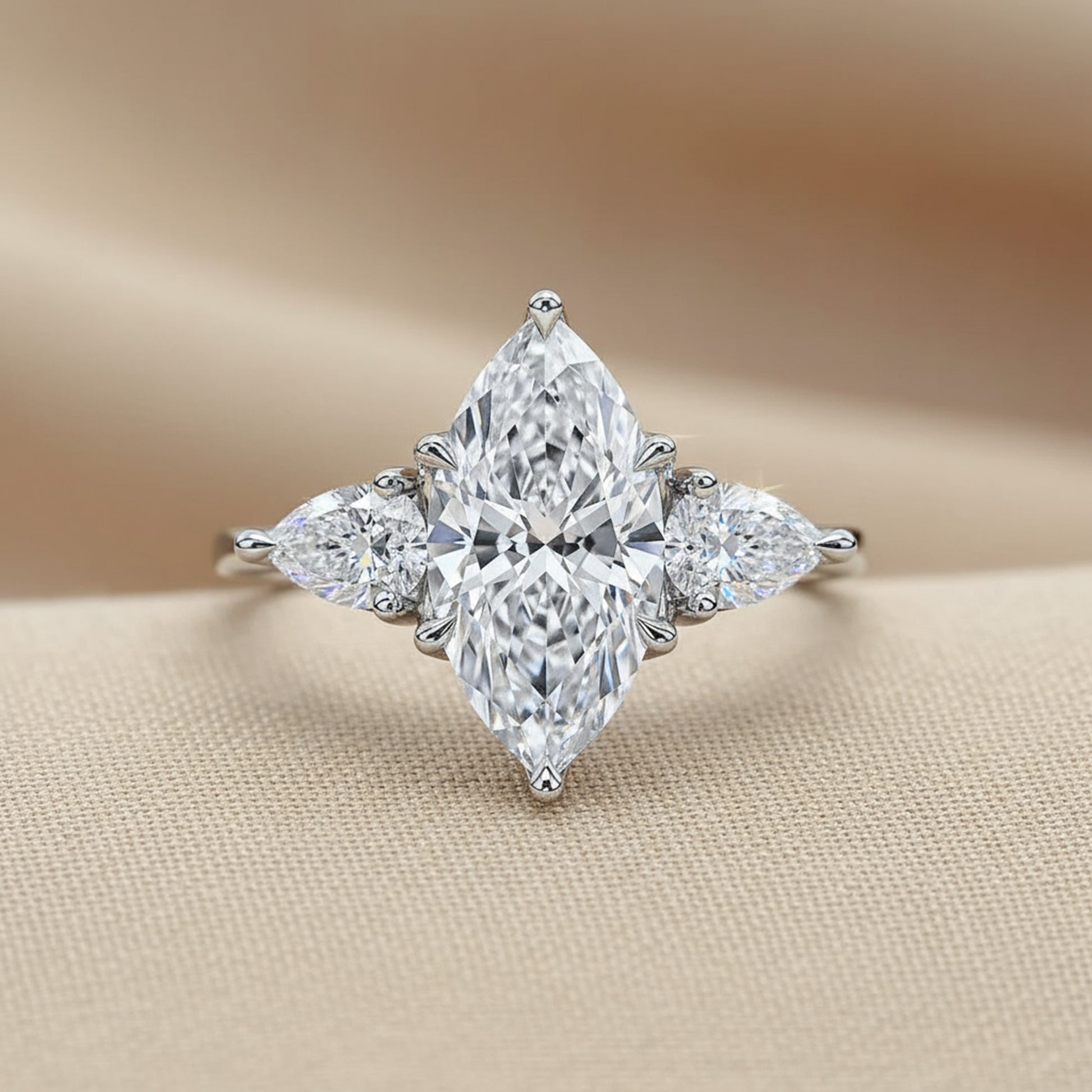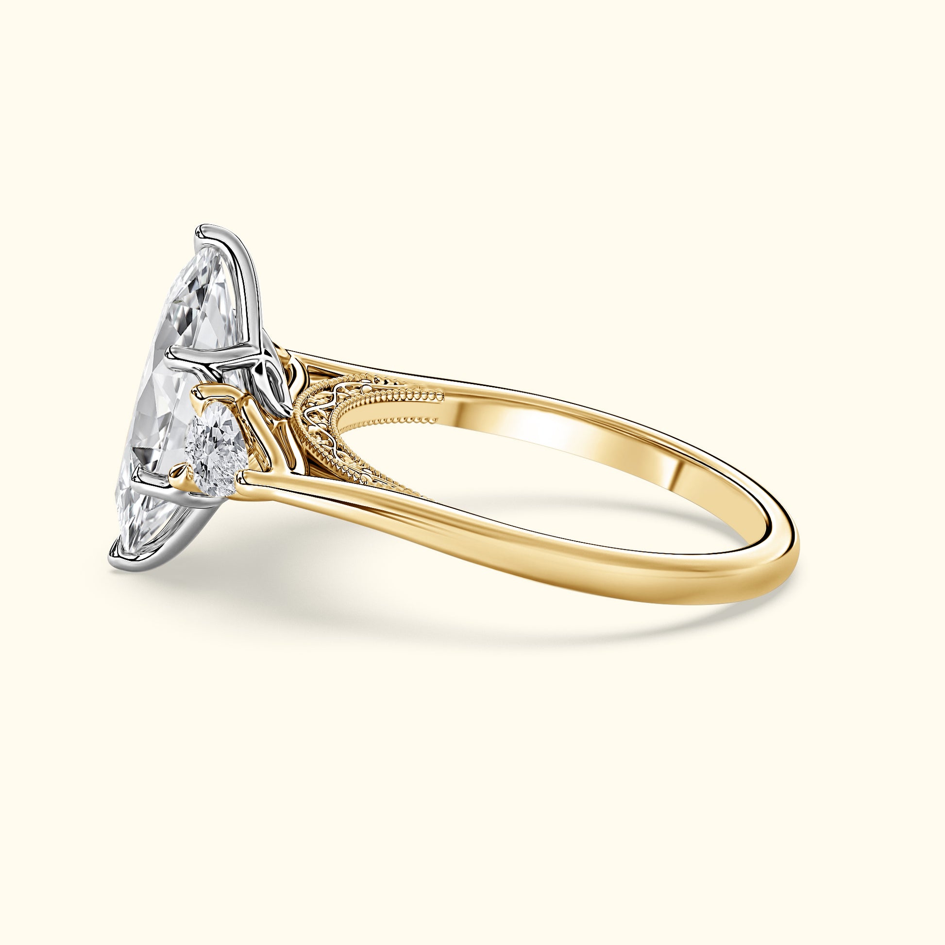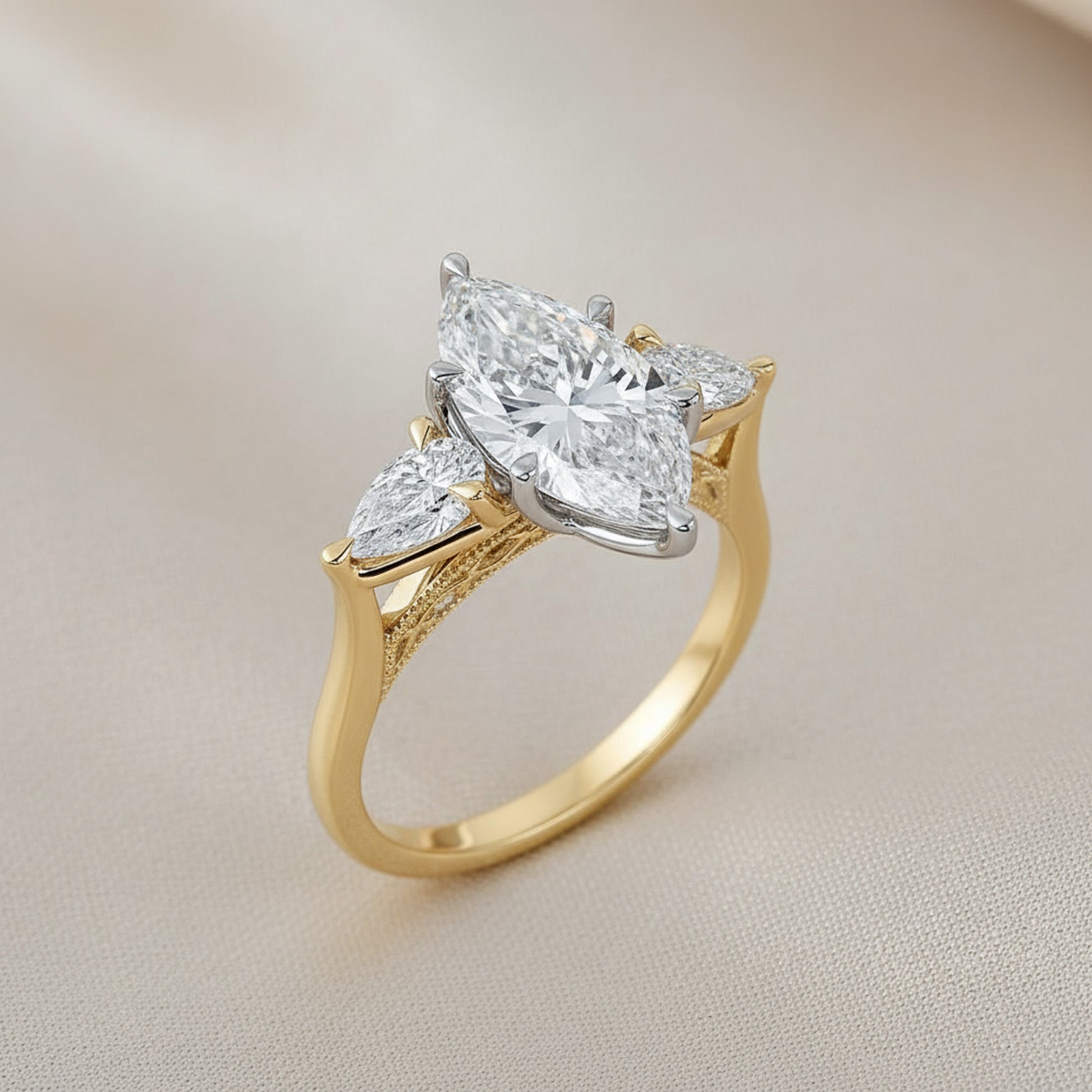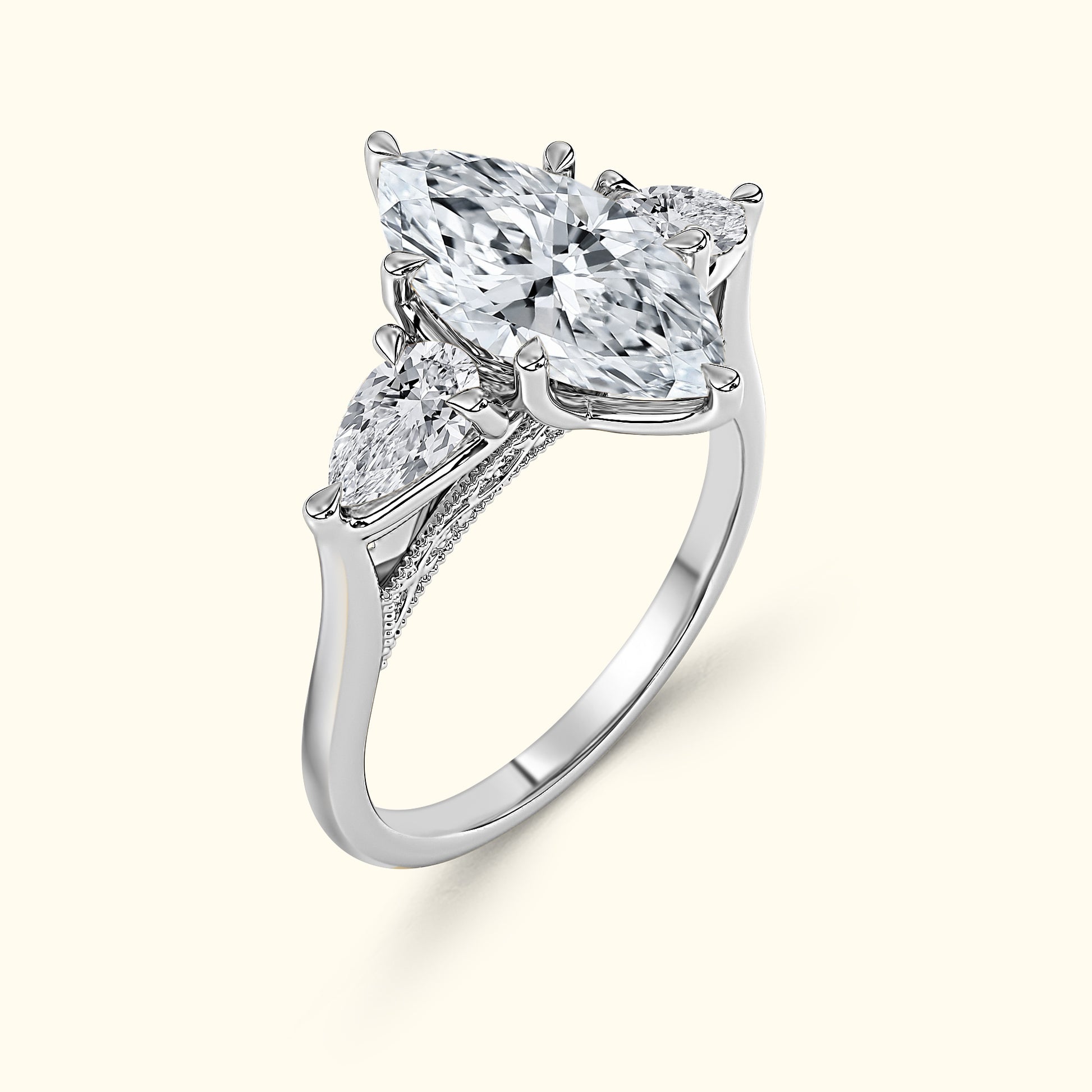 This three-stone engagement ring features a dazzling marquise center stone, accentuated by pear-shaped diamonds that beautifully frame its shape. Delicate filigree detailing along the bridge adds vintage charm and intricate beauty, while the refined solitaire band completes the design — a symbol of love that feels both timeless and uniquely personal.