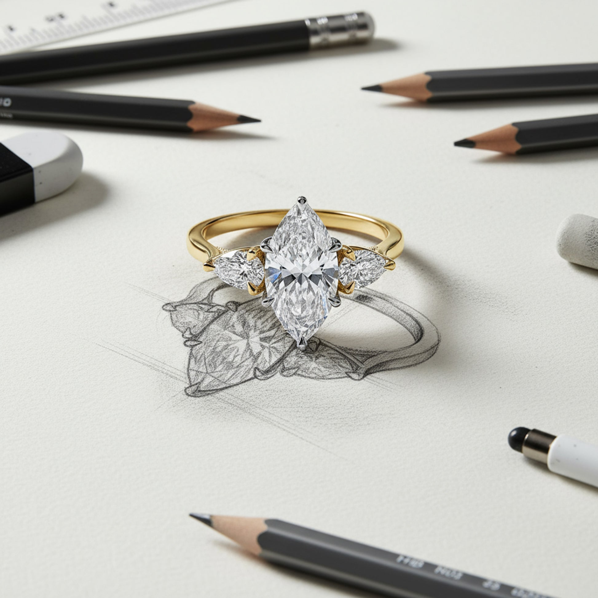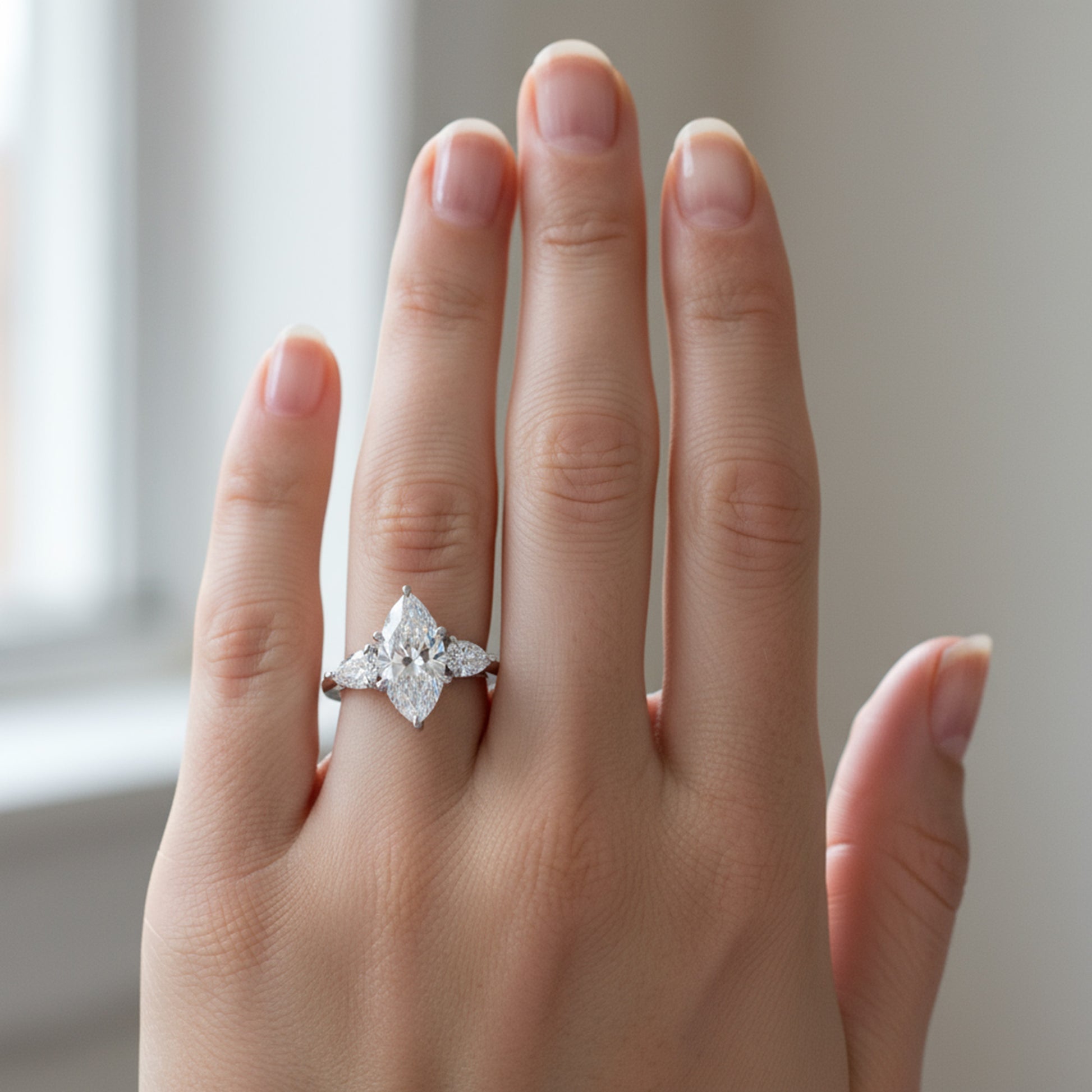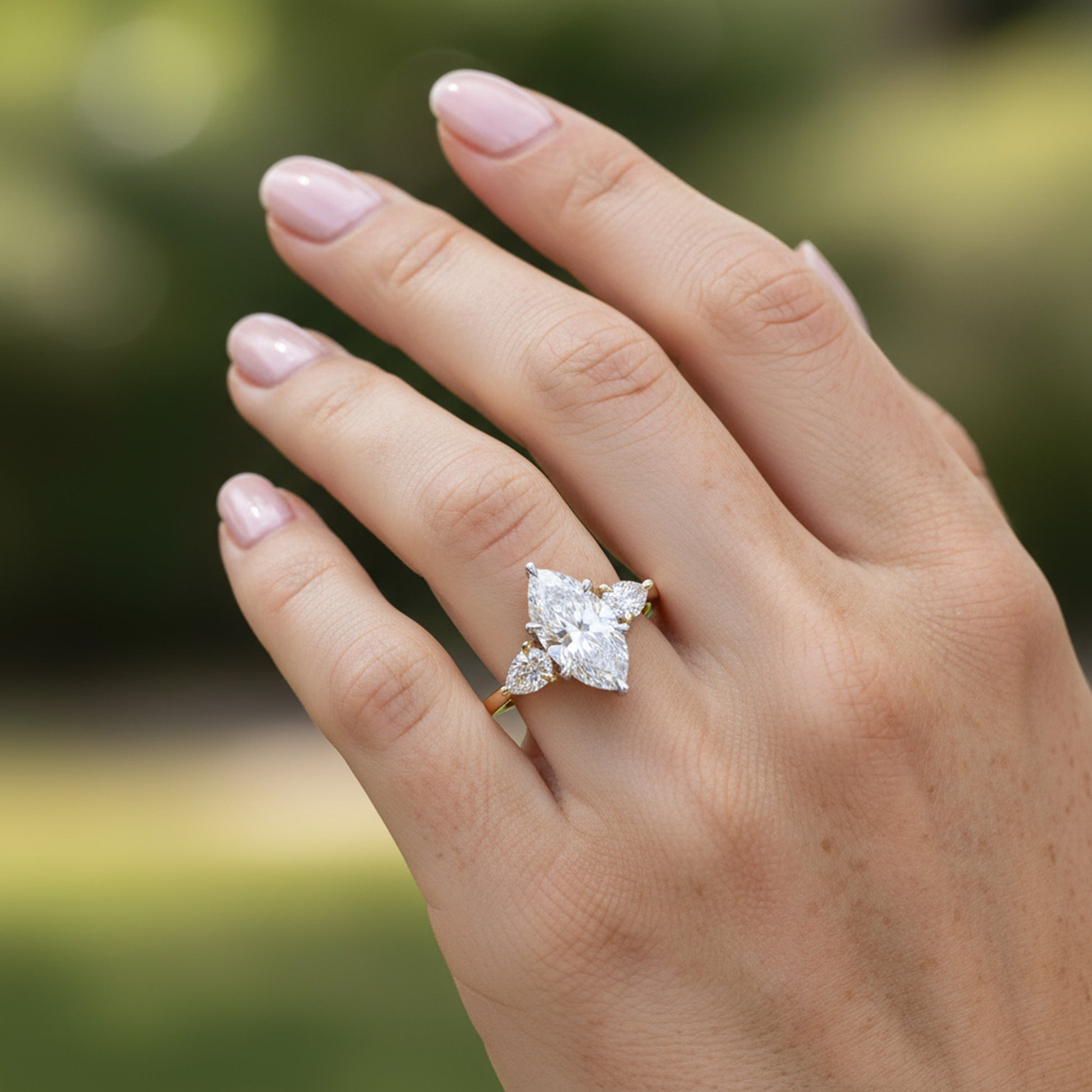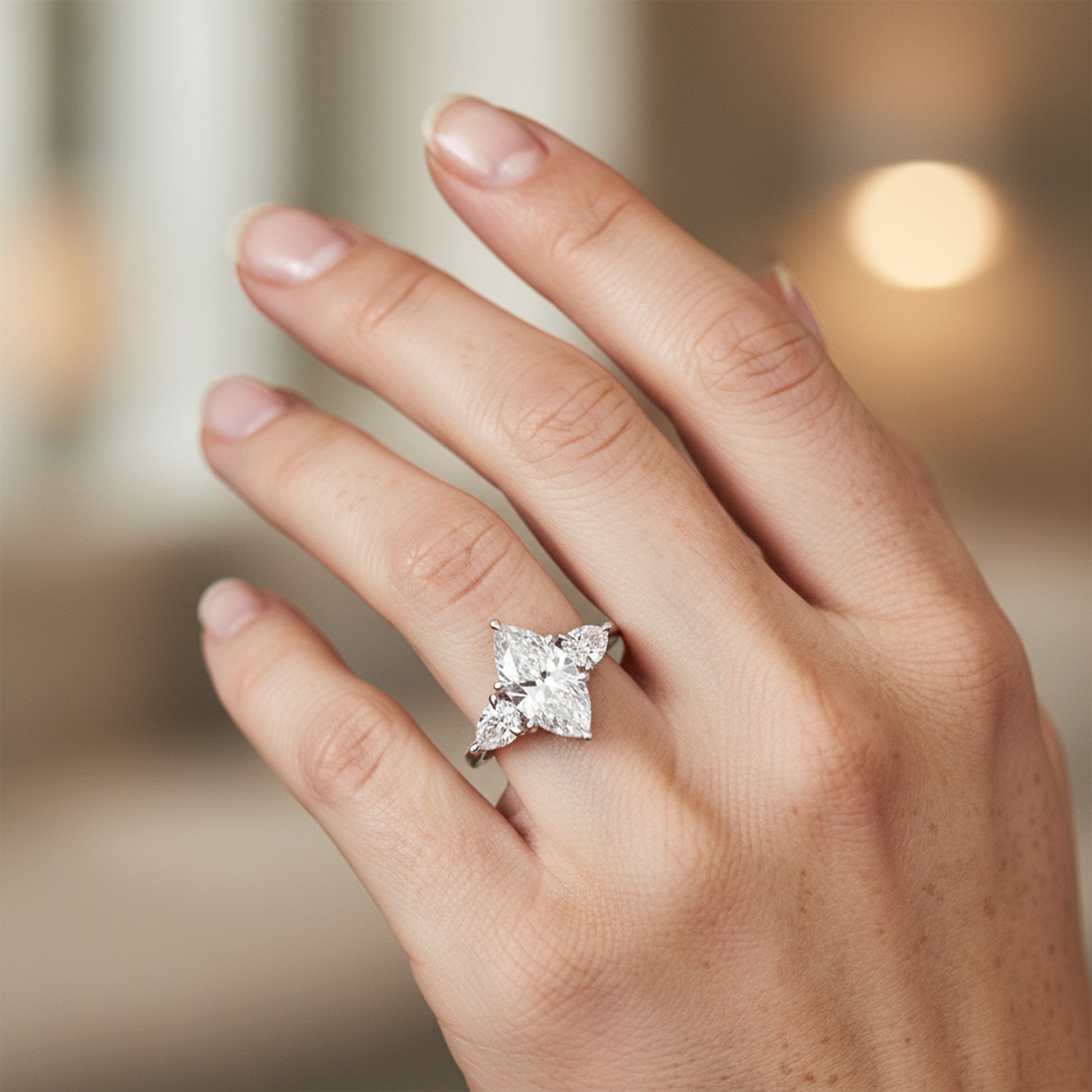This three-stone engagement ring features a dazzling marquise center stone, accentuated by pear-shaped diamonds that beautifully frame its shape. Delicate filigree detailing along the bridge adds vintage charm and intricate beauty, while the refined solitaire band completes the design — a symbol of love that feels both timeless and uniquely personal.