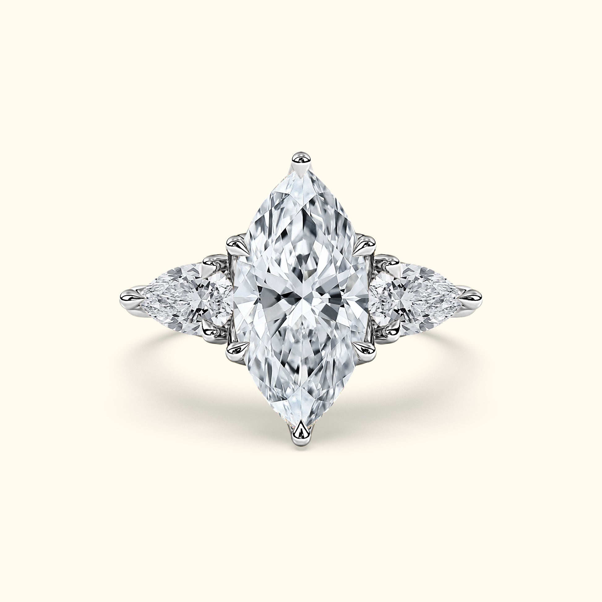 This three-stone engagement ring features a dazzling marquise center stone, accentuated by pear-shaped diam... Show more
