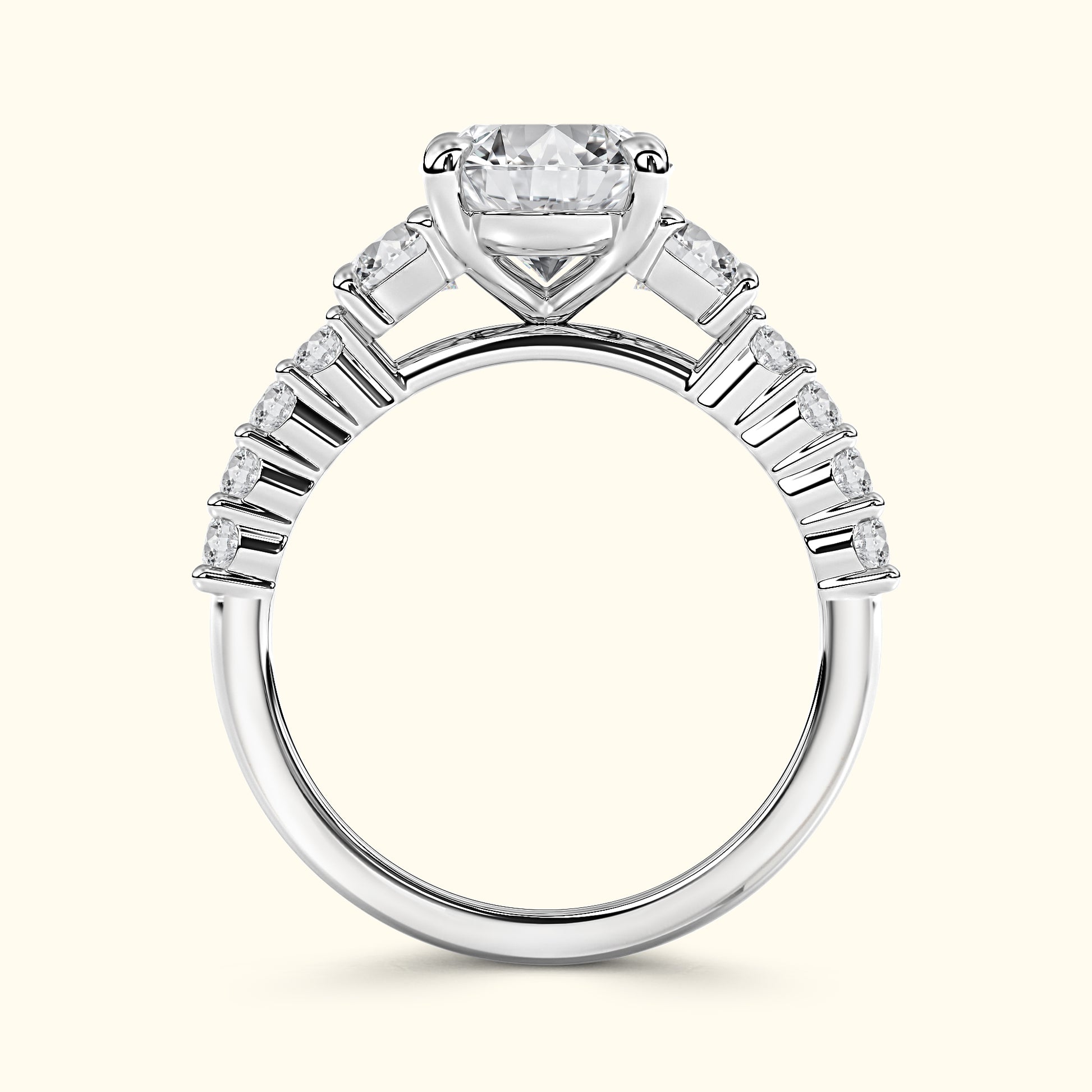 A captivating oval-cut center diamond is framed by half-moon side stones, creating a graceful balance of brilliance and symmetry. Round brilliant diamonds along the shank complete the design with a radiant sparkle from every angle — a timeless symbol of elegance and love