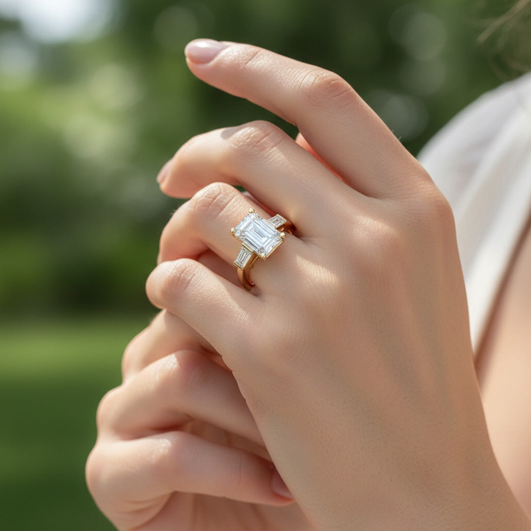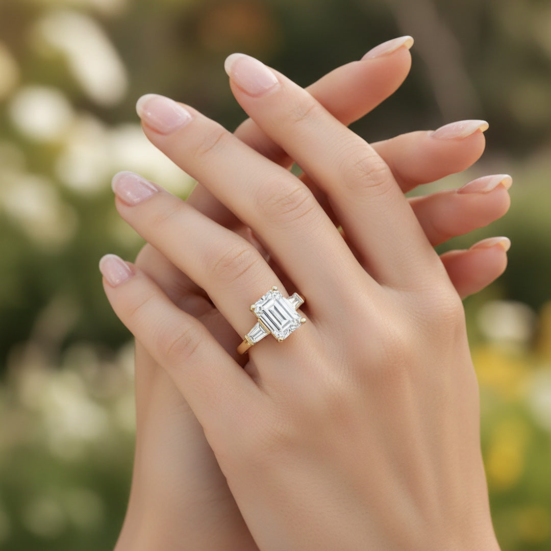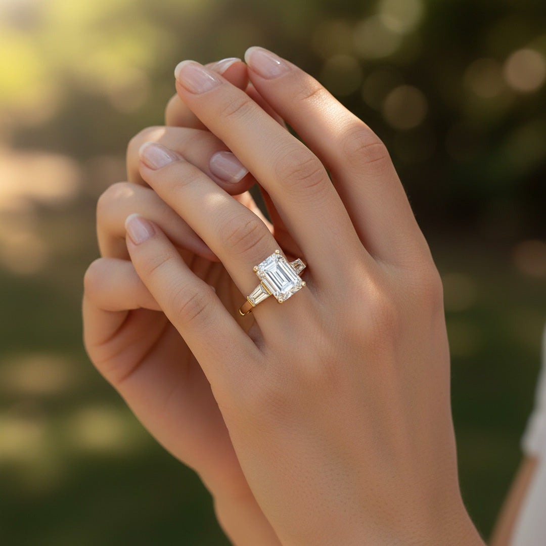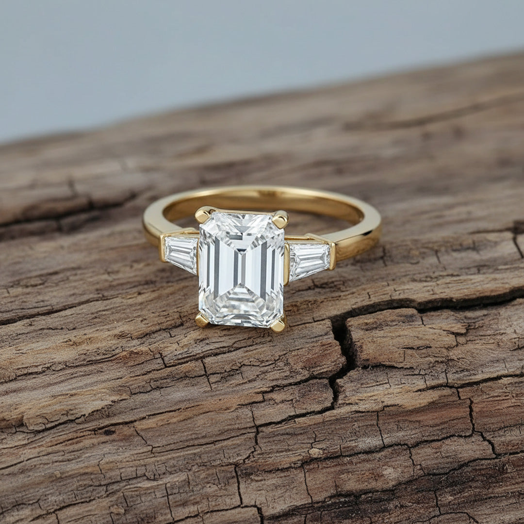 This elegant engagement ring features a stunning emerald-cut center diamond accented by two baguette side stones. Its clean lines and classic design create a timeless, modern look—perfect for celebrating your love.