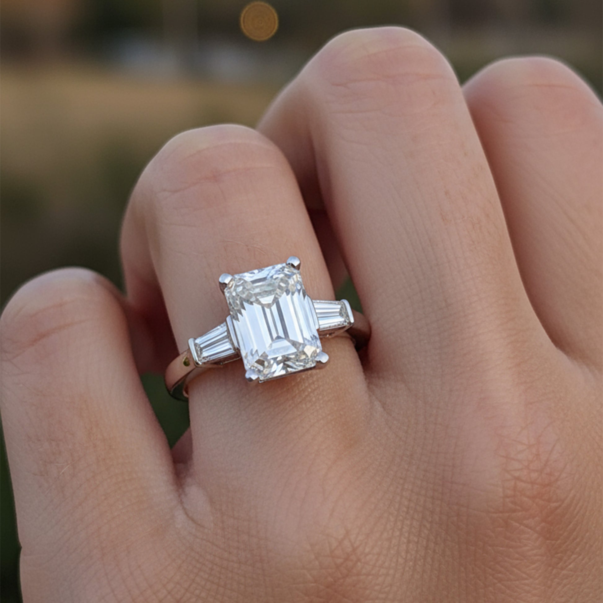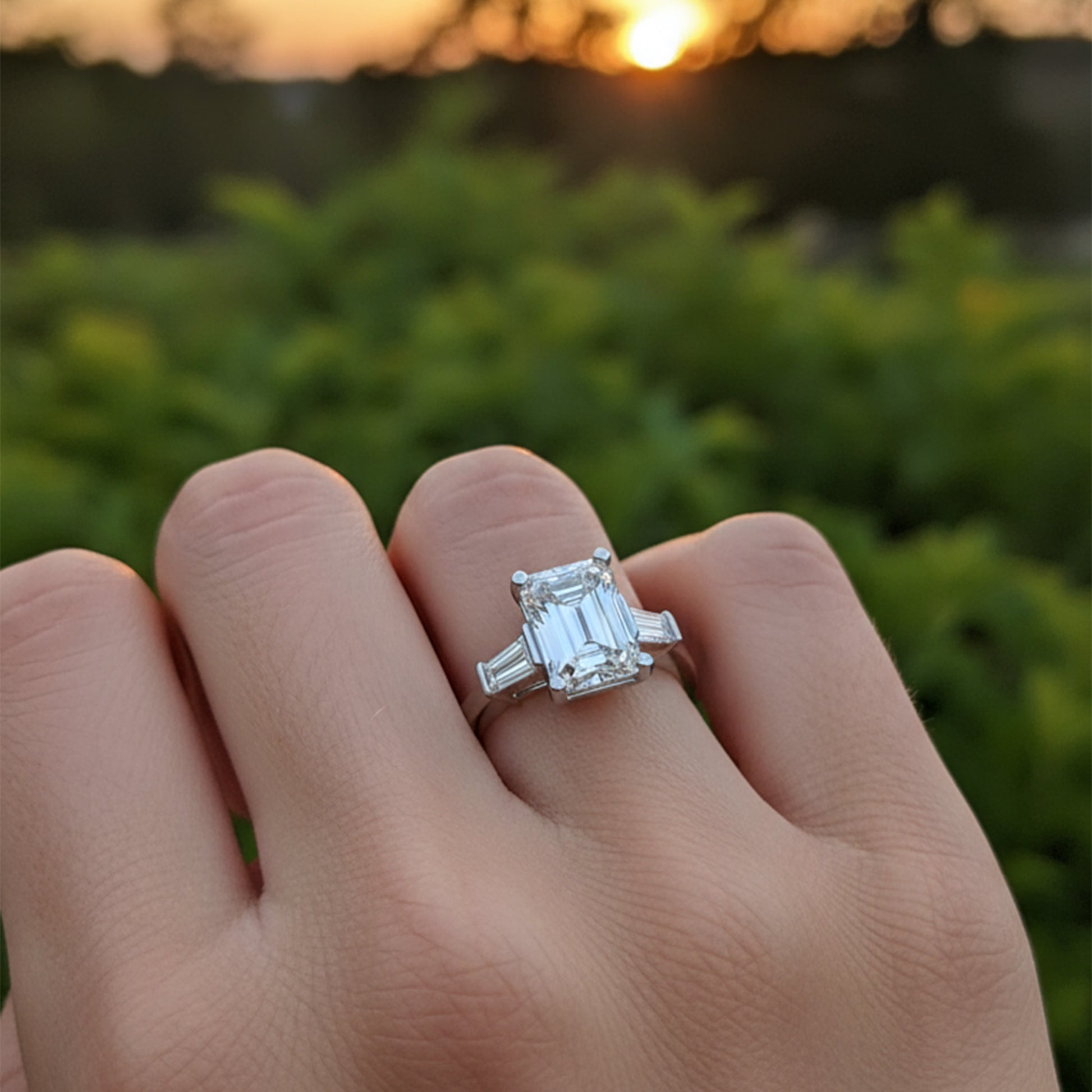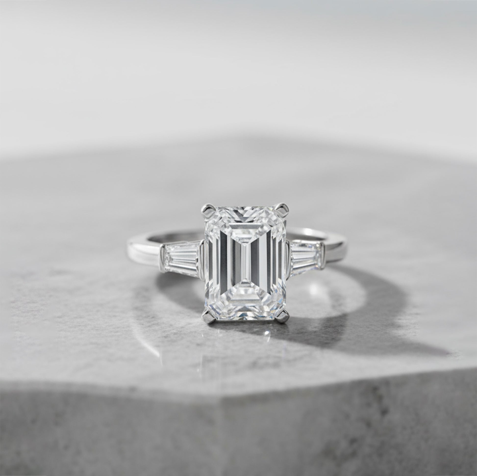 This stunning diamond engagement ring features a striking emerald-cut center stone, flanked by two elegant baguette-shaped side stones. The clean lines and sophisticated design create a timeless, yet modern look, perfect for celebrating your love.