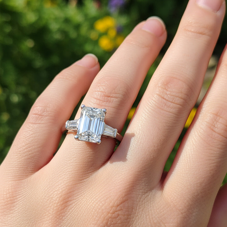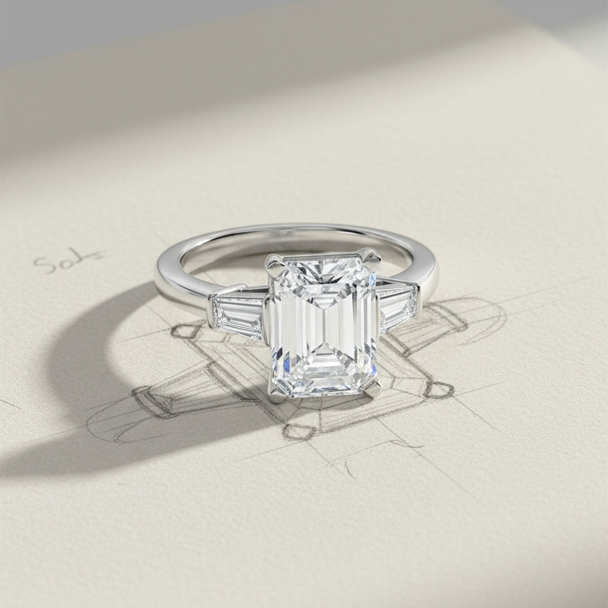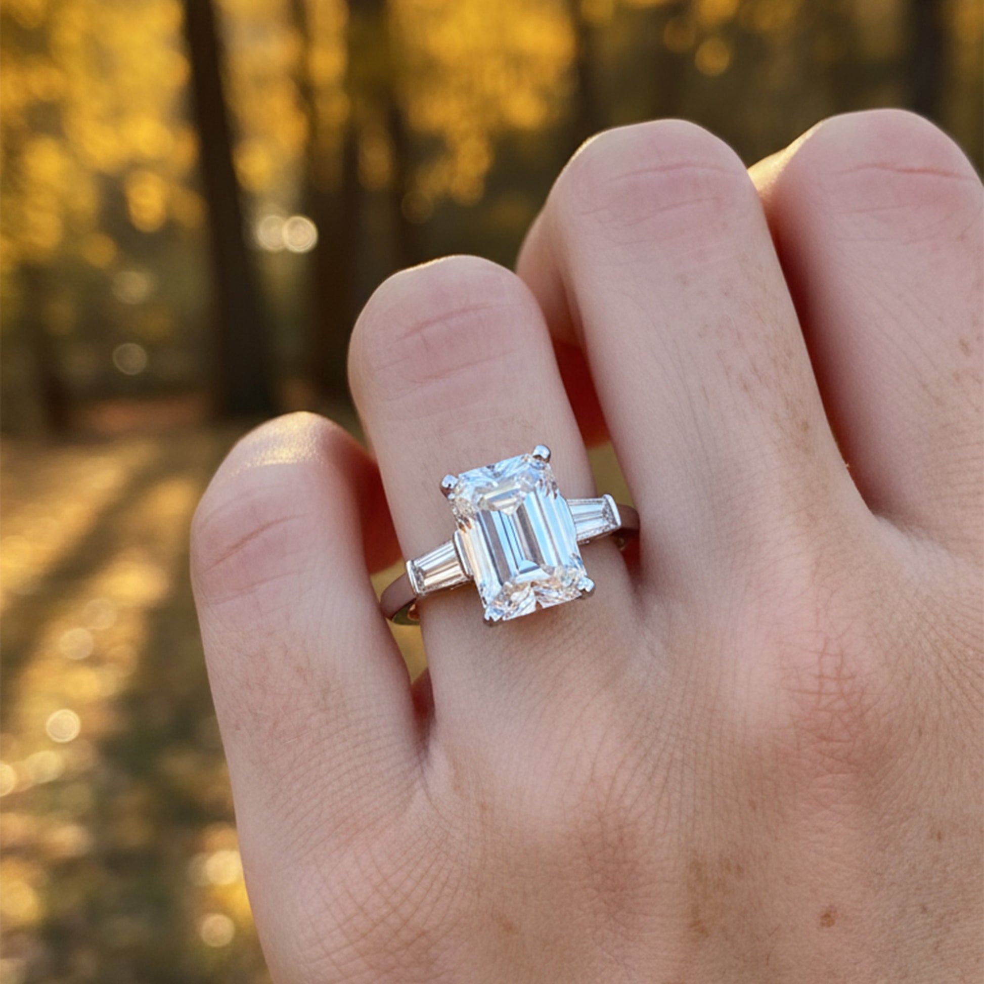 This stunning diamond engagement ring features a striking emerald-cut center stone, flanked by two elegant baguette-shaped side stones. The clean lines and sophisticated design create a timeless, yet modern look, perfect for celebrating your love.