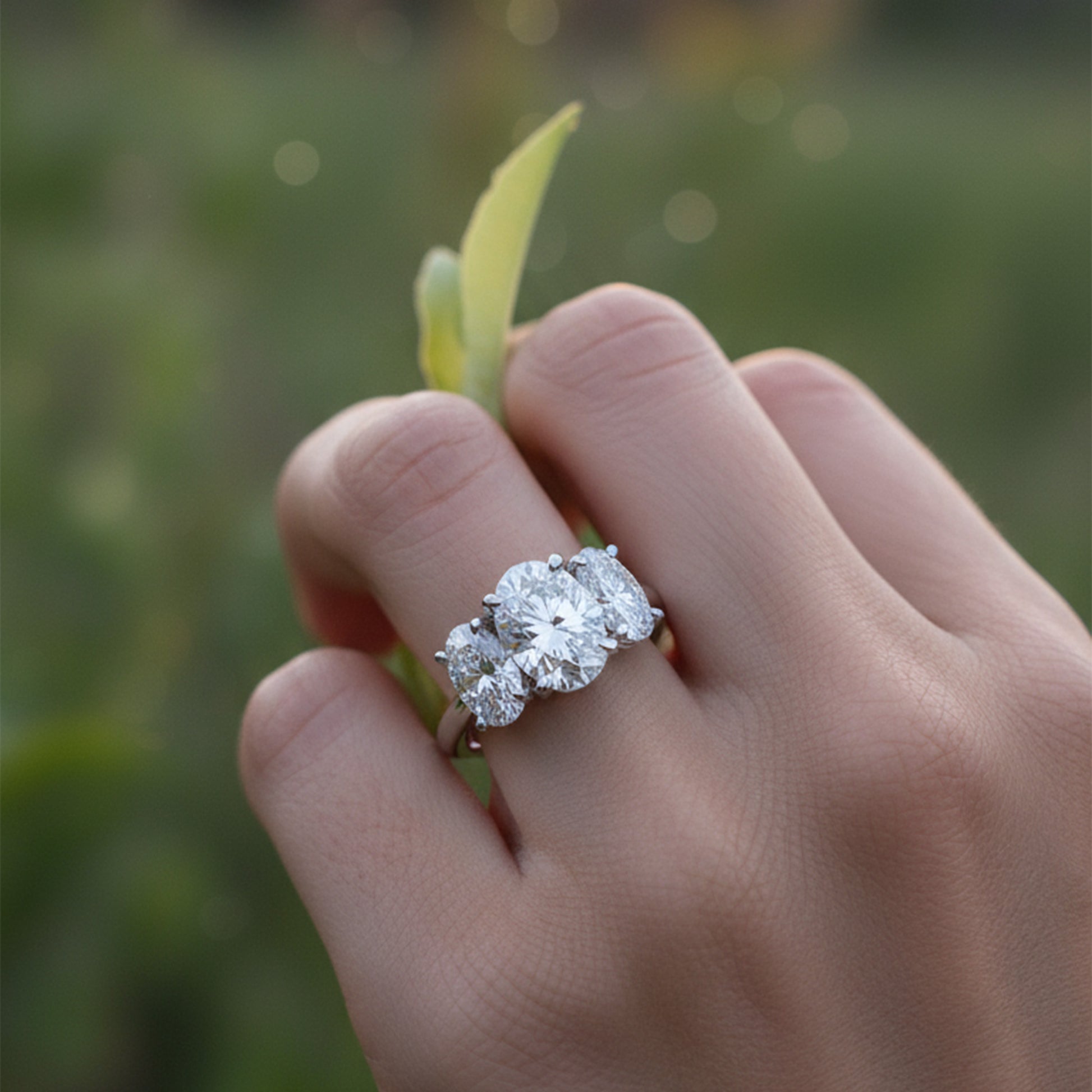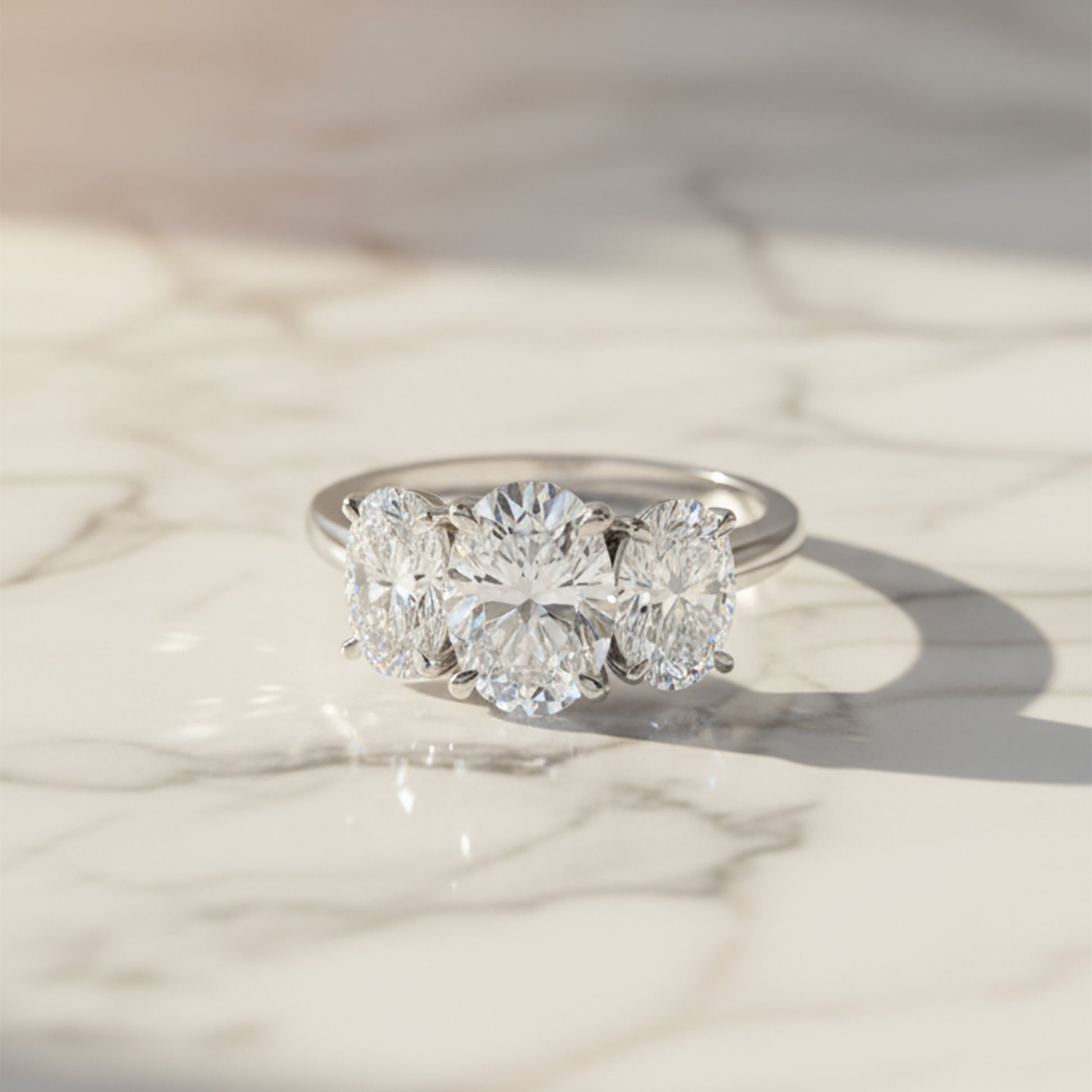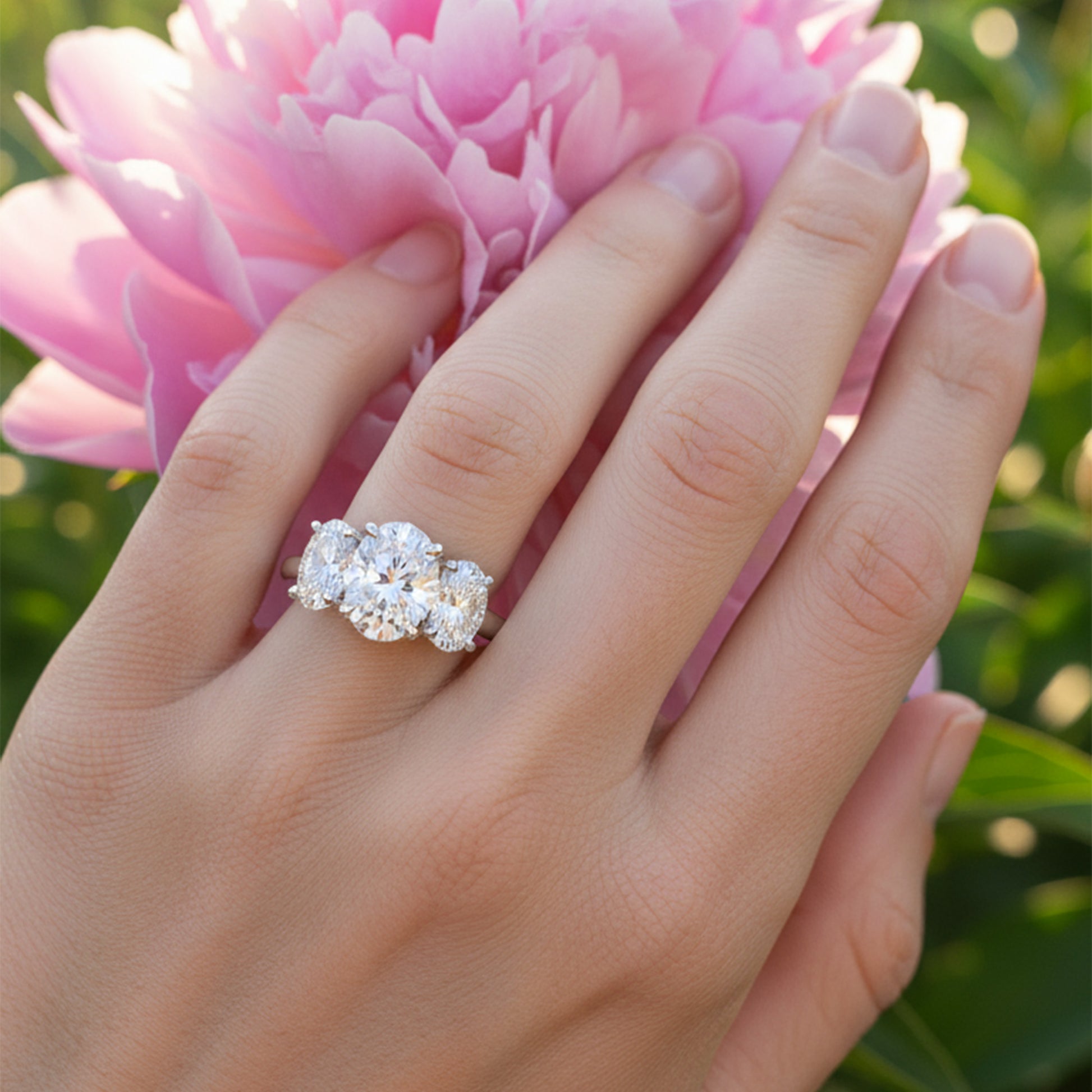This stunning three-stone oval engagement ring features a captivating center oval diamond flanked by two matching oval side stones, creating a harmonious and elegant design. The stones are set in a timeless setting that showcases their brilliance and size, symbolizing your past, present, and future together. Perfect for those who appreciate classic beauty with a touch of modern sophistication.