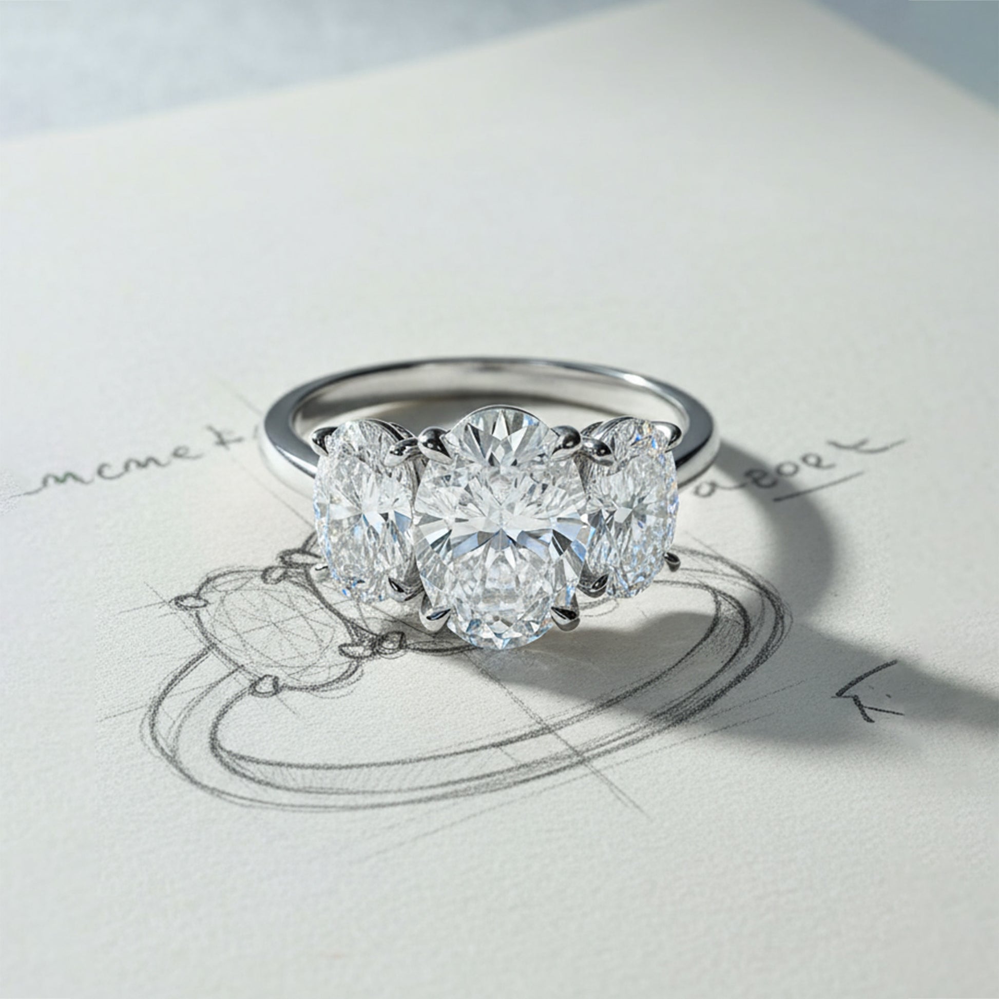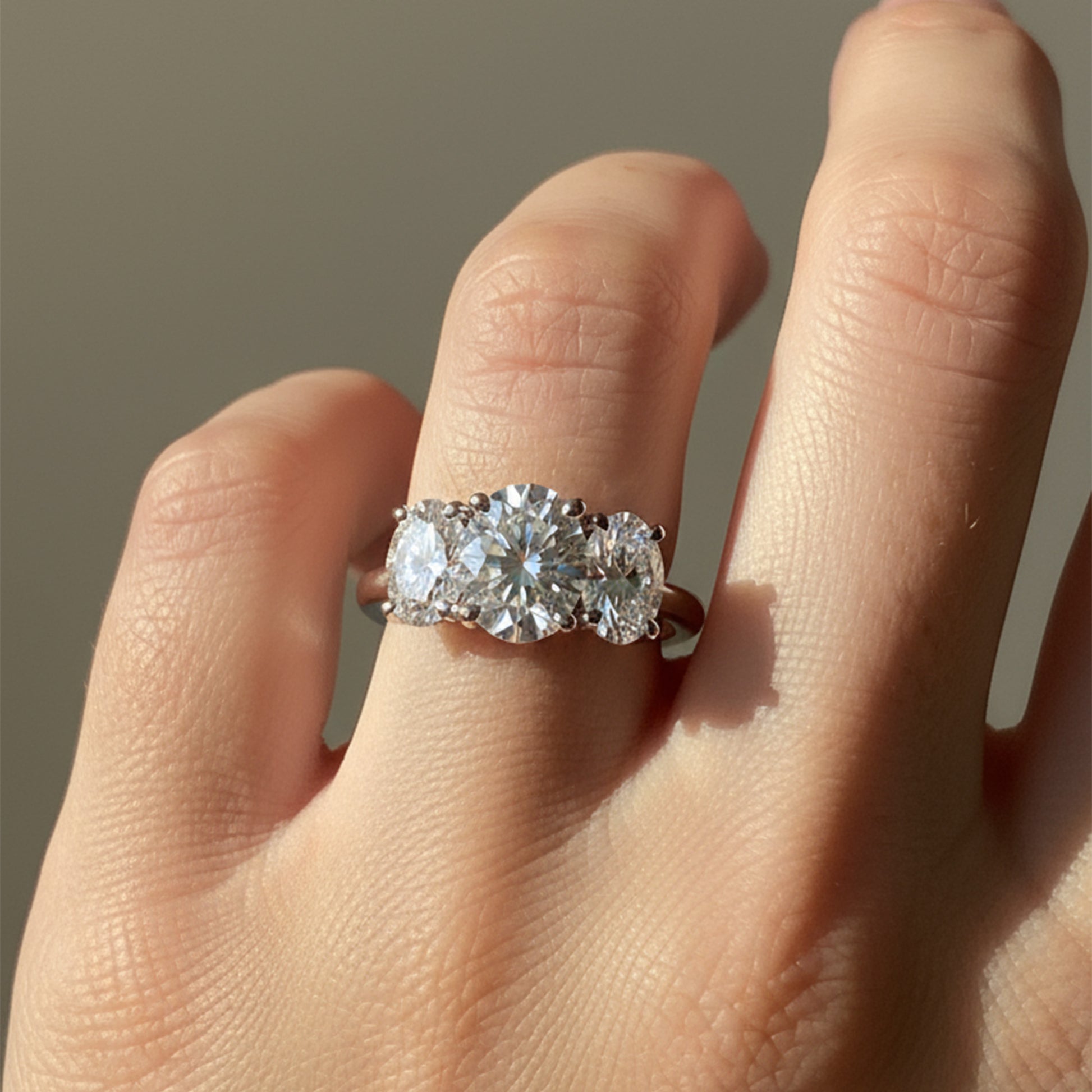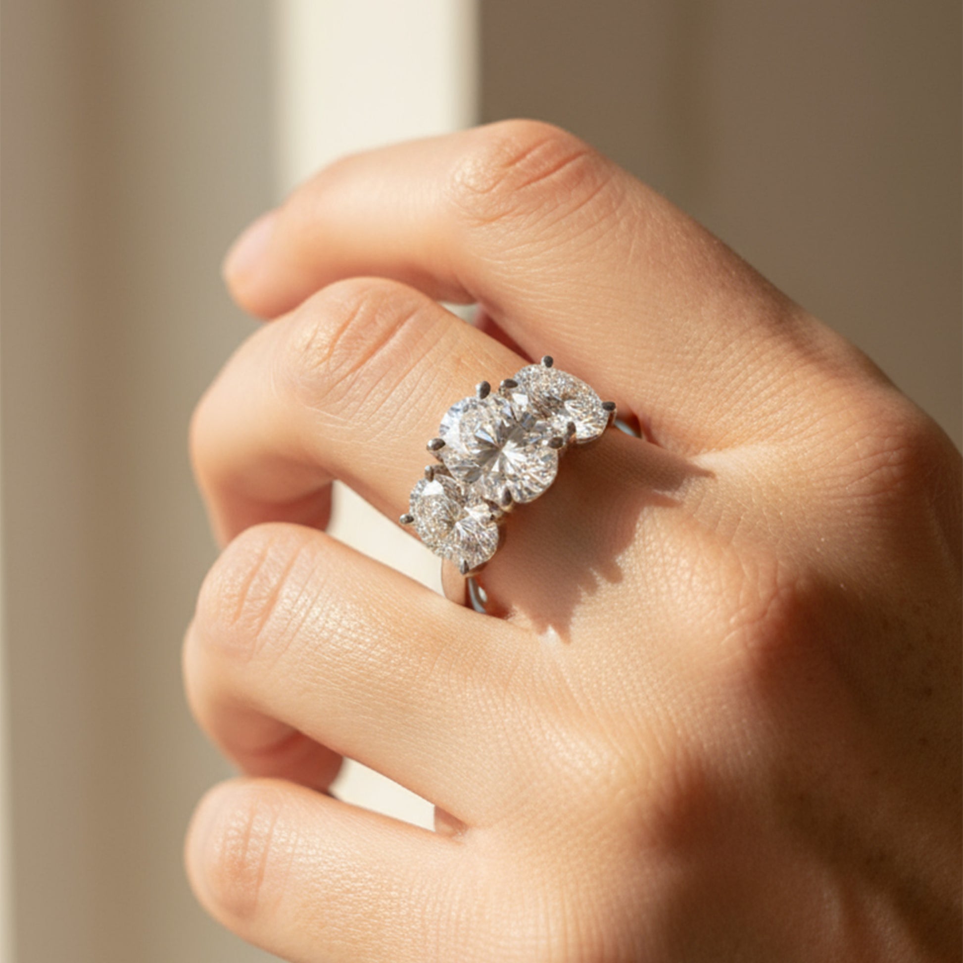 This stunning three-stone oval engagement ring features a captivating center oval diamond flanked by two matching oval side stones, creating a harmonious and elegant design. The stones are set in a timeless setting that showcases their brilliance and size, symbolizing your past, present, and future together. Perfect for those who appreciate classic beauty with a touch of modern sophistication.