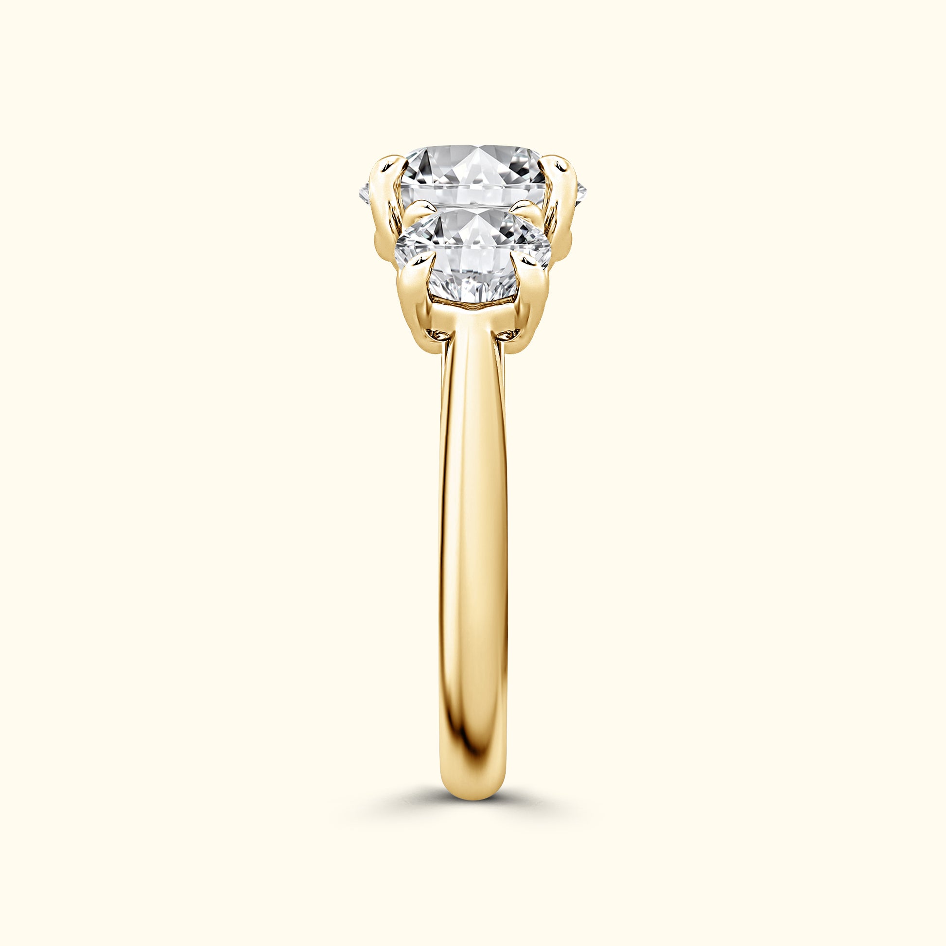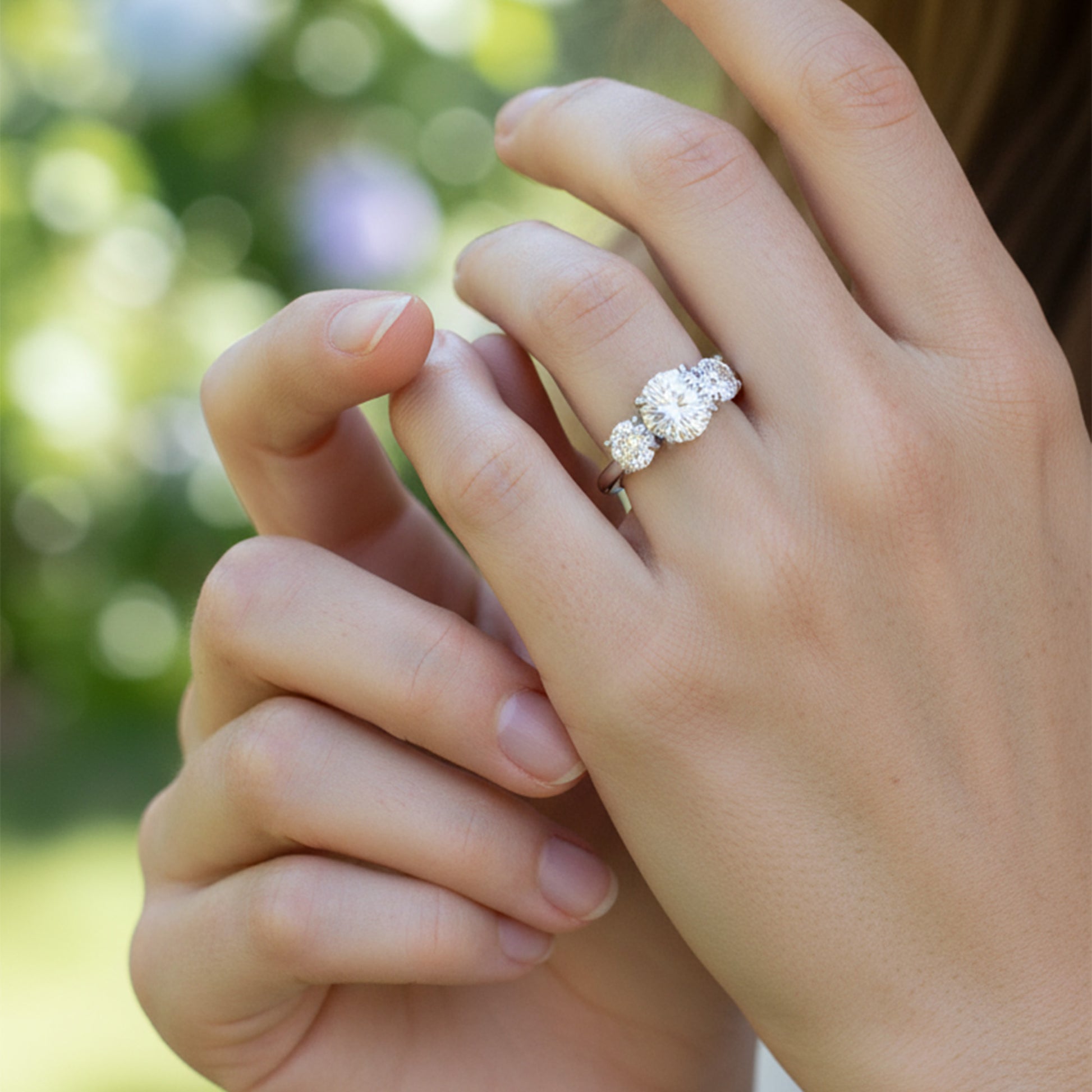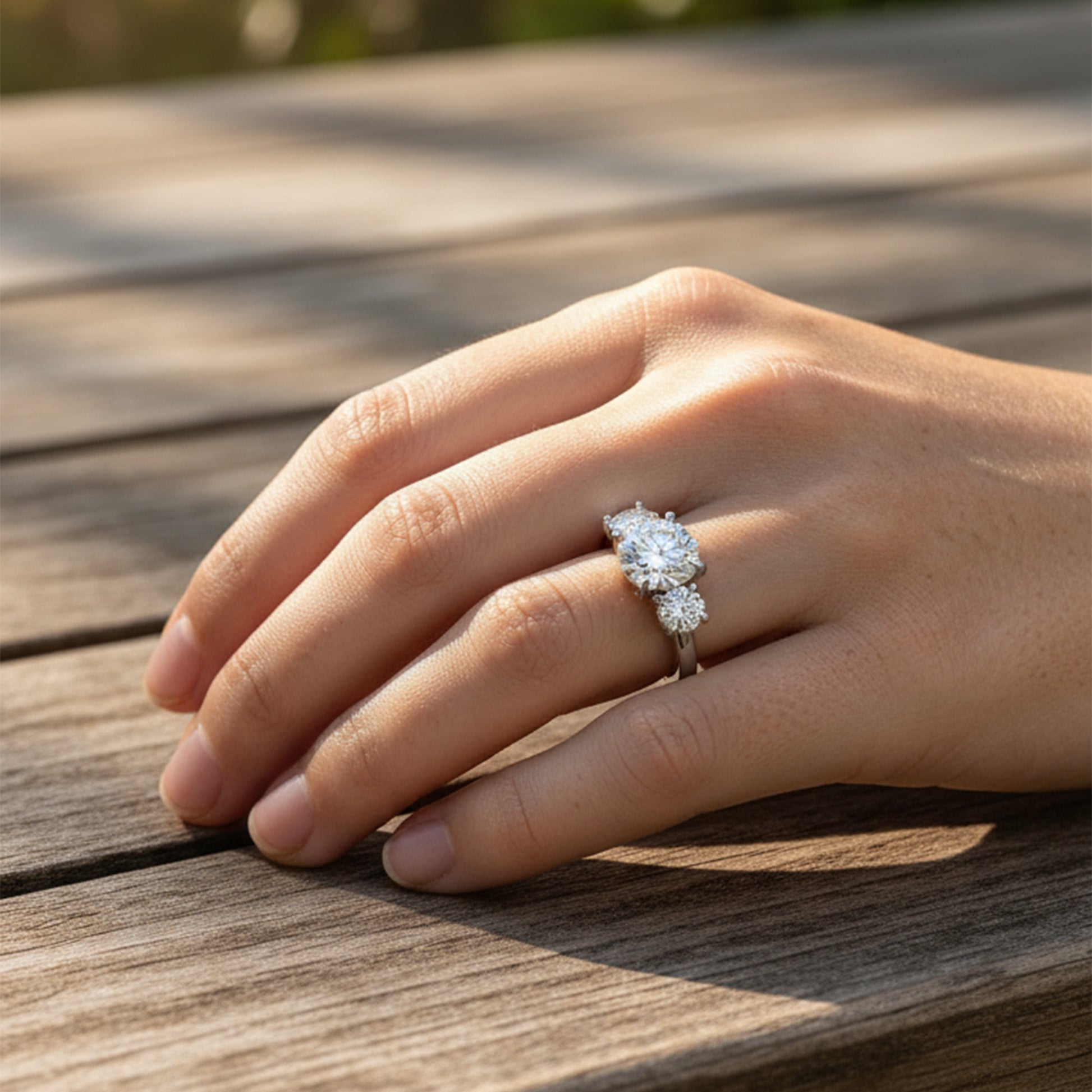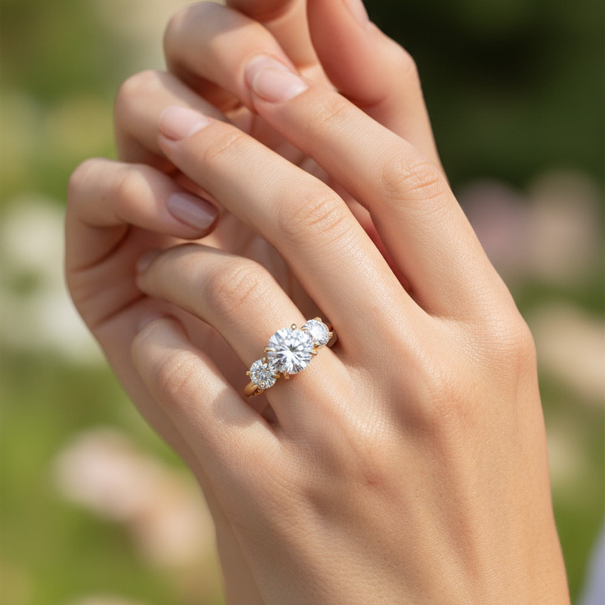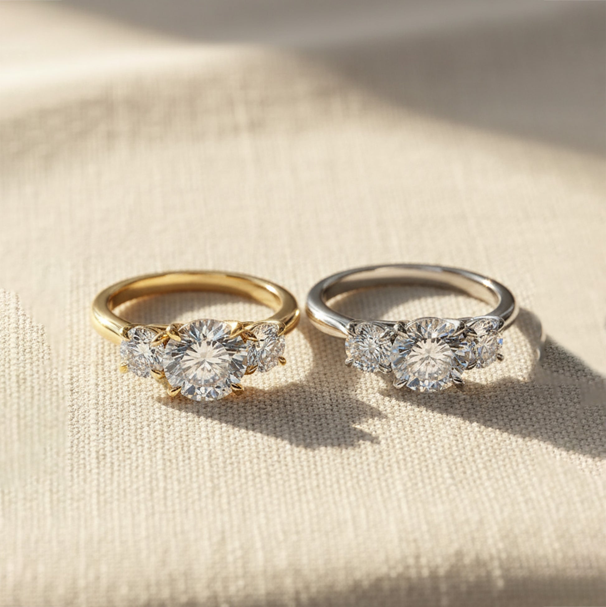 This stunning 3-stone ring features a larger round diamond at its center, flanked by two brilliant round side diamonds. The combination of the dazzling center stone and the sparkling accents creates a striking and elegant design, symbolizing the past, present, and future of your love. Perfect for marking a special moment or celebrating timeless beauty.