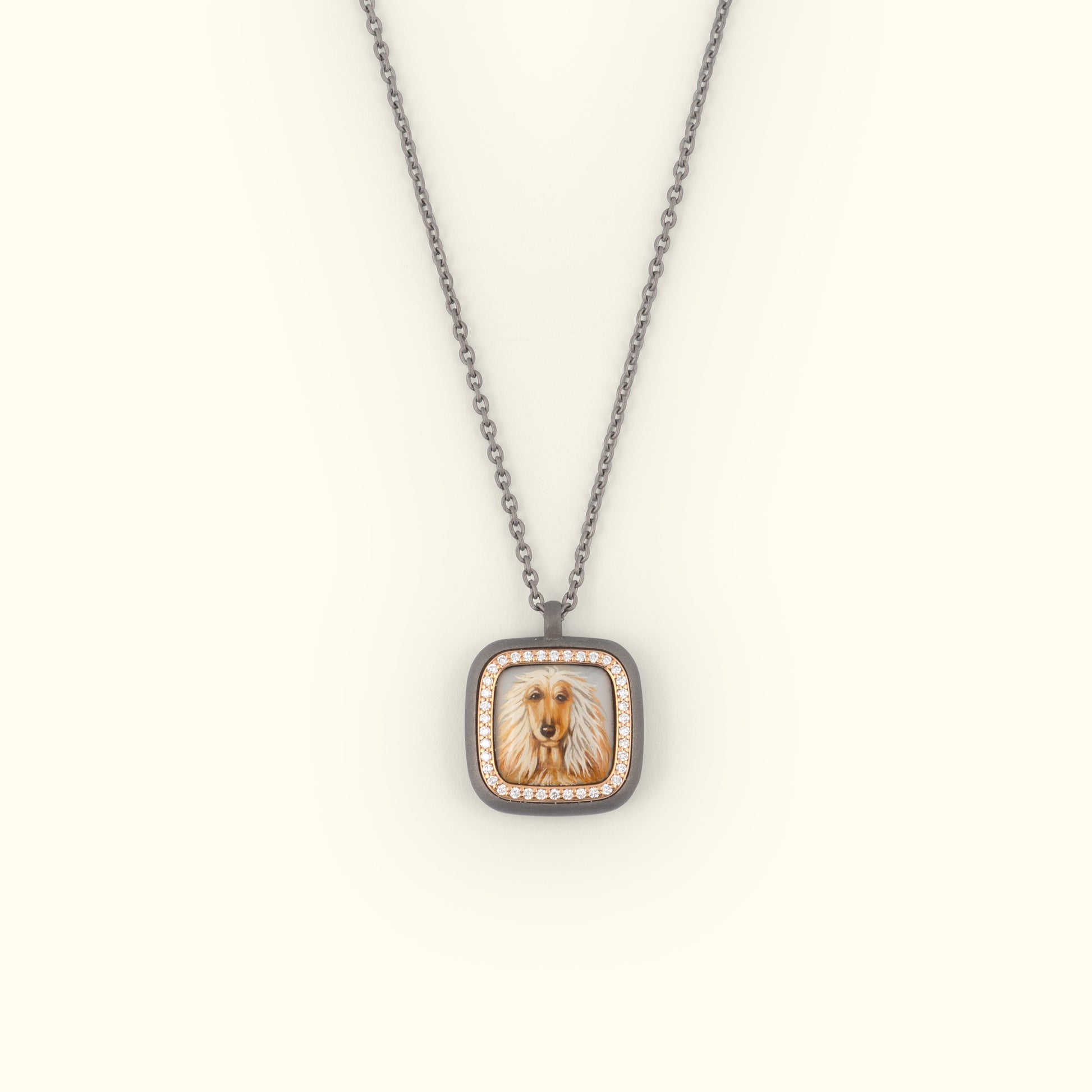 Celebrate your cherished pet with a unique, handcrafted necklace that captures their spirit. From playful pups and curious cats to loyal horses and feathered friends, we honor all beloved companions. Each Pawtrait is meticulously hand-painted by our talented artist and transformed into an elegant pendant necklace crafted from Titanium and 18K Rose Gold, enhanced with natural diamonds for a timeless and sophisticated look.