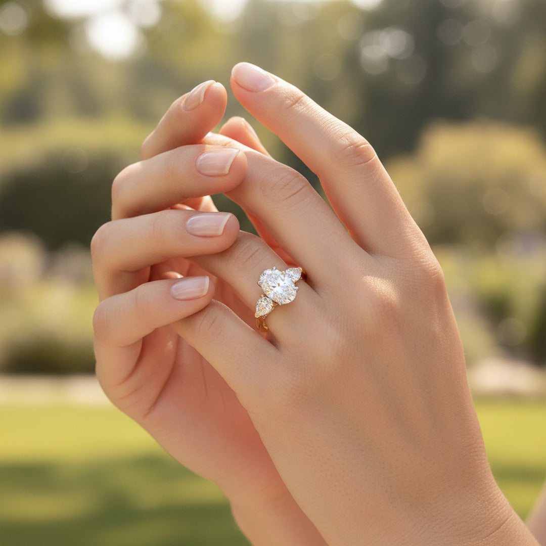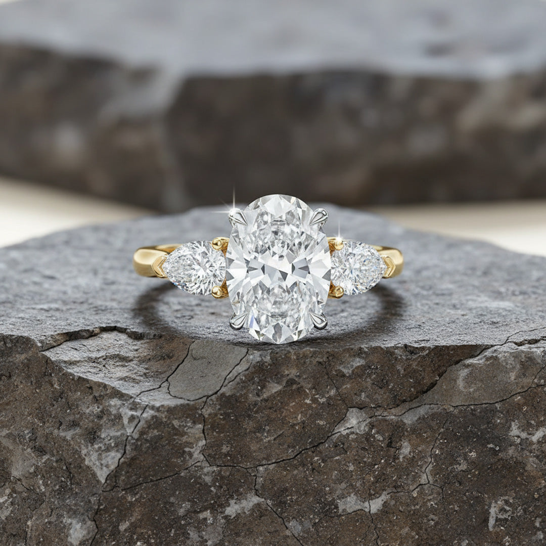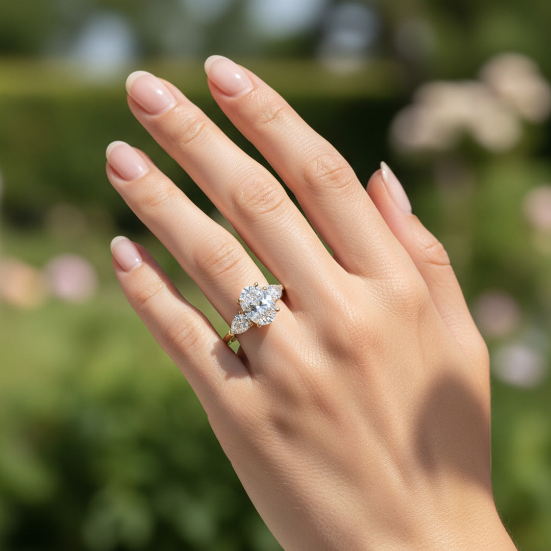 This elegant engagement ring features a luminous oval center stone accented by two pear-shaped side stones. Intricate French pavé details and a peekaboo diamond add subtle vintage sparkle. A timeless blend of classic beauty and modern sophistication.
