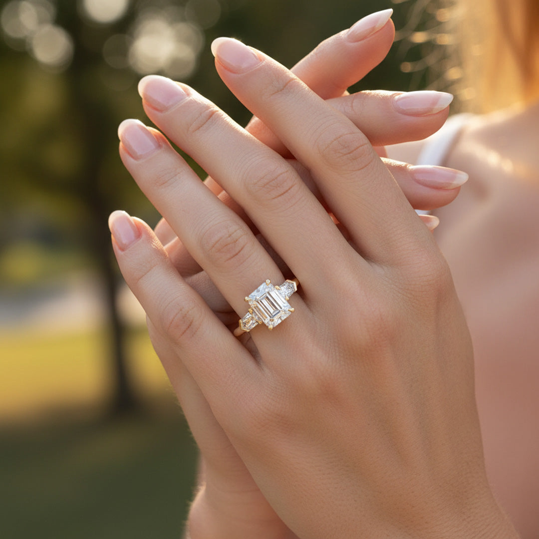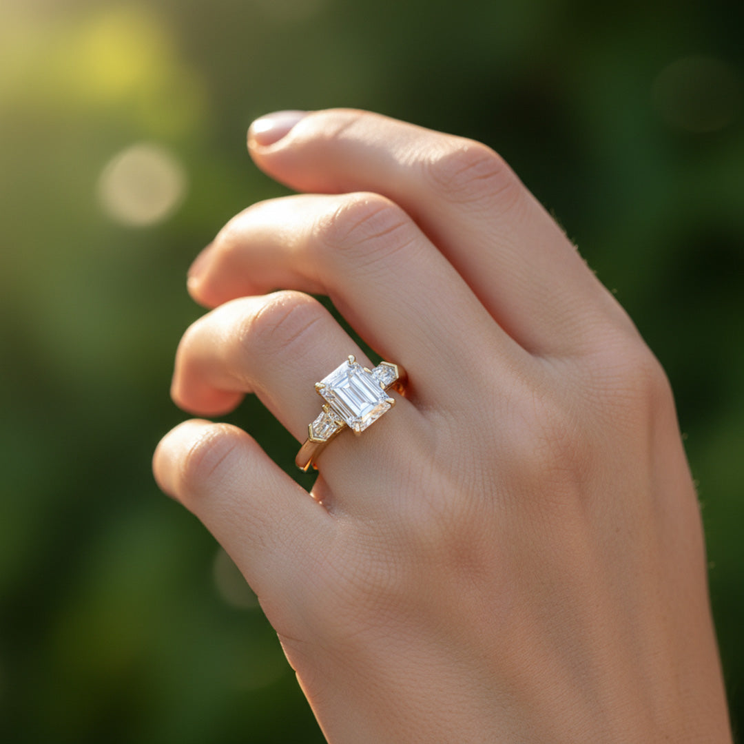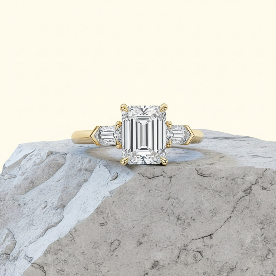 Make a statement with this emerald-cut engagement ring—bullet-shaped side diamonds and sleek lines combine classic elegance with modern sparkle.