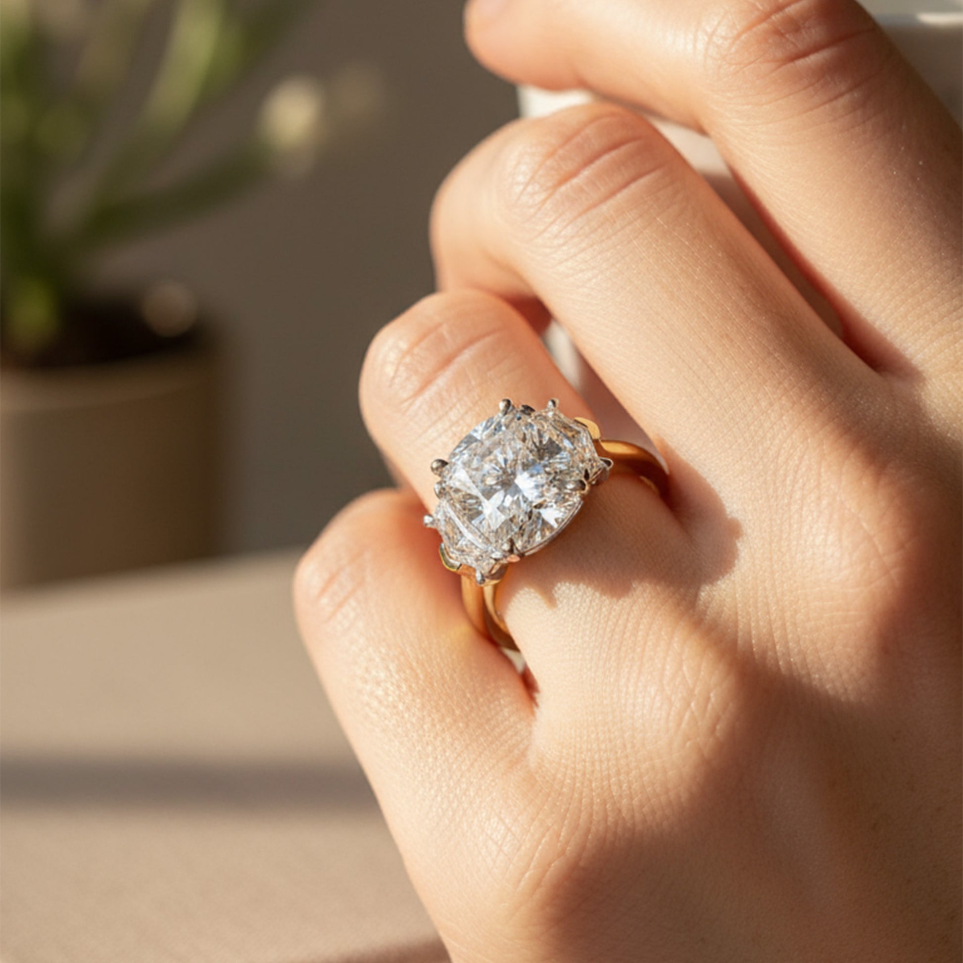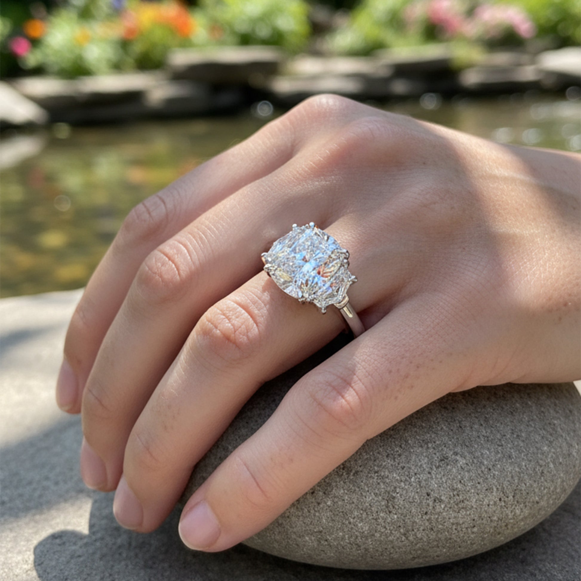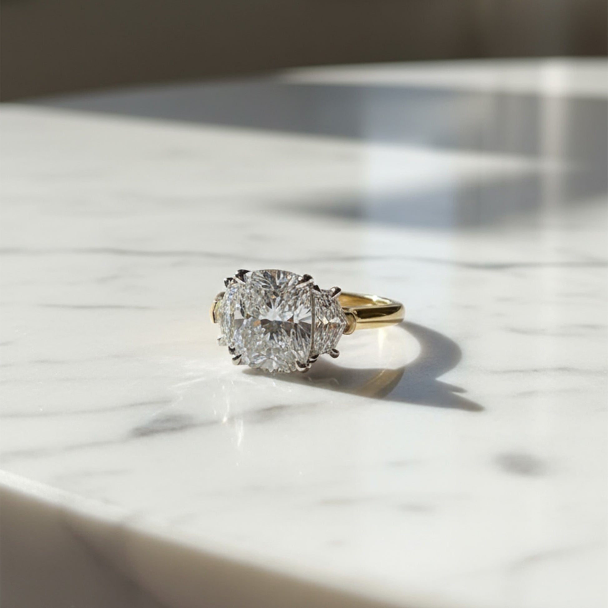 This stunning engagement ring features a captivating cushion cut center diamond, elegantly complemented by elongated Cadillac diamond side stones. The unique design combines classic sophistication with modern flair, creating a timeless piece that will dazzle for a lifetime.