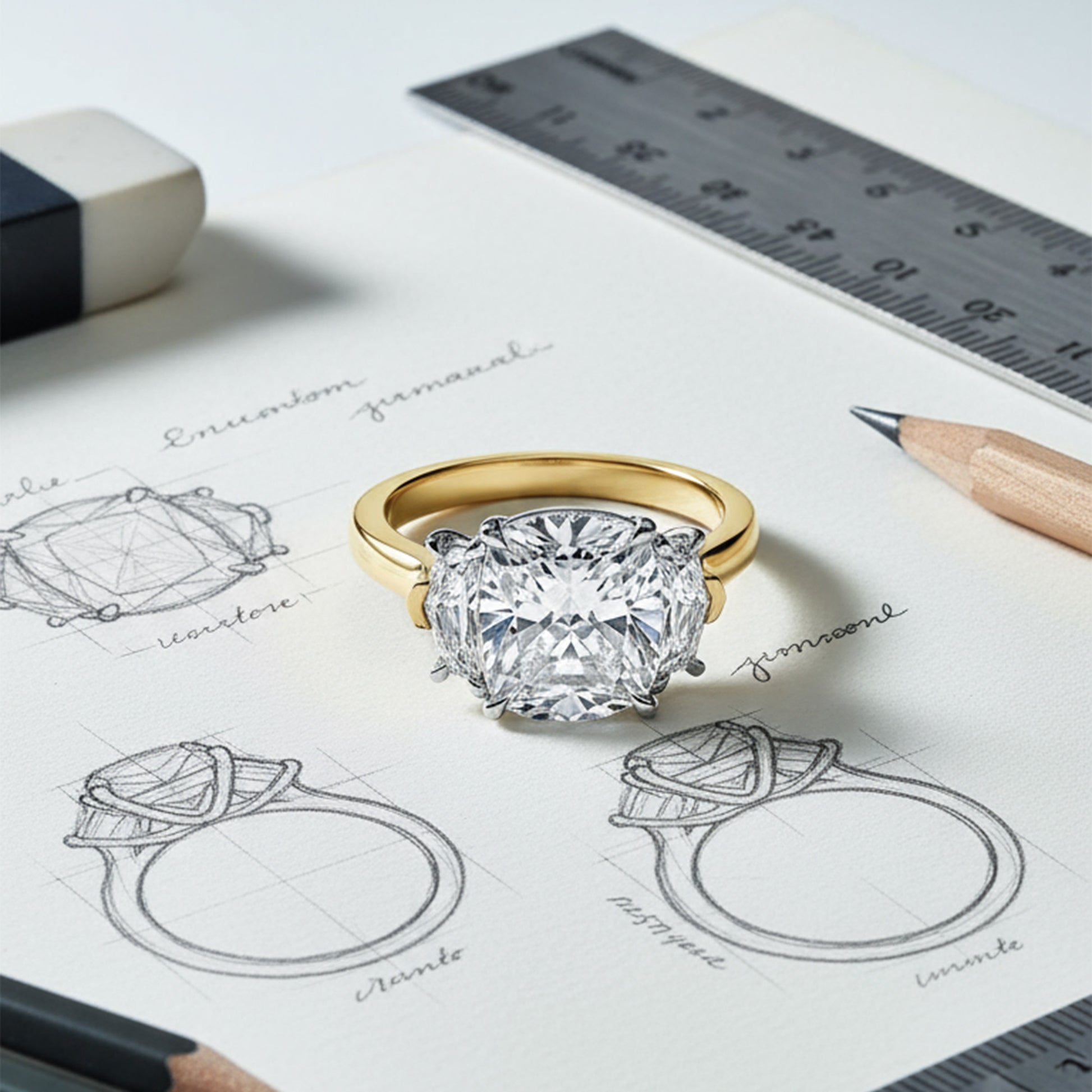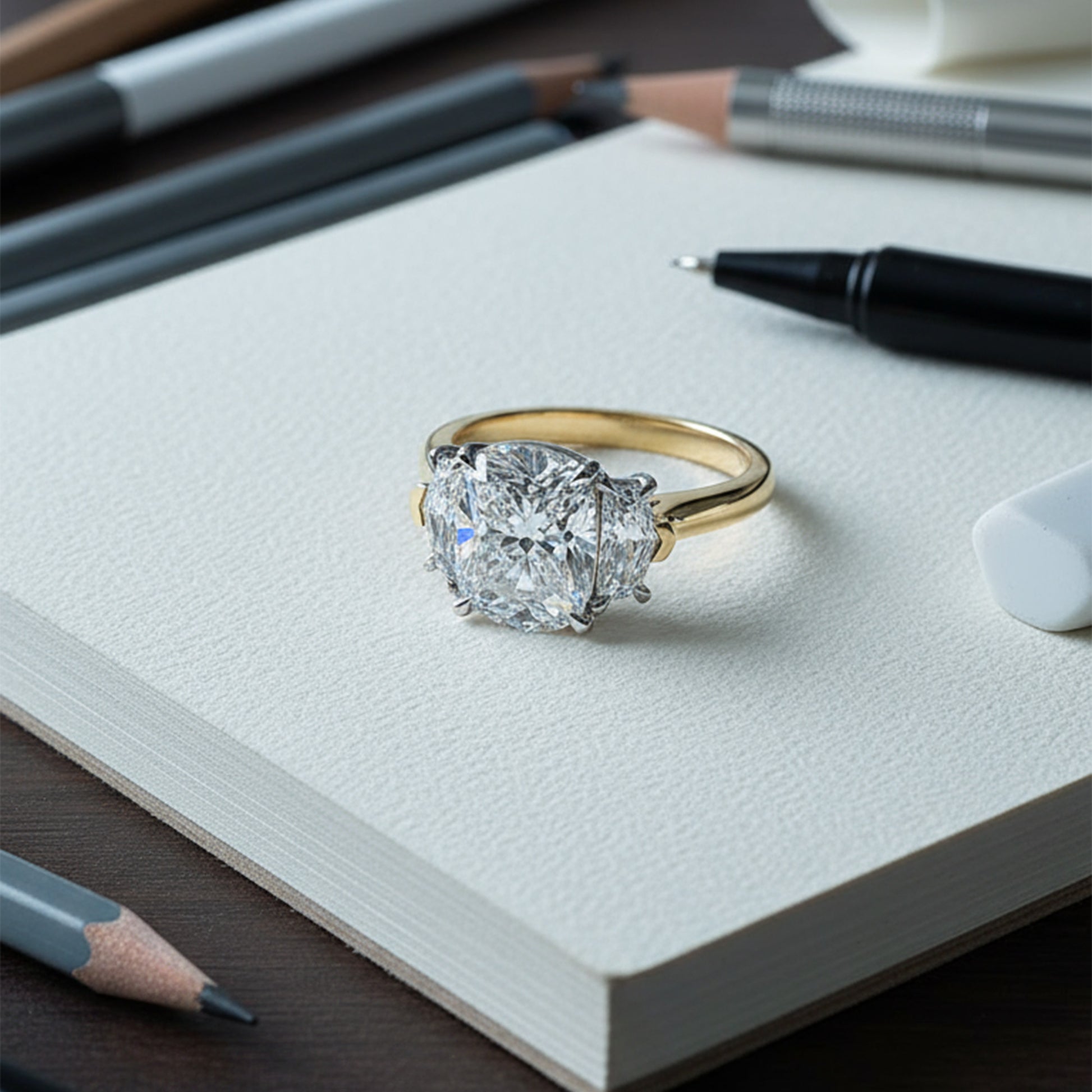 This stunning engagement ring features a captivating cushion cut center diamond, elegantly complemented by elongated Cadillac diamond side stones. The unique design combines classic sophistication with modern flair, creating a timeless piece that will dazzle for a lifetime.