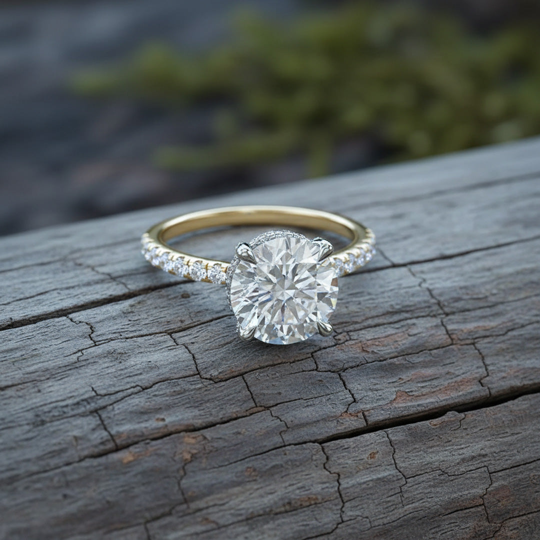 This French pavé engagement ring features a dazzling center diamond with a radiant underhalo and diamond-encrusted prongs. The pavé band adds extra brilliance, creating a refined, timeless design.