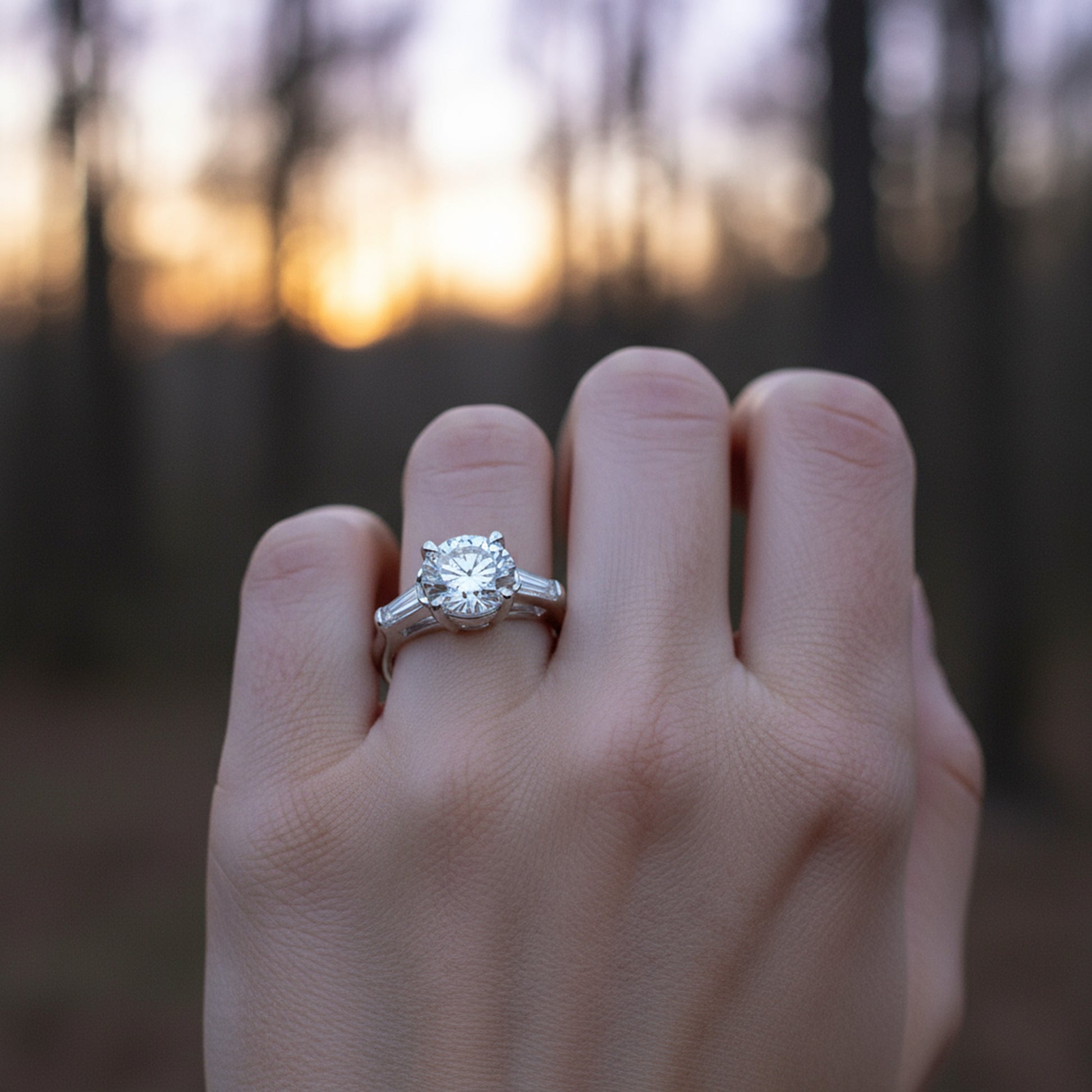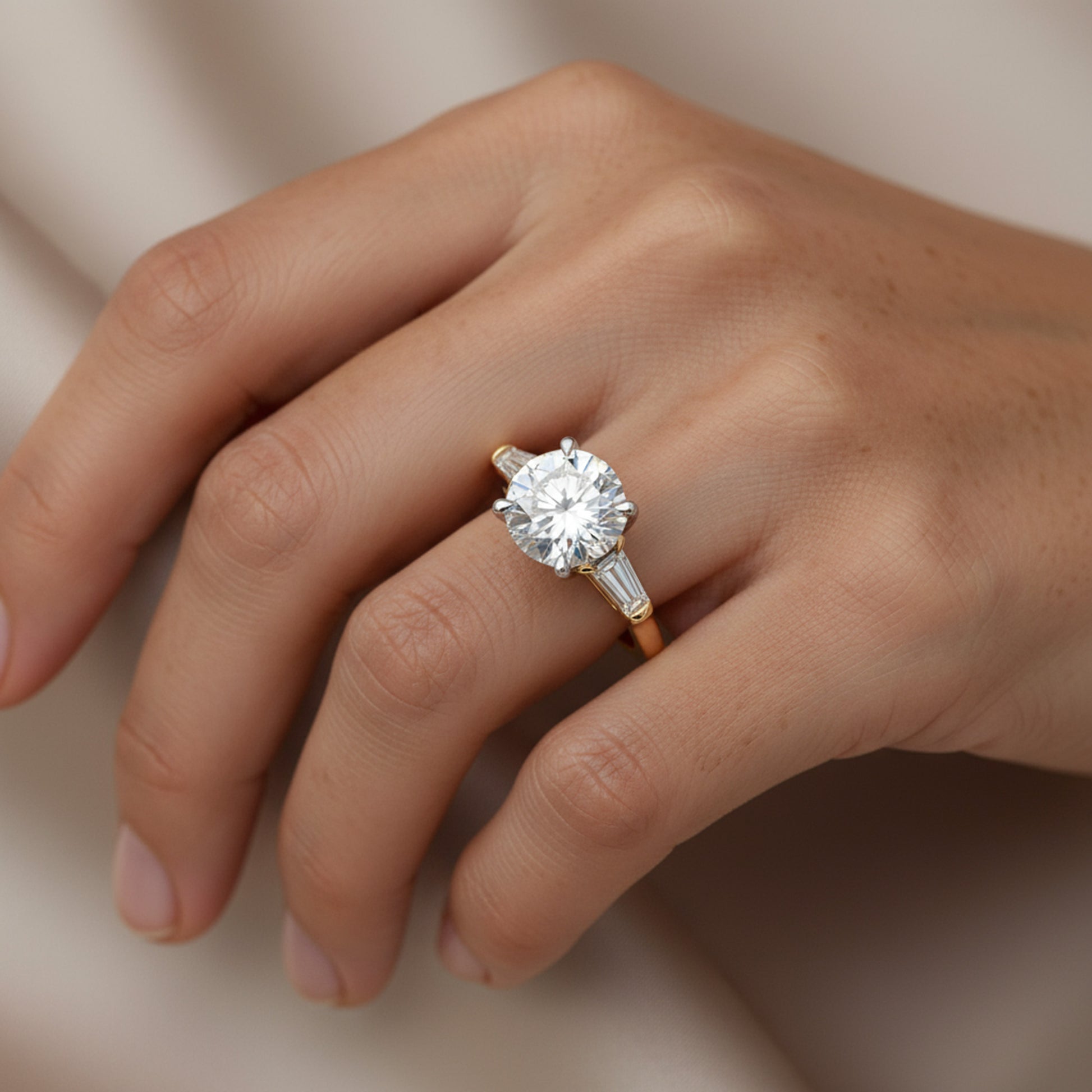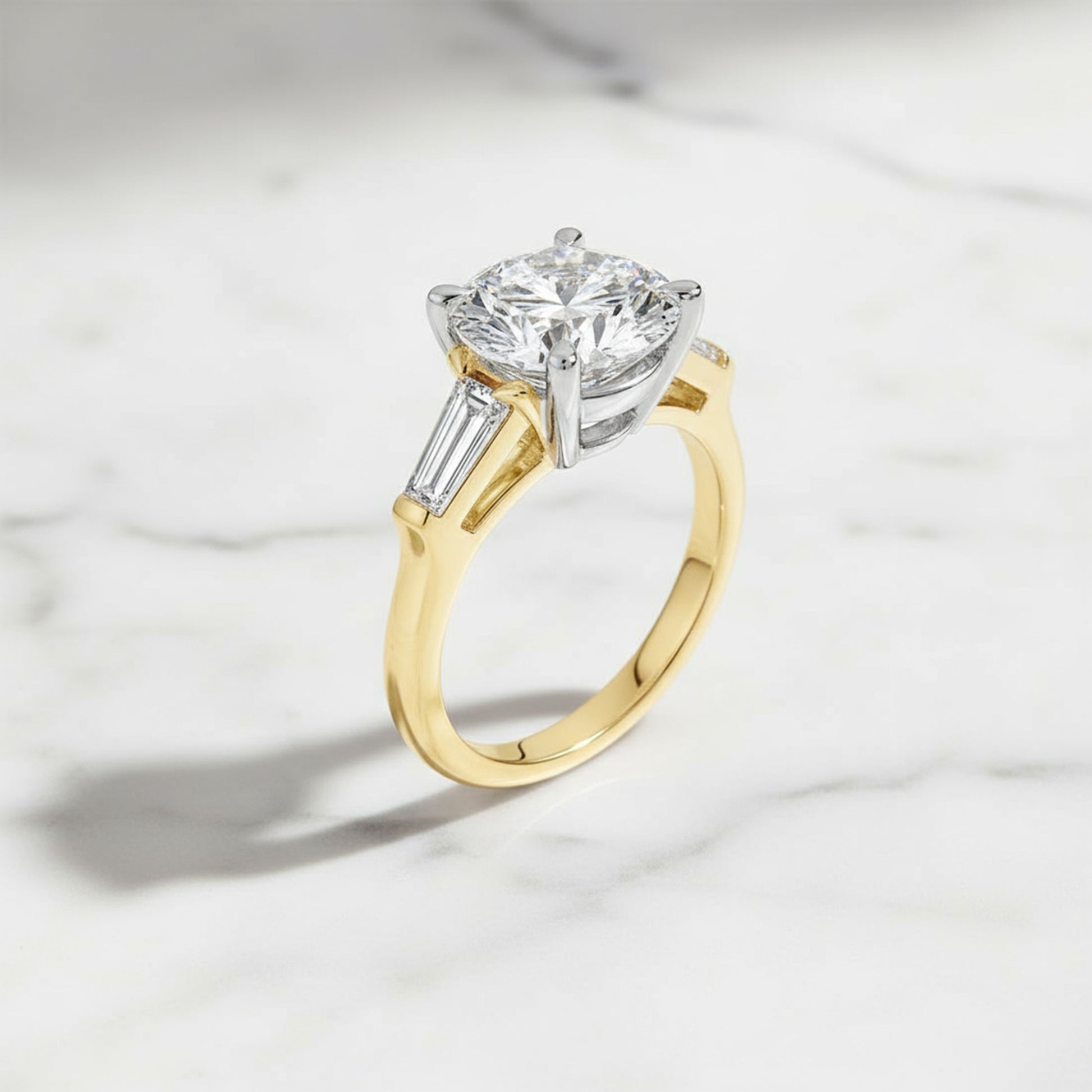 This elegant engagement ring features a brilliant round center diamond, complemented by two sleek baguette side stones for a touch of timeless sophistication. The clean lines and refined design highlight the central diamond’s sparkle while the baguettes add a unique, contemporary flair. A perfect choice for those seeking a blend of classic beauty and modern style.