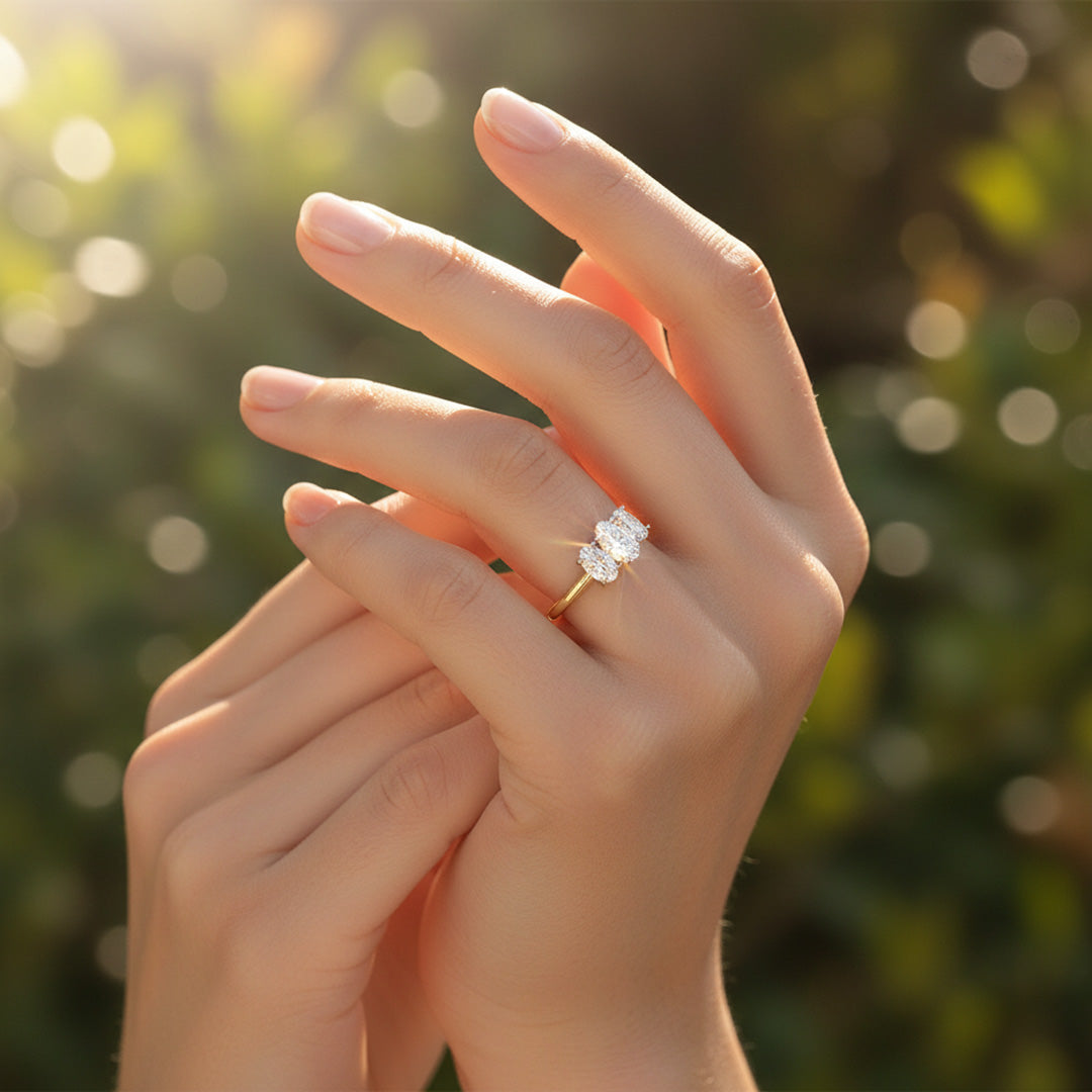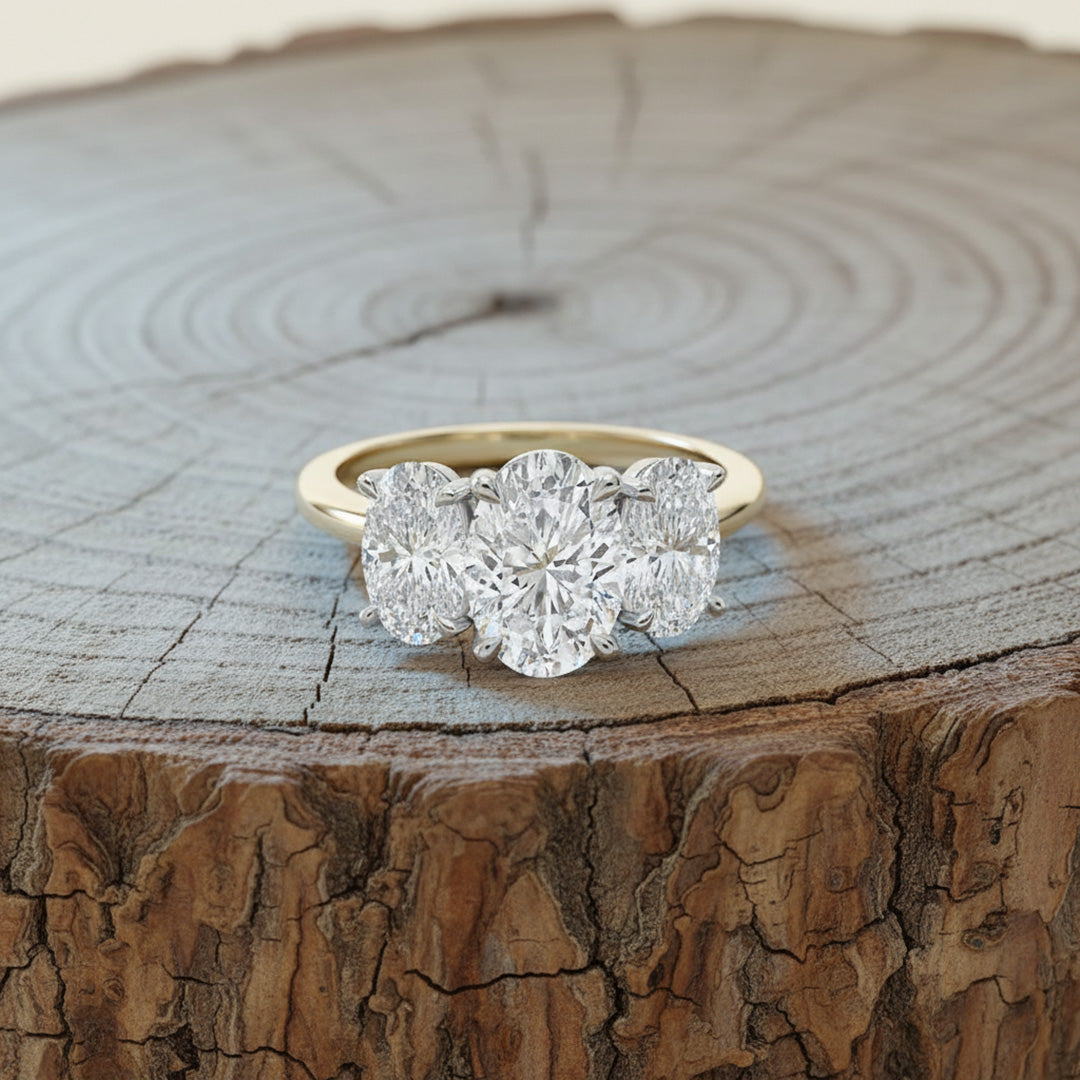 This elegant three-stone ring features a brilliant oval center diamond framed by two matching oval side stones. The classic setting highlights their sparkle and symbolizes your past, present, and future—a timeless design with modern grace.