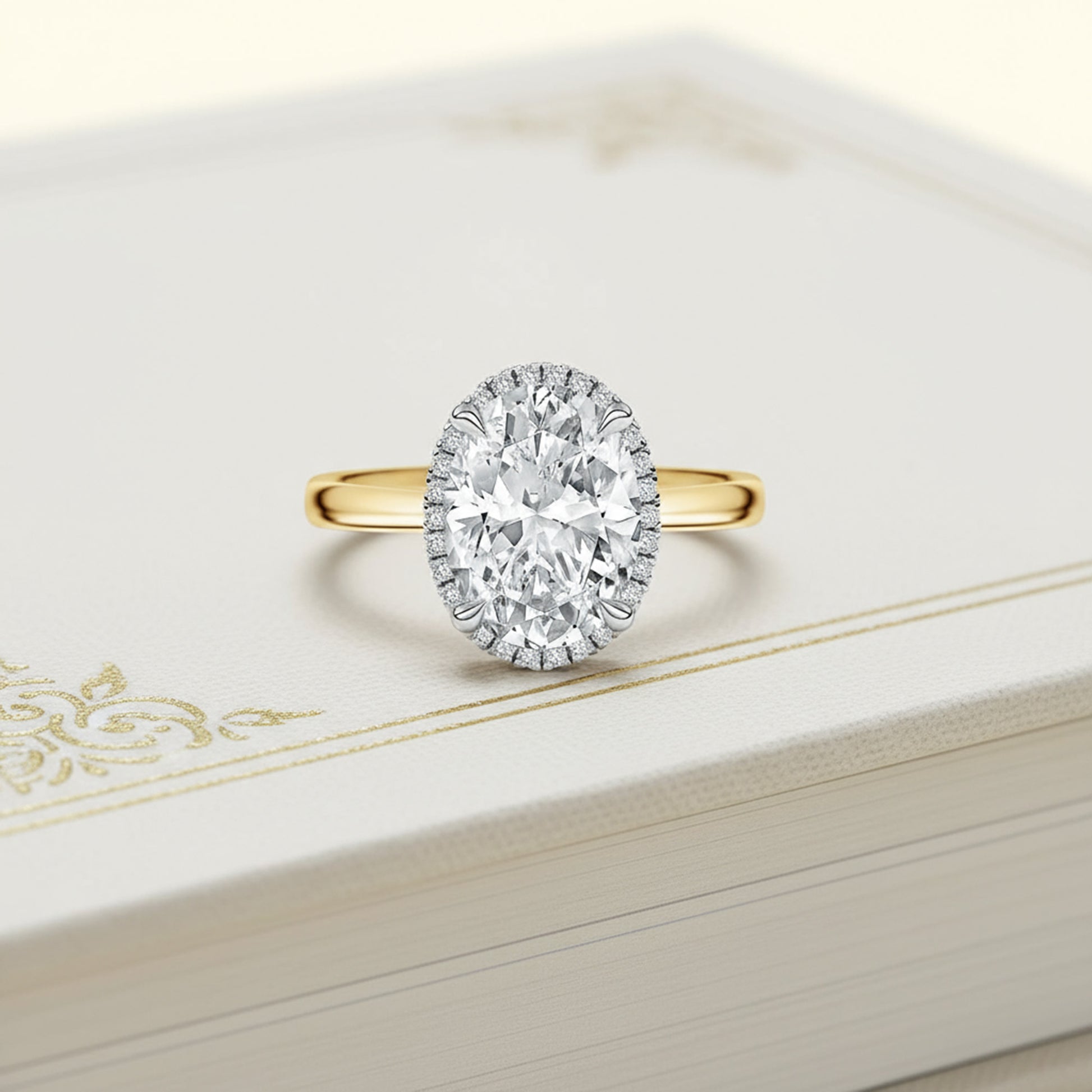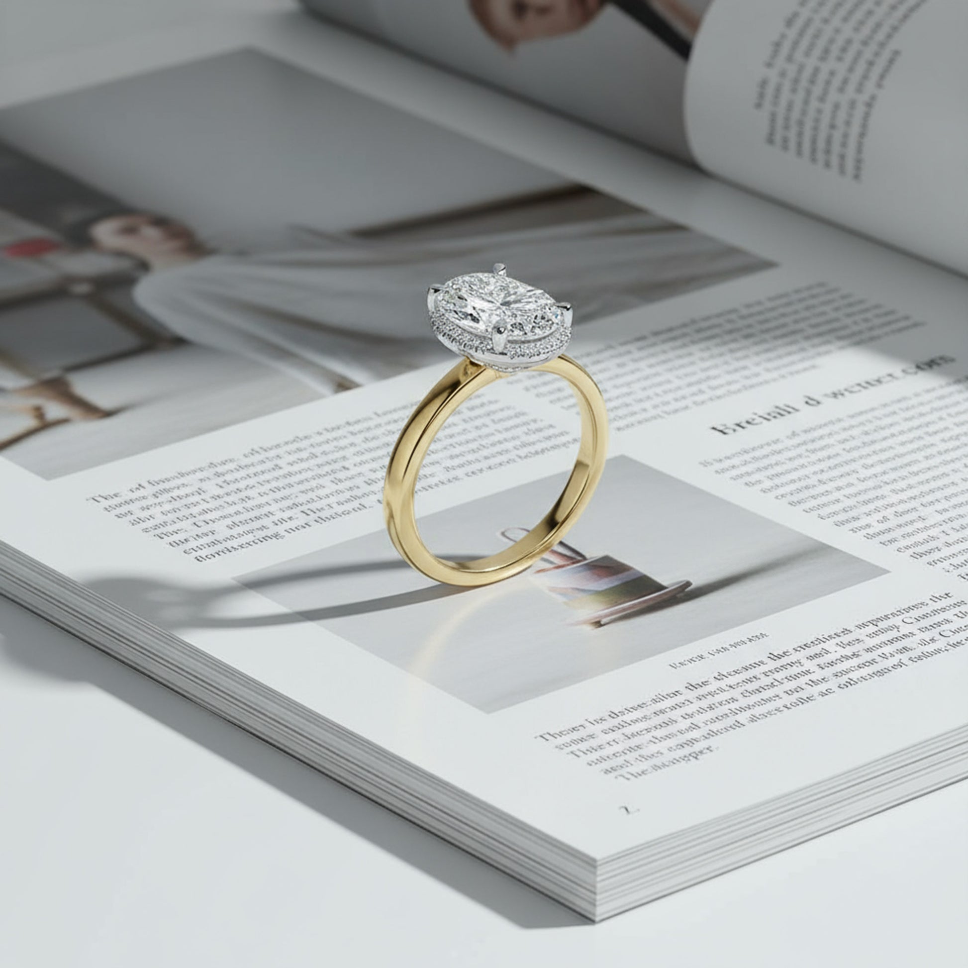 This stunning 14K two-tone gold ring features a striking oval center stone surrounded by an elevated halo of brilliant diamonds. The combination of yellow and white gold creates a timeless, elegant contrast, making it the perfect symbol of sophistication and style.