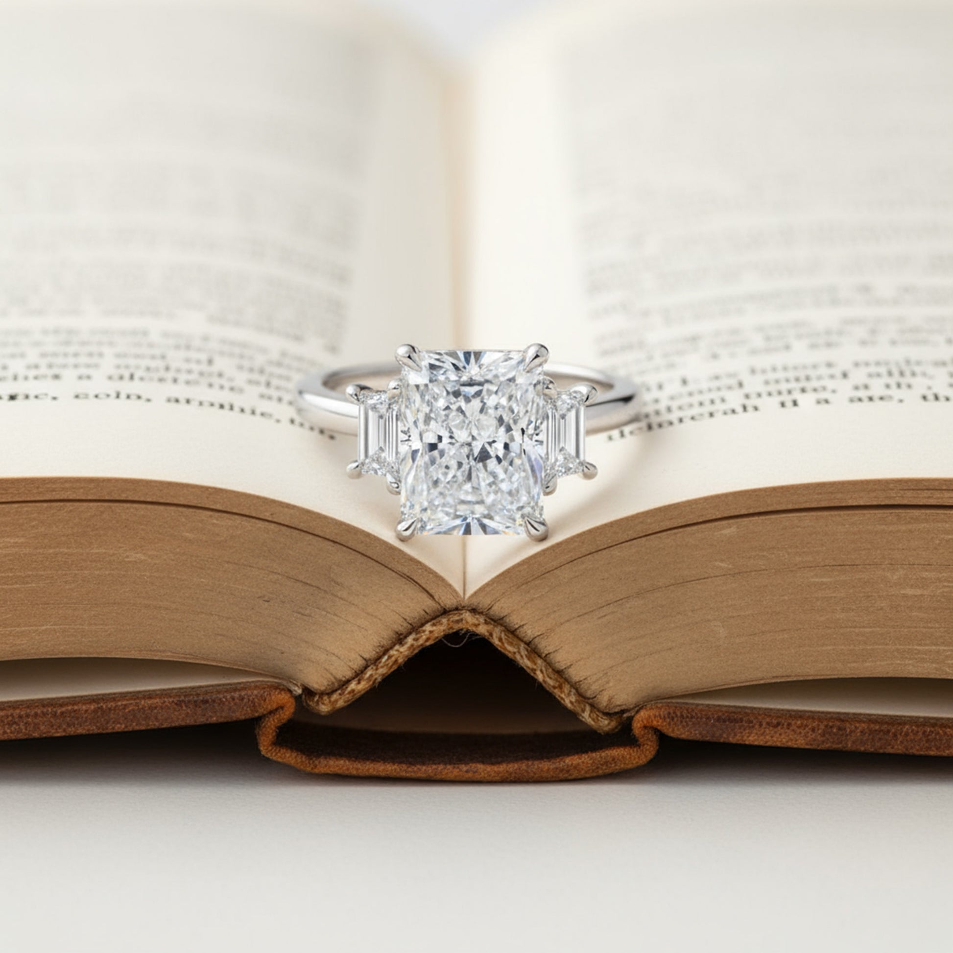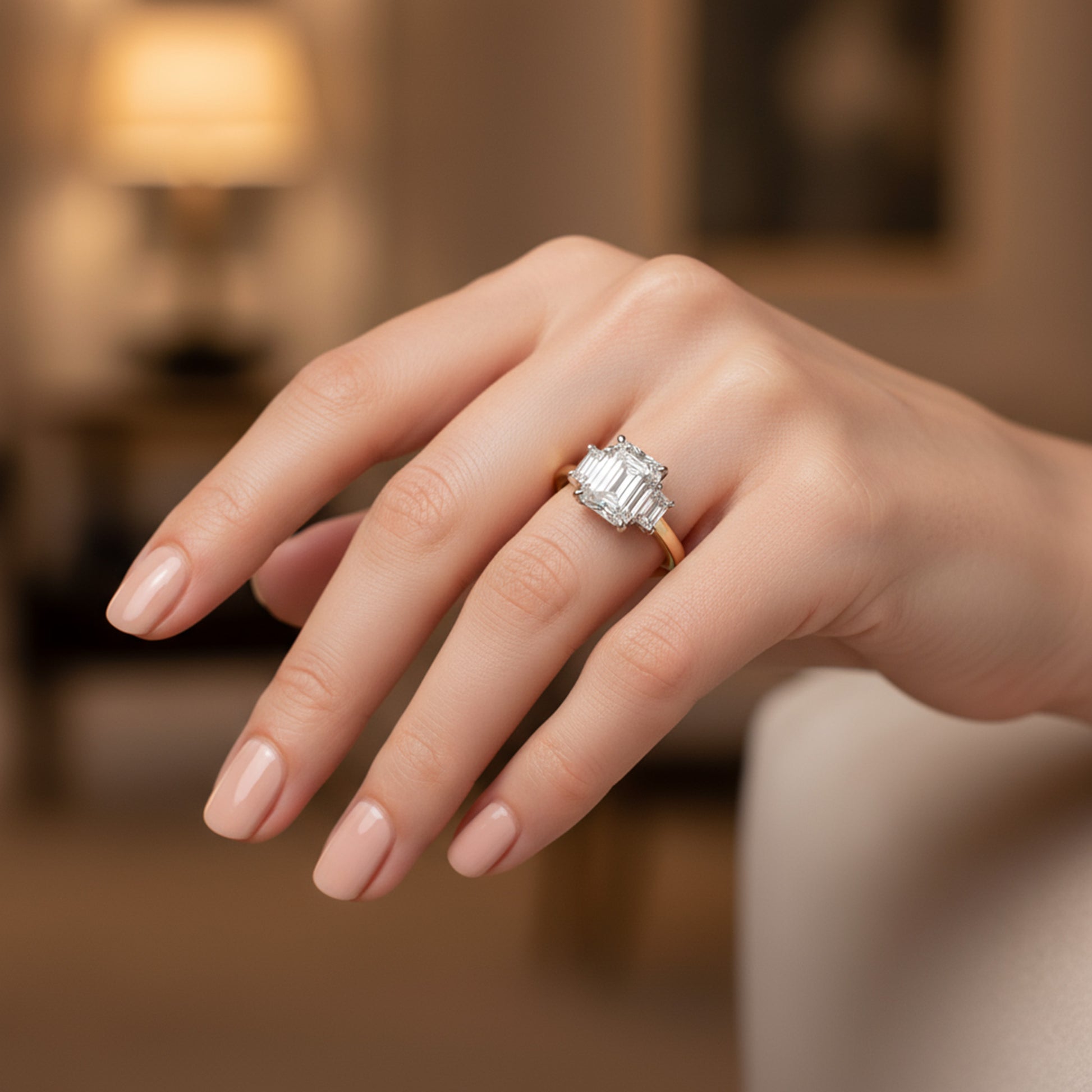 This exquisite engagement ring showcases a striking emerald-cut center diamond, flanked by two elegant trapezoid side stones. The sleek, geometric design enhances the center stone’s clarity and brilliance, while the trapezoids add a modern, sophisticated touch. A perfect choice for those who appreciate timeless elegance with a contemporary edge.