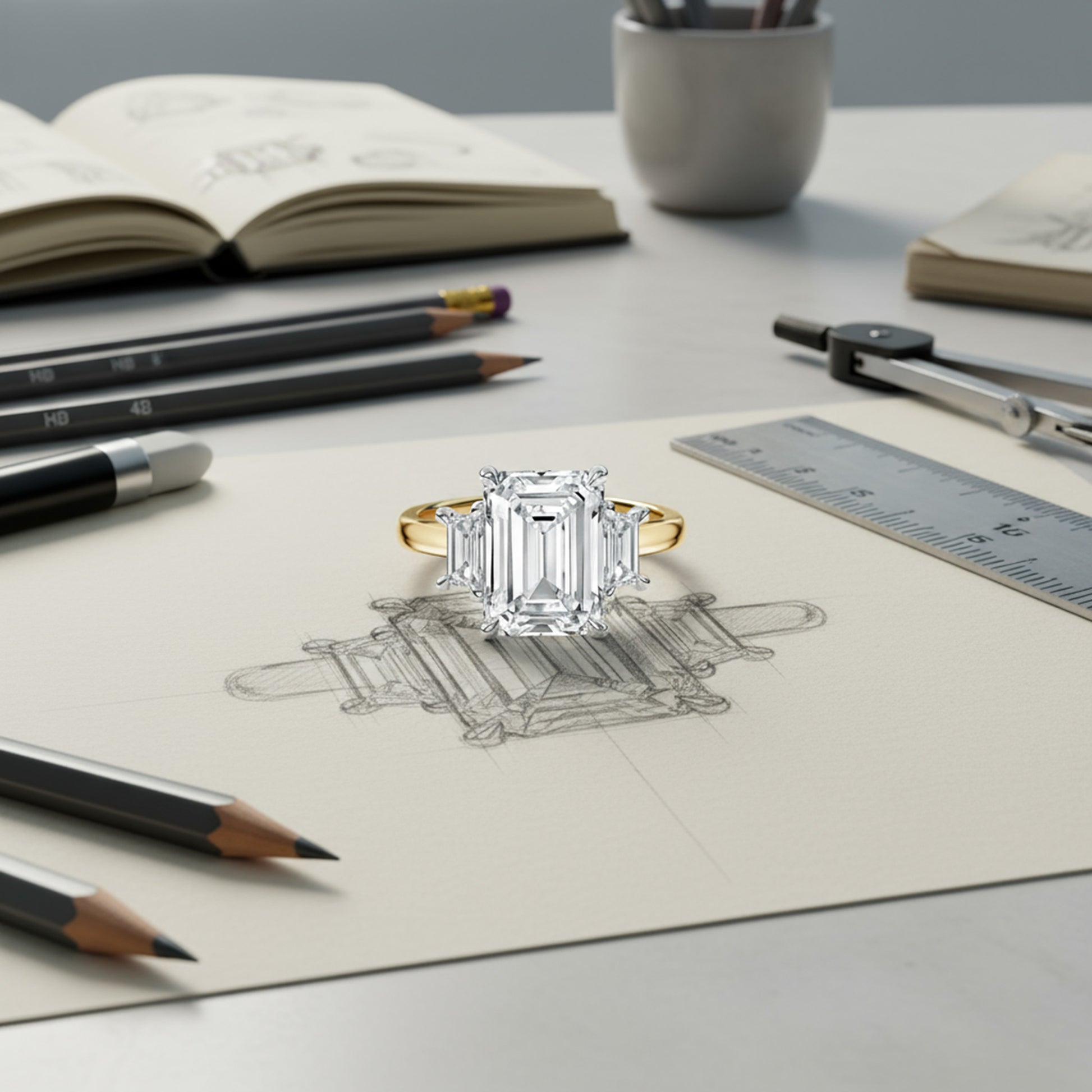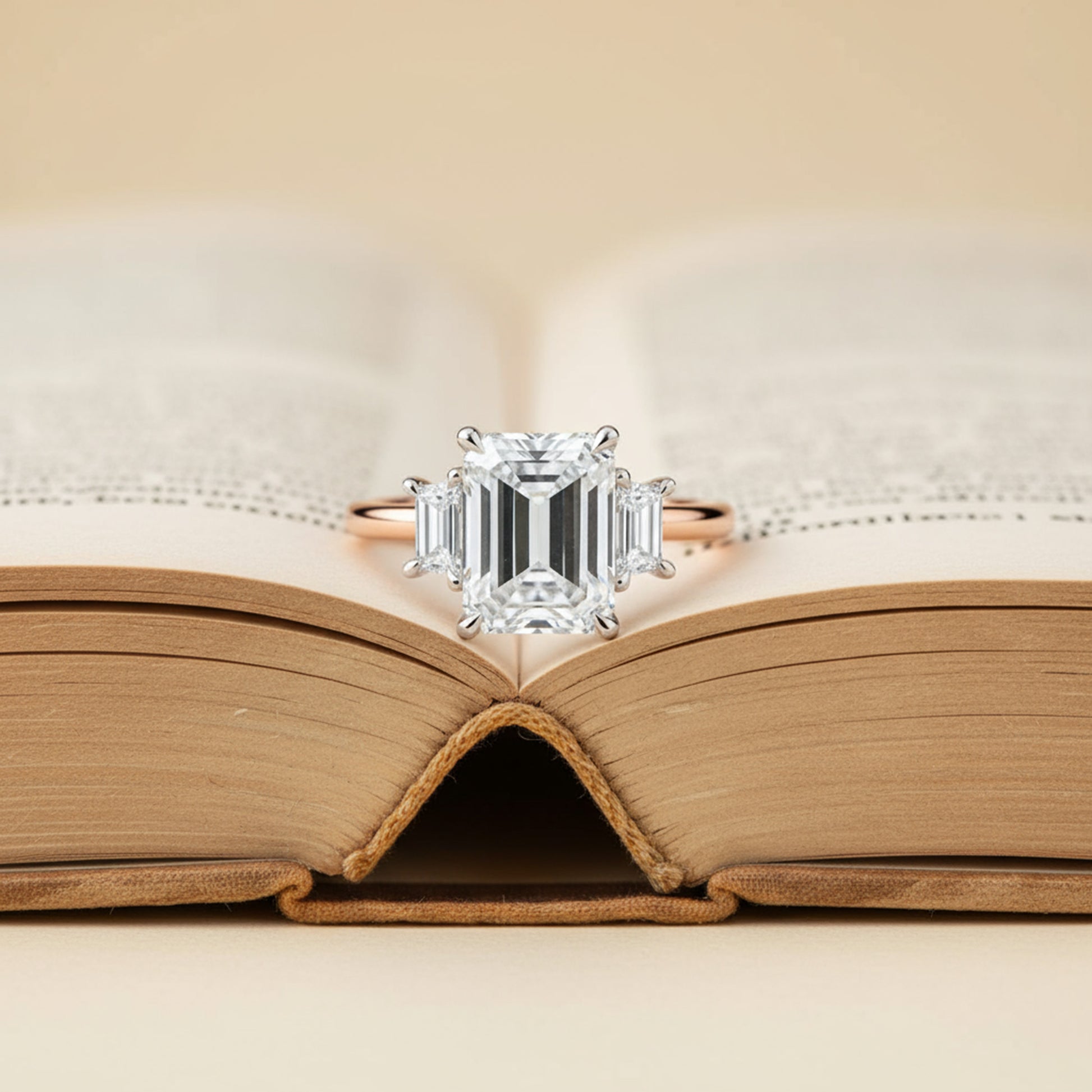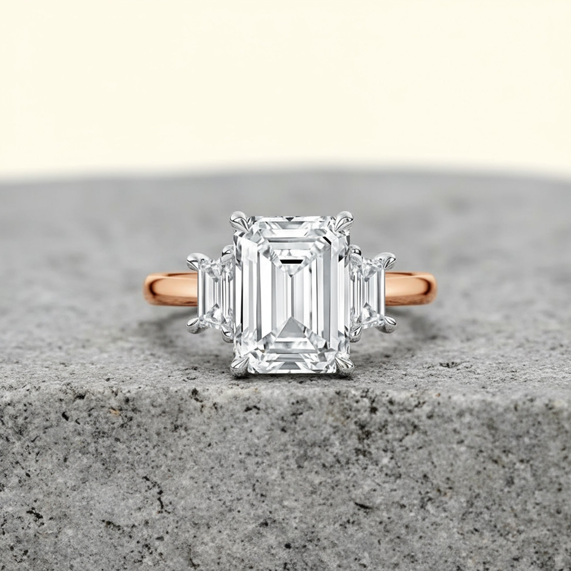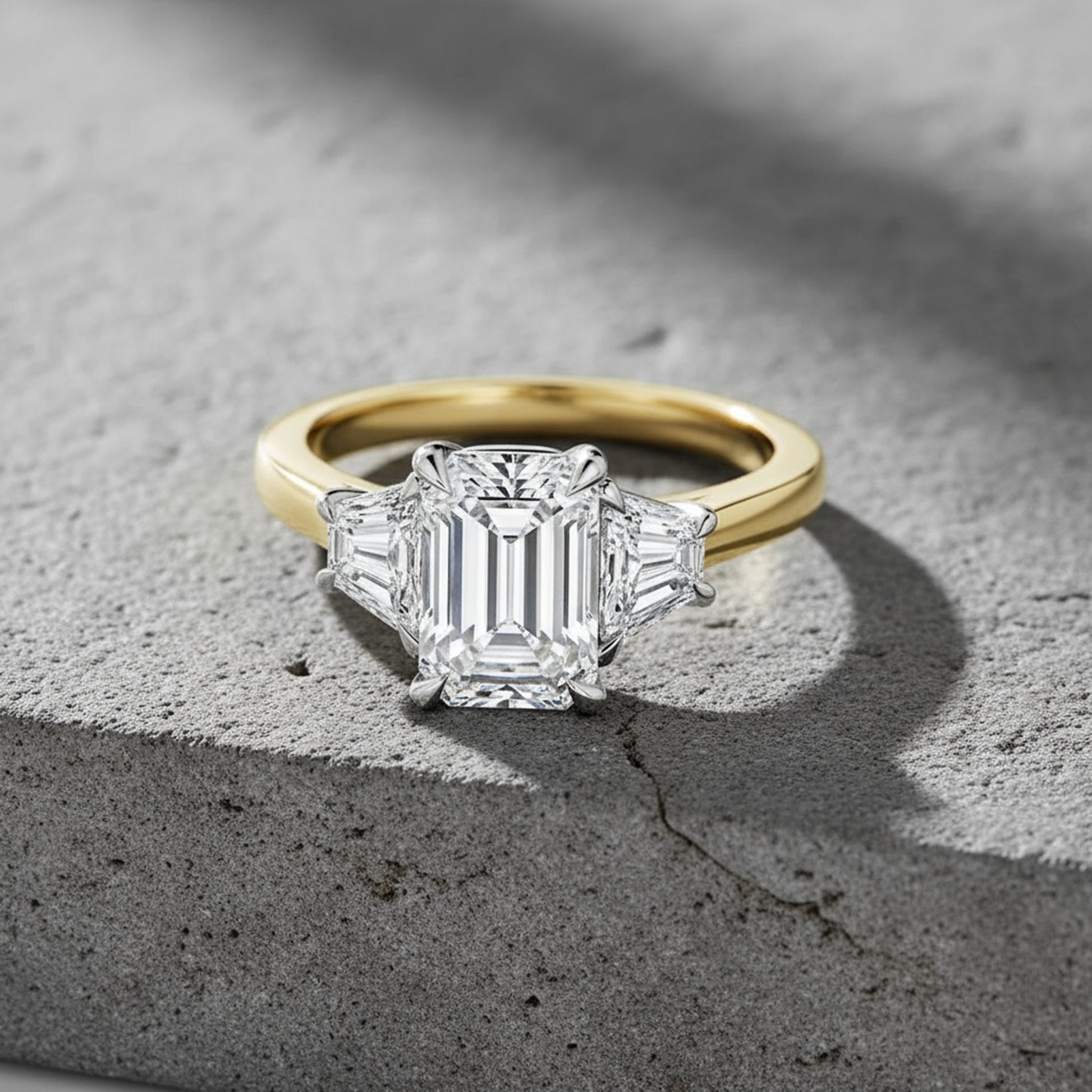 This exquisite engagement ring showcases a striking emerald-cut center diamond, flanked by two elegant trapezoid side stones. The sleek, geometric design enhances the center stone’s clarity and brilliance, while the trapezoids add a modern, sophisticated touch. A perfect choice for those who appreciate timeless elegance with a contemporary edge.