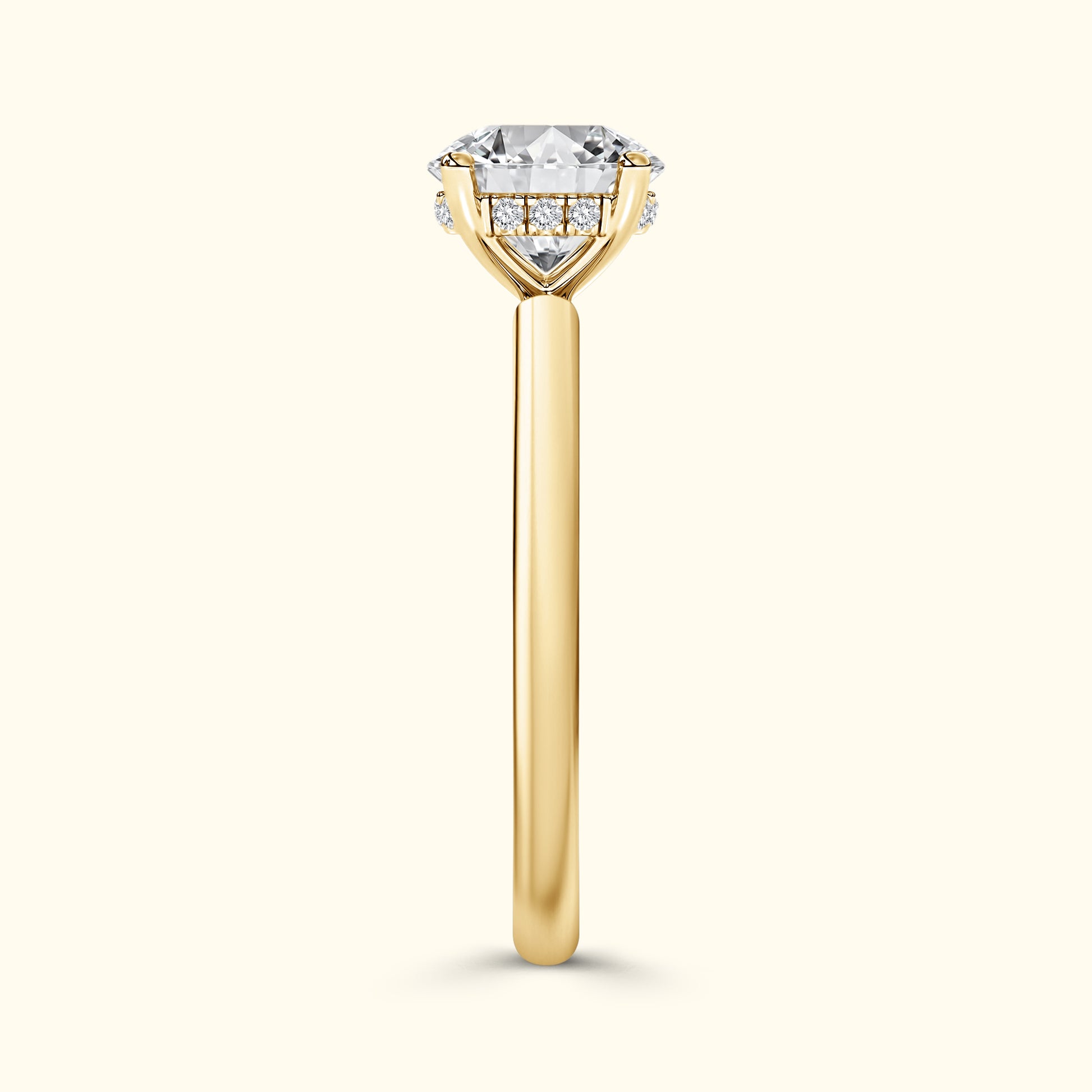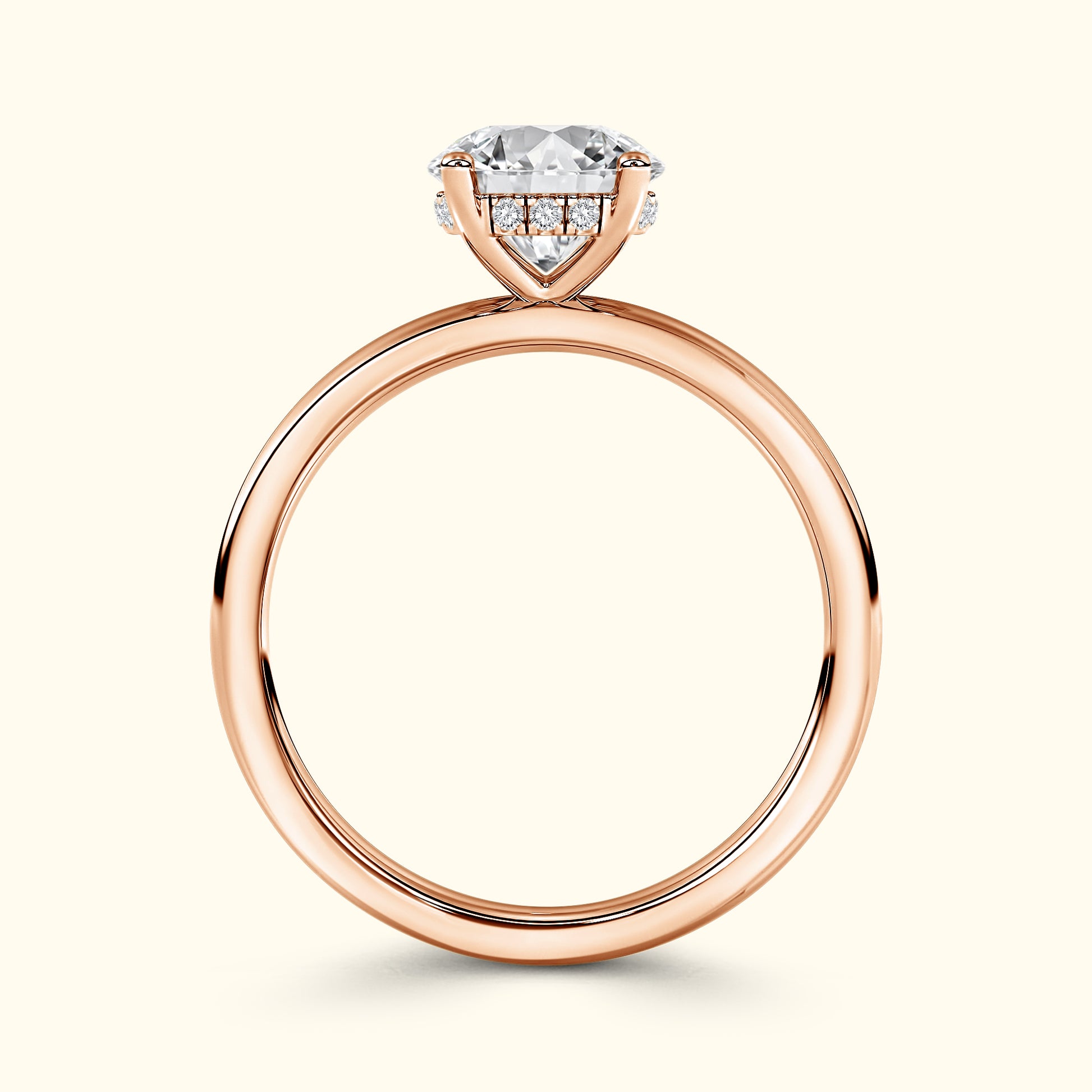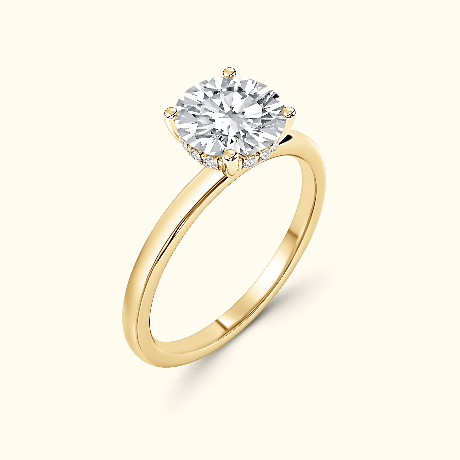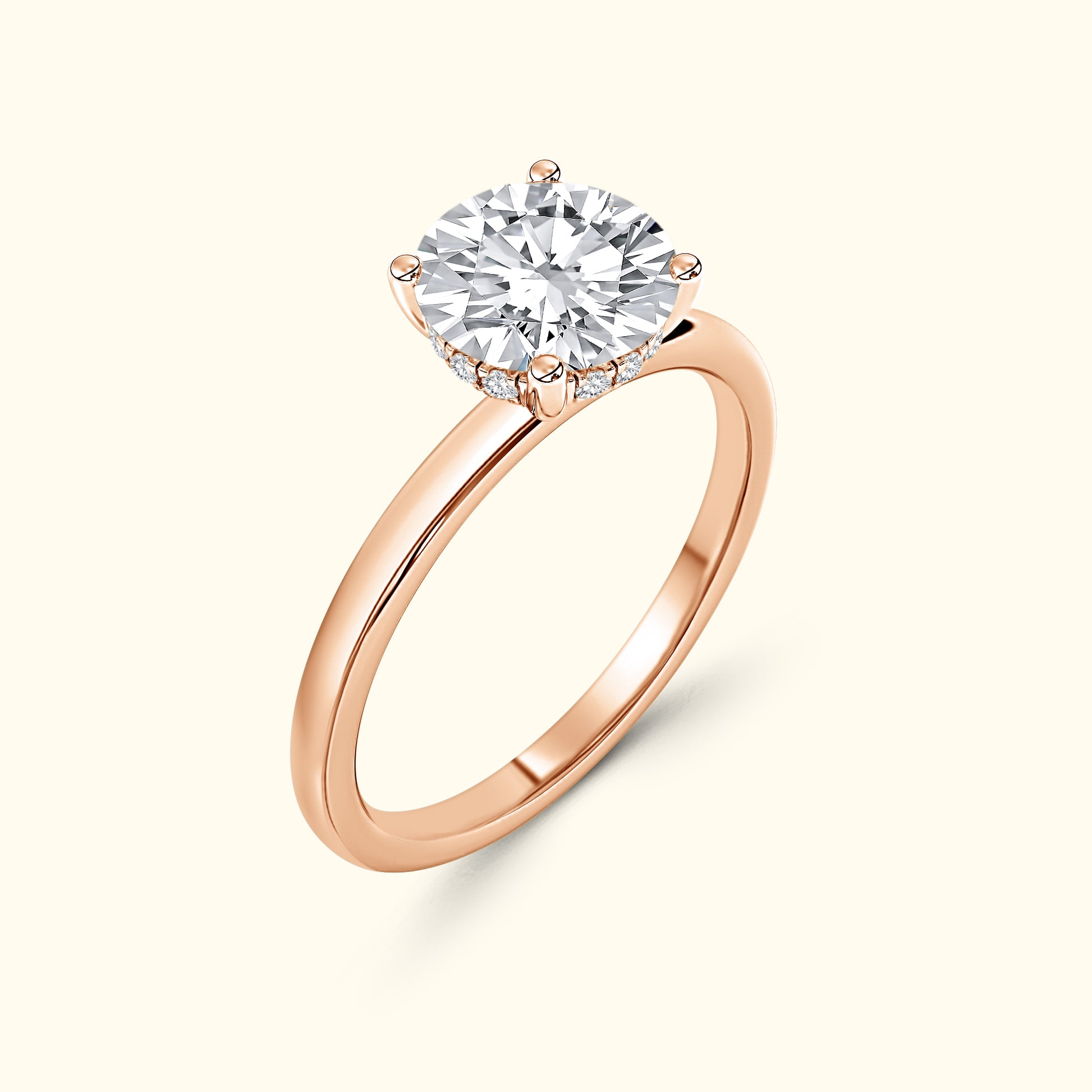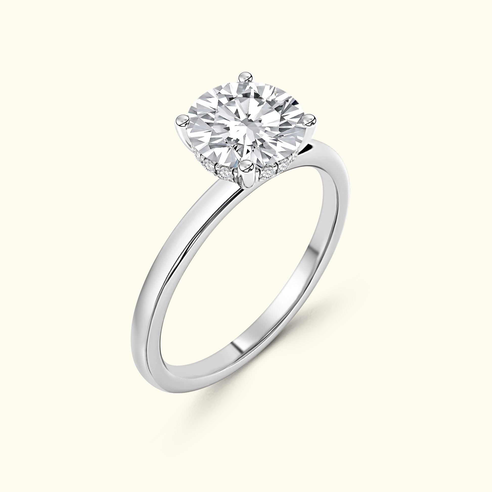 A modern take on timeless elegance. This ring features a brilliant round center diamond gracefully set atop a sleek solitaire band, offering a clean and sophisticated look. Beneath the center stone lies a delicate underhalo — a hidden circle of sparkle that catches the light with every movement. Simple yet captivating, this design embodies effortless beauty and enduring romance.