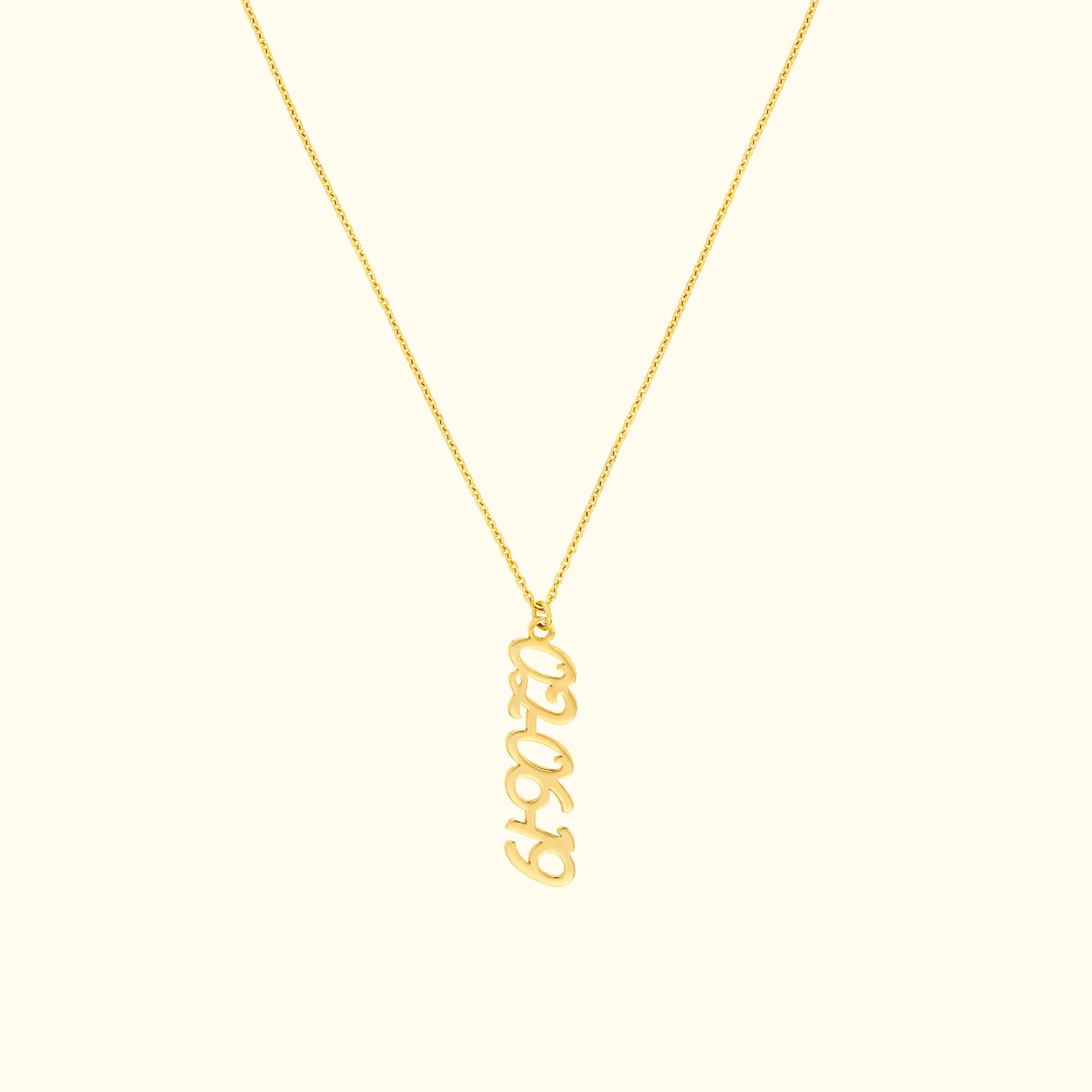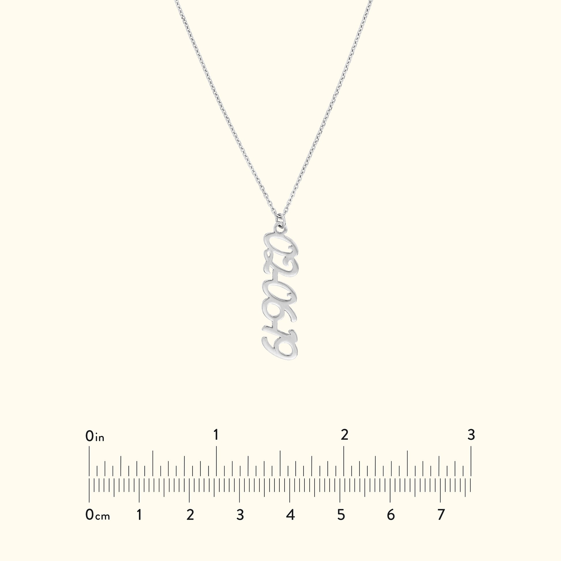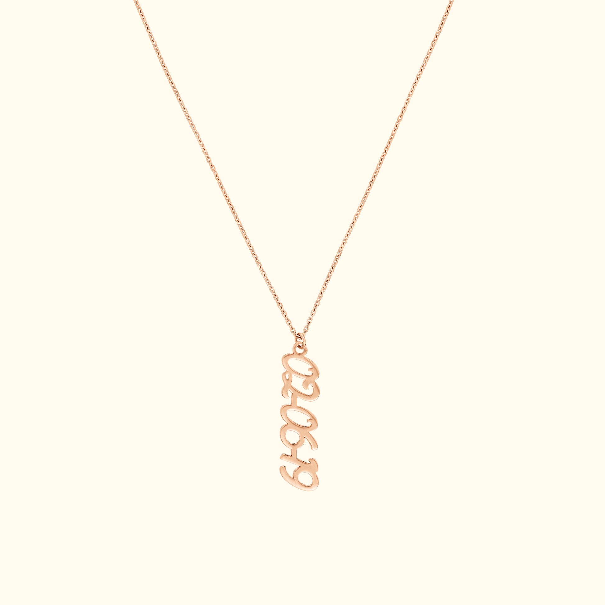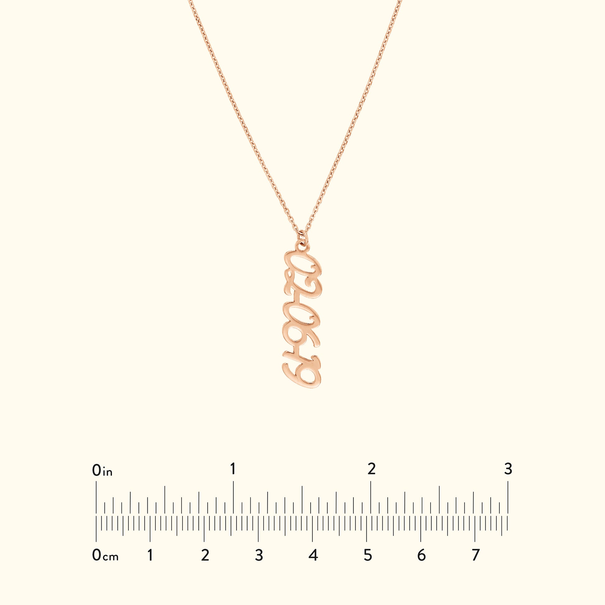 Use numerals to create meaning with this vertical script pendant. The necklace measures 7mm wide. Available in 14K yellow, white, and rose gold.