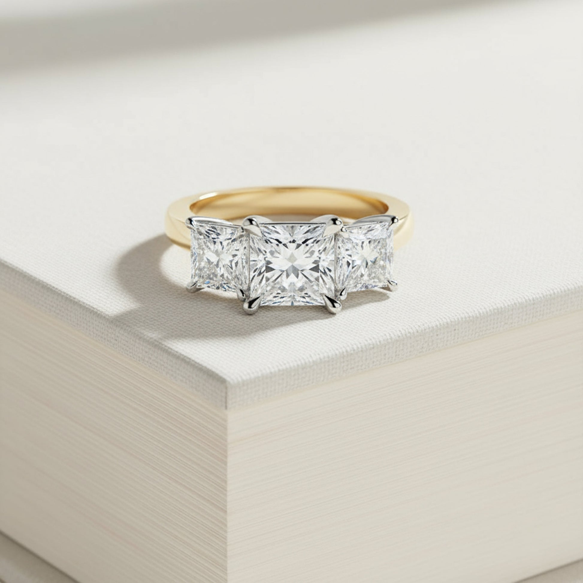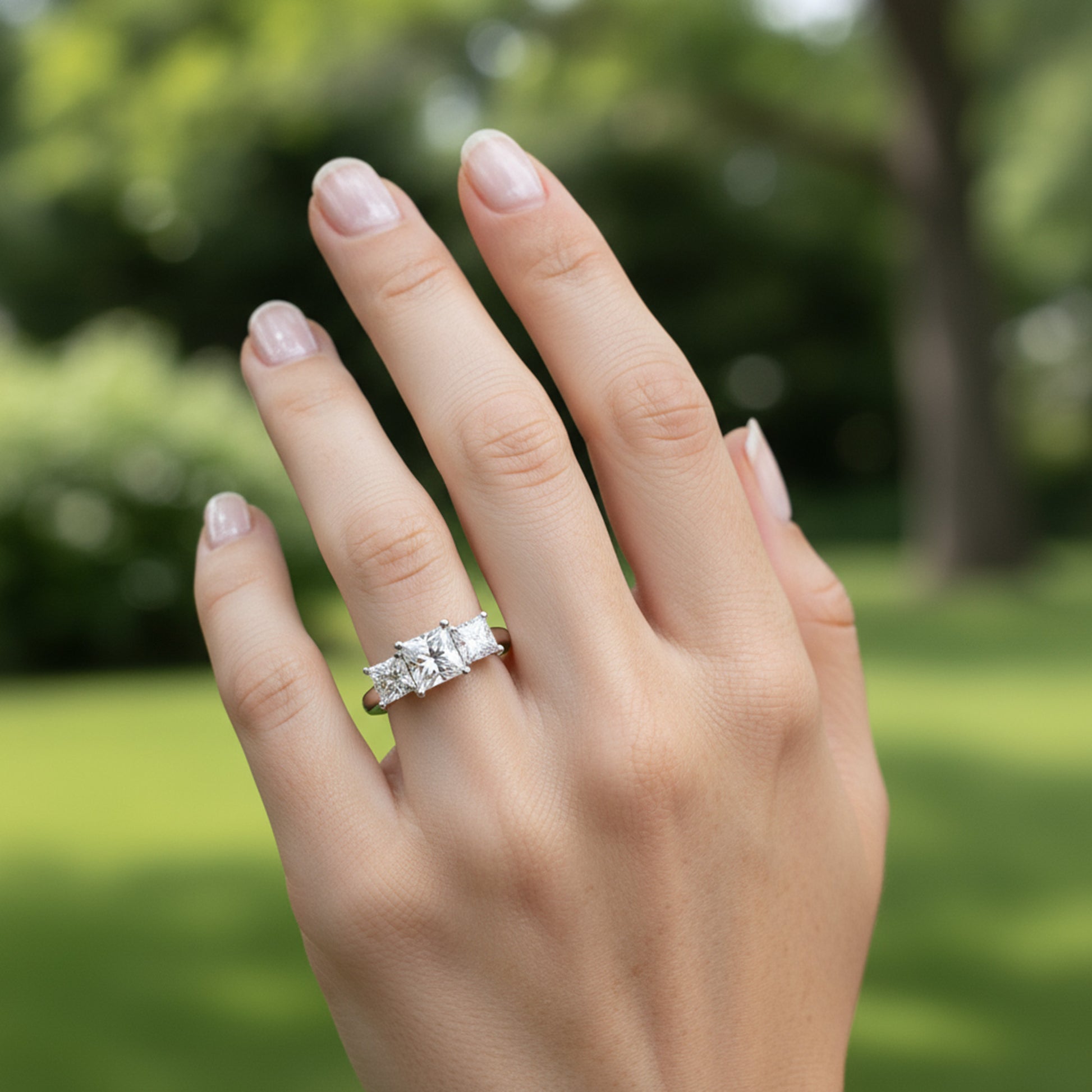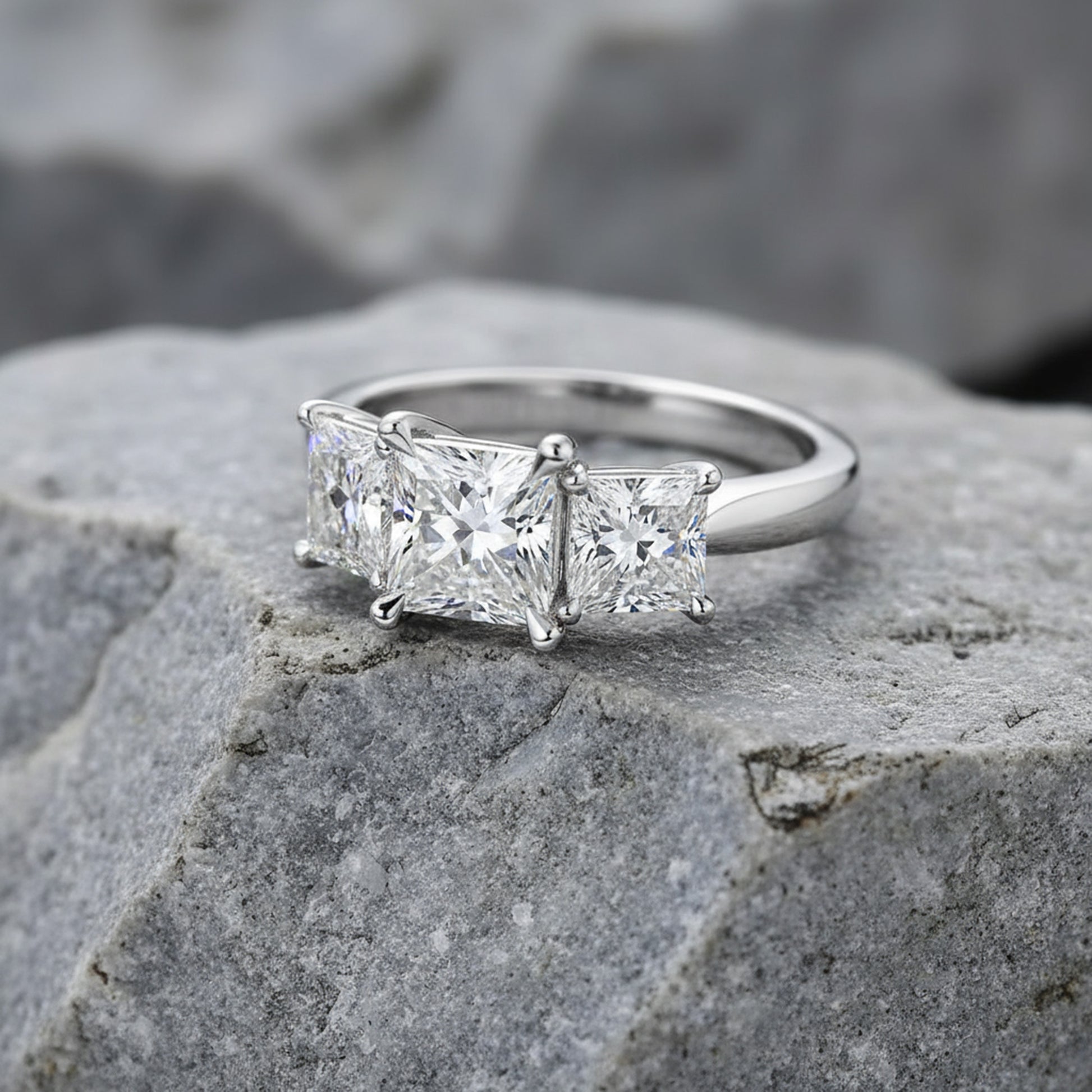 Celebrate your love with this stunning three-stone engagement ring, showcasing a trio of brilliant princess-cut diamonds. The bold center stone is perfectly complemented by two matching side stones, creating a harmonious balance of sparkle and symmetry. Expertly set in a sleek, polished band, this ring radiates elegance from every angle—perfect for marking a moment you'll never forget.