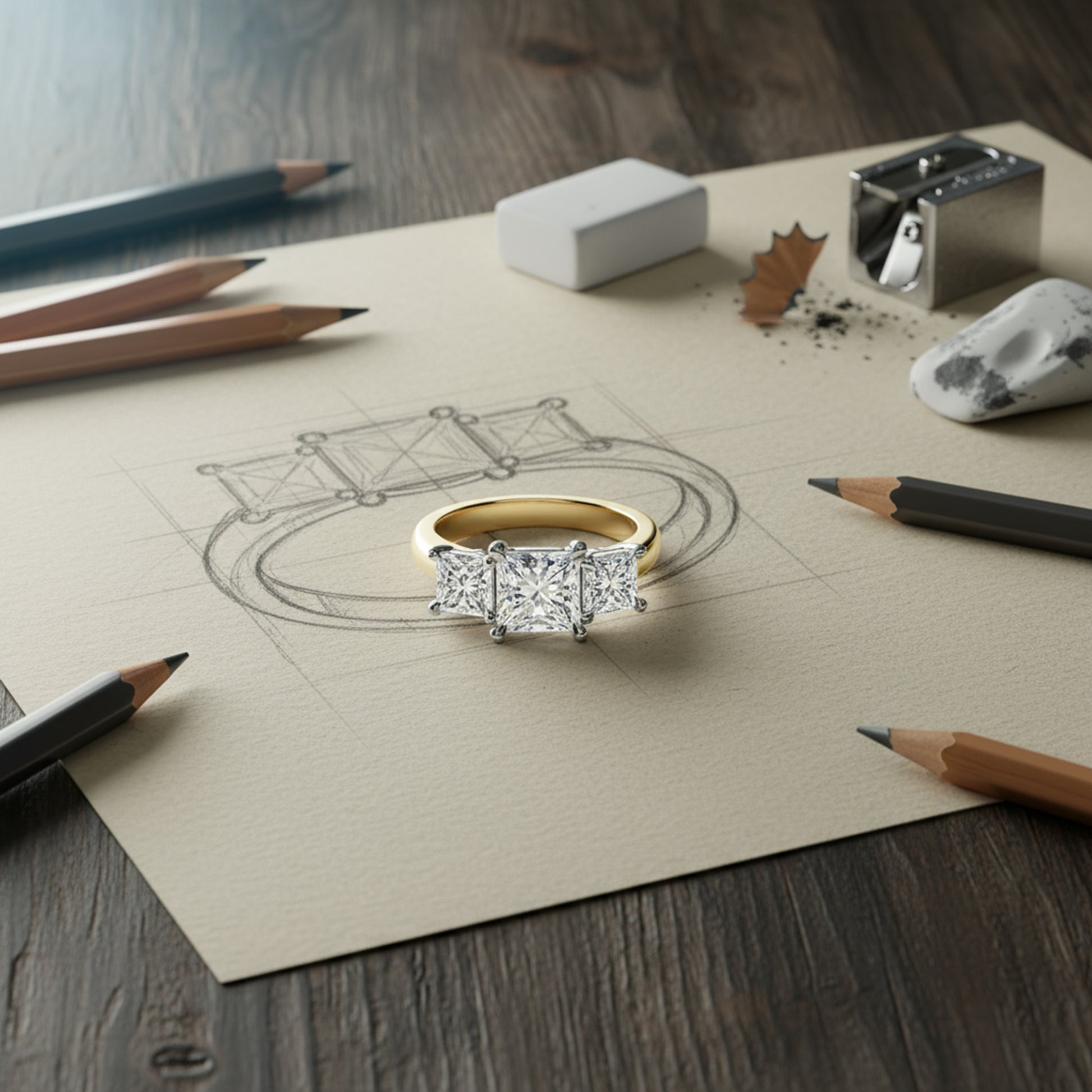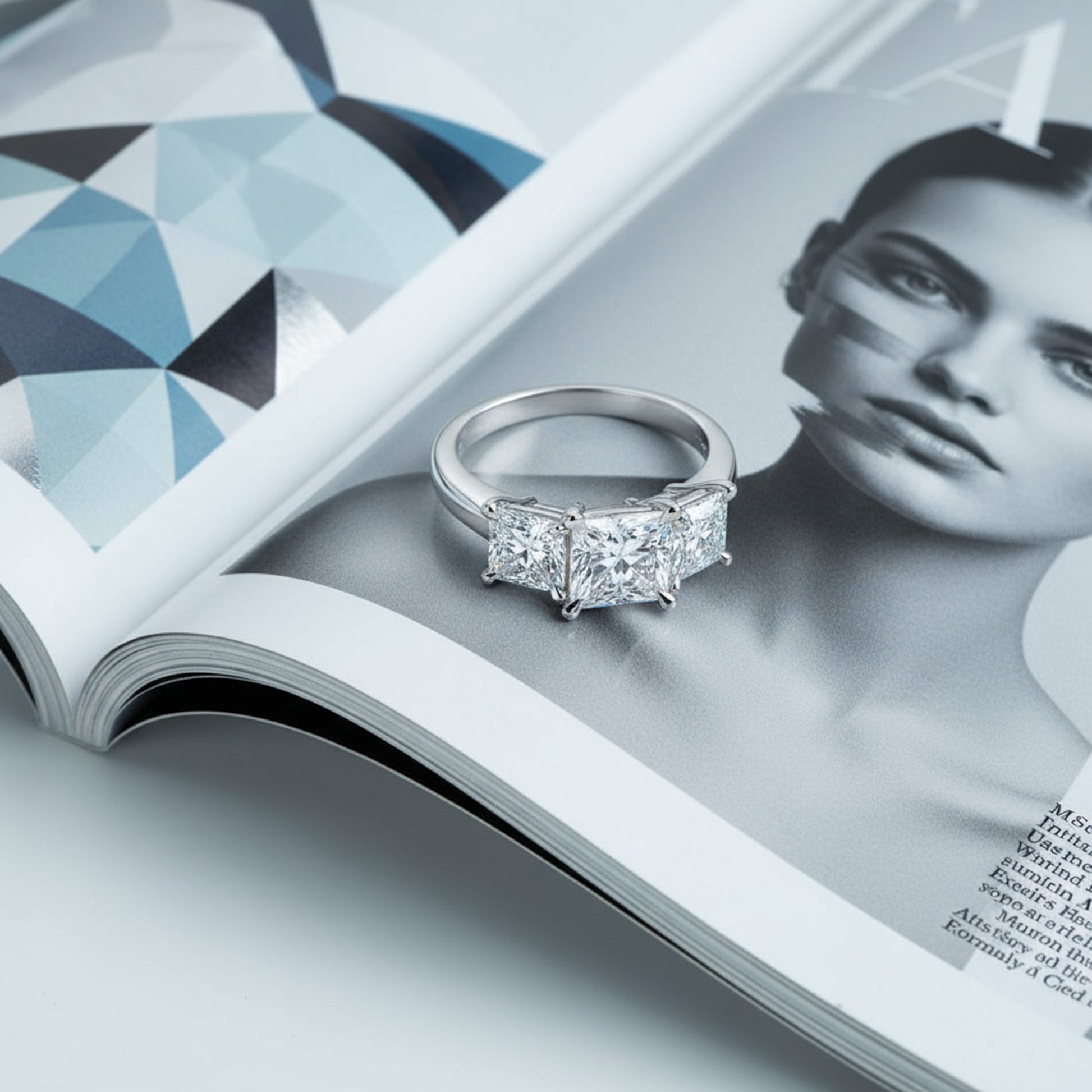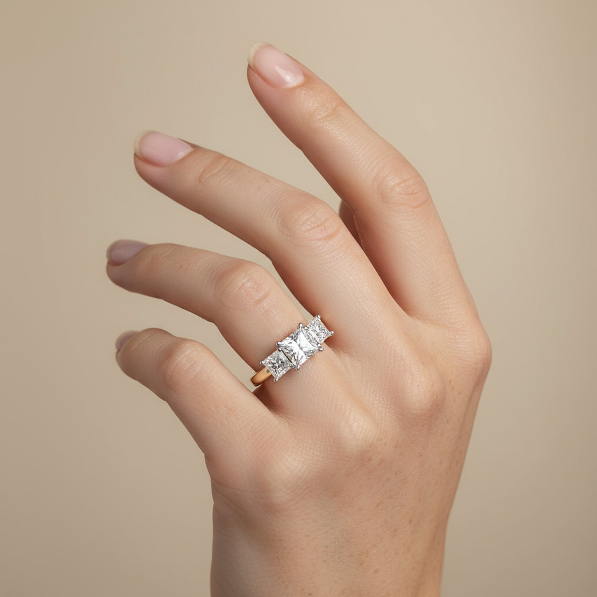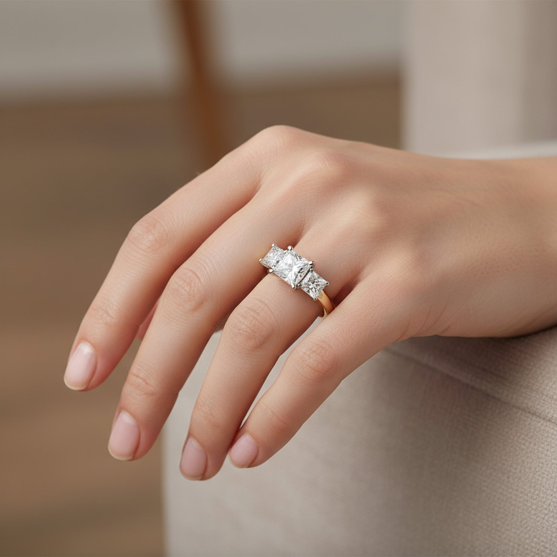 Celebrate your love with this stunning three-stone engagement ring, showcasing a trio of brilliant princess-cut diamonds. The bold center stone is perfectly complemented by two matching side stones, creating a harmonious balance of sparkle and symmetry. Expertly set in a sleek, polished band, this ring radiates elegance from every angle—perfect for marking a moment you'll never forget.