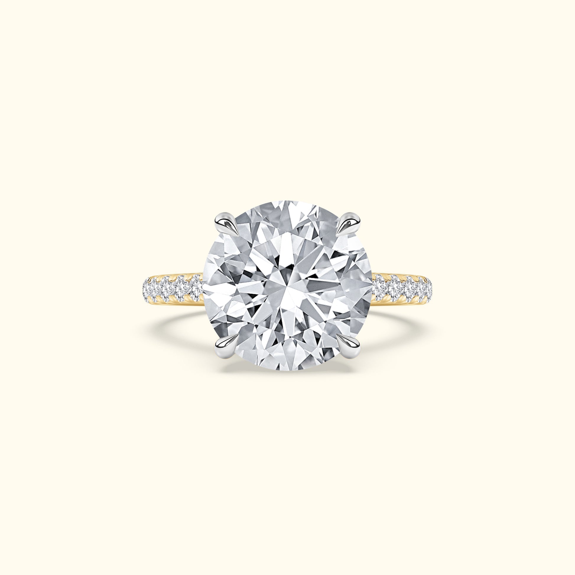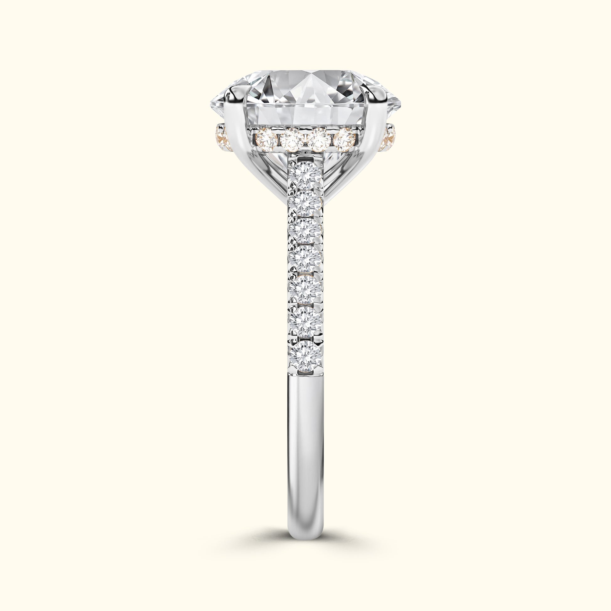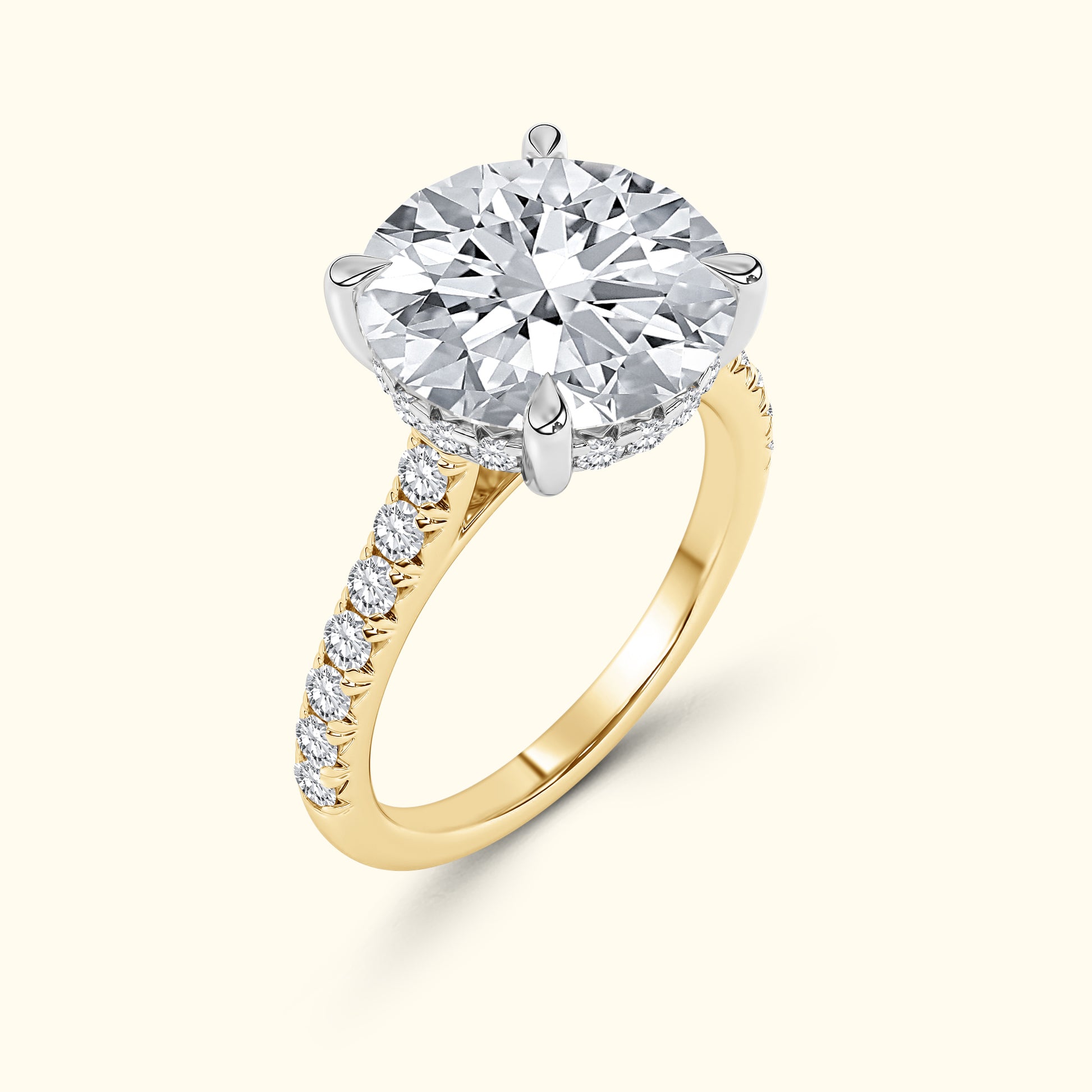 This stunning engagement ring features a brilliant round-cut center diamond, elevated by a hidden halo that adds a soft, radiant glow from beneath. The band is adorned with shimmering pavé-set diamonds, enhancing the ring’s overall sparkle and sophistication. Designed for timeless elegance with a modern twist, this ring offers subtle yet breathtaking detail that shines from every angle. Perfect for those who appreciate classic beauty with an elevated touch.