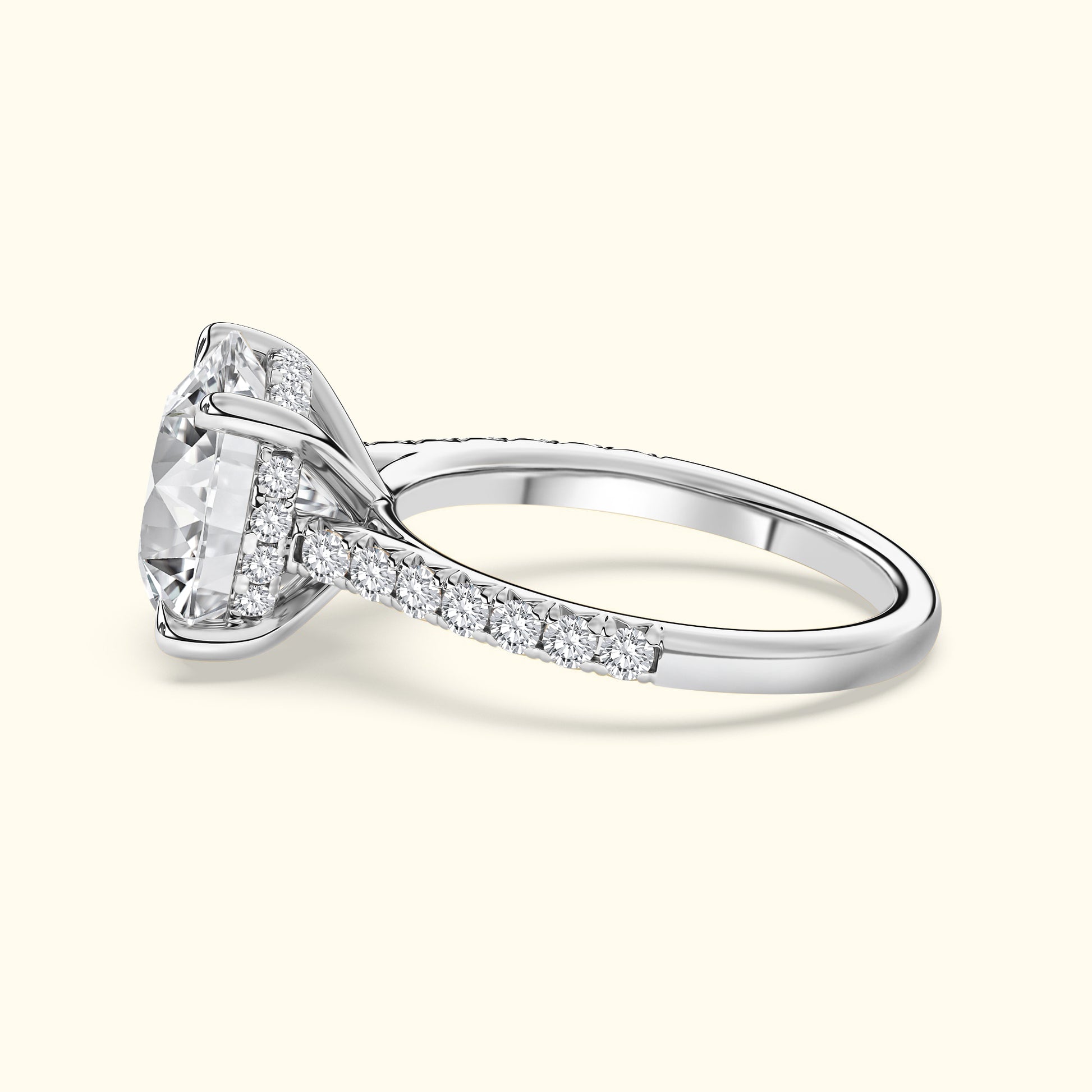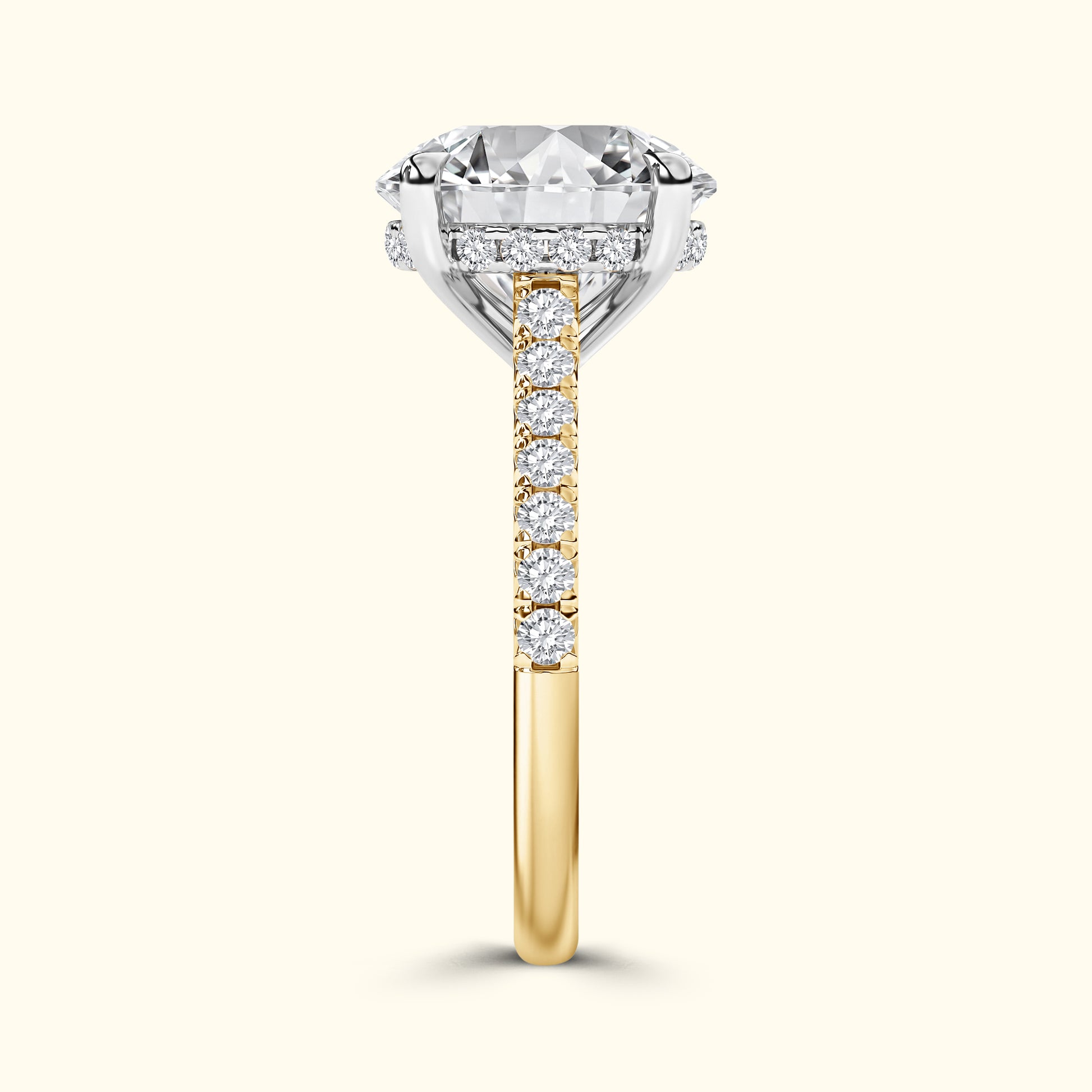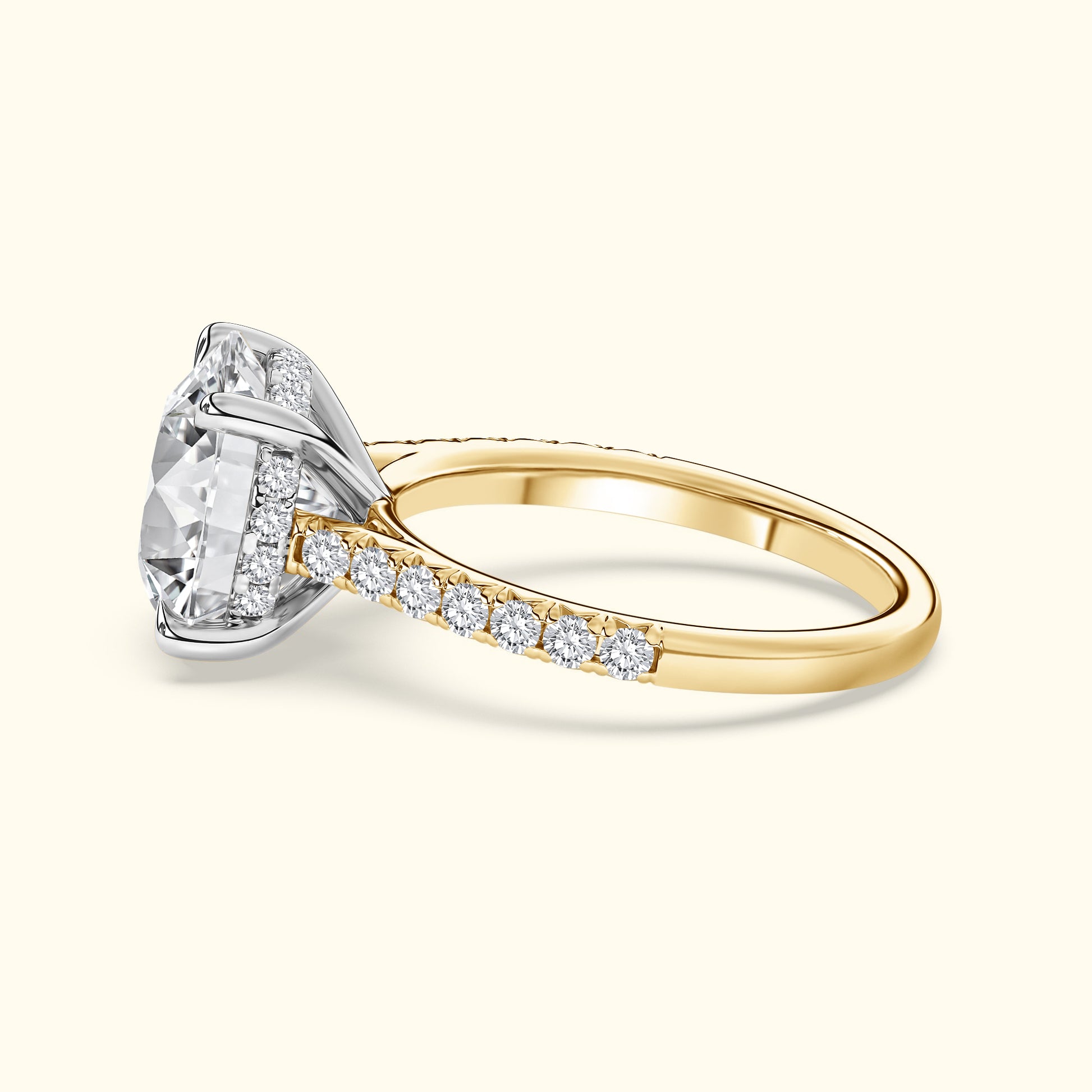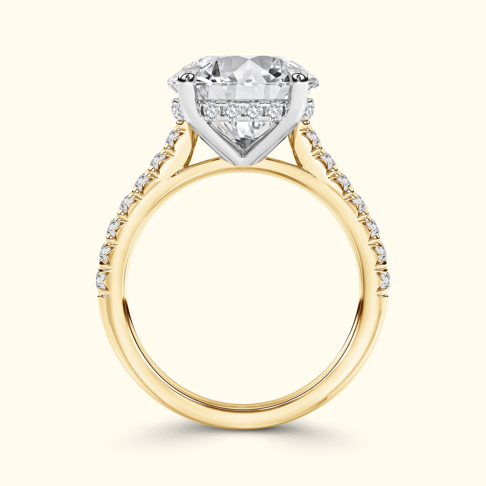 This stunning engagement ring features a brilliant round-cut center diamond, elevated by a hidden halo that adds a soft, radiant glow from beneath. The band is adorned with shimmering pavé-set diamonds, enhancing the ring’s overall sparkle and sophistication. Designed for timeless elegance with a modern twist, this ring offers subtle yet breathtaking detail that shines from every angle. Perfect for those who appreciate classic beauty with an elevated touch.