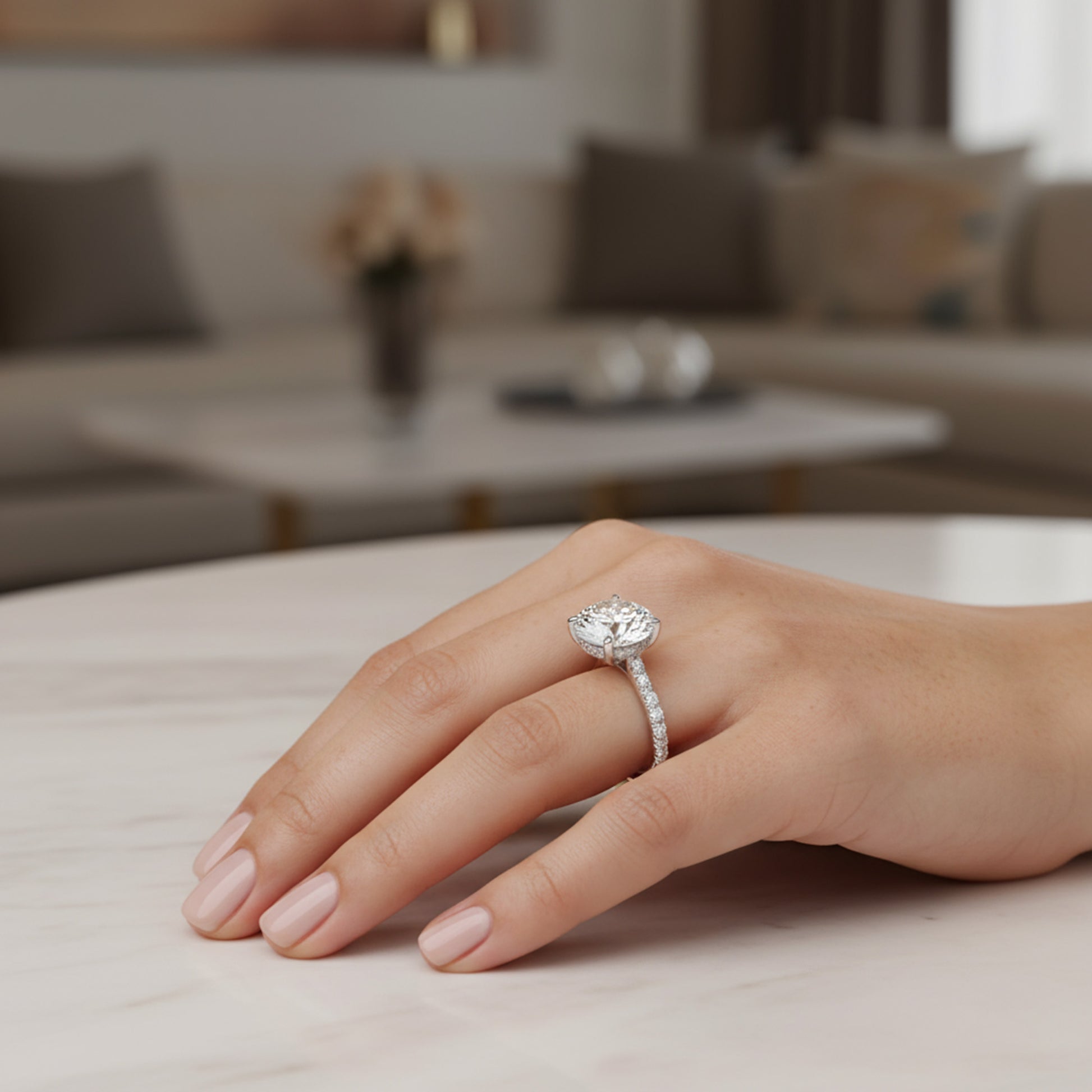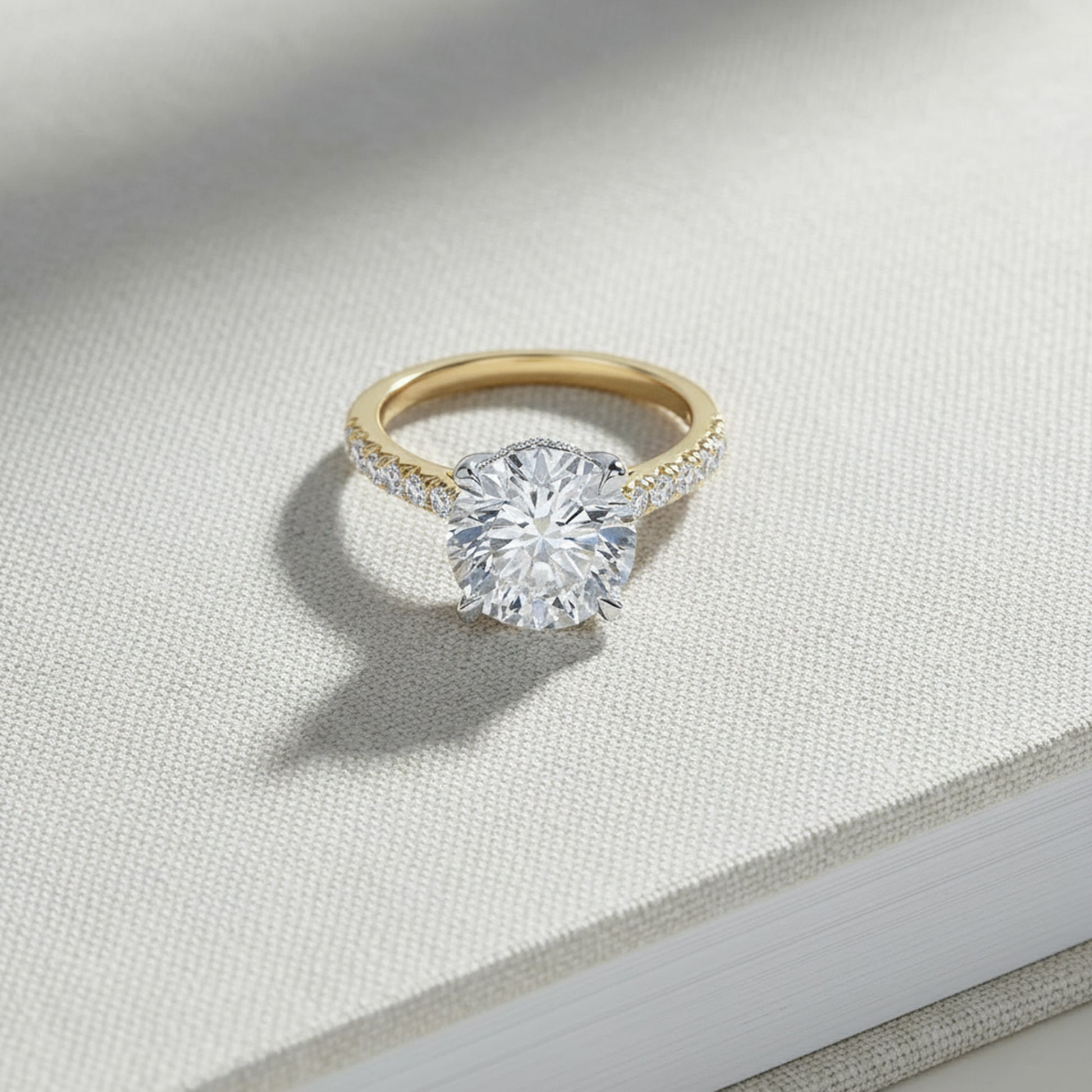 This stunning engagement ring features a brilliant round-cut center diamond, elevated by a hidden halo that adds a soft, radiant glow from beneath. The band is adorned with shimmering pavé-set diamonds, enhancing the ring’s overall sparkle and sophistication. Designed for timeless elegance with a modern twist, this ring offers subtle yet breathtaking detail that shines from every angle. Perfect for those who appreciate classic beauty with an elevated touch.