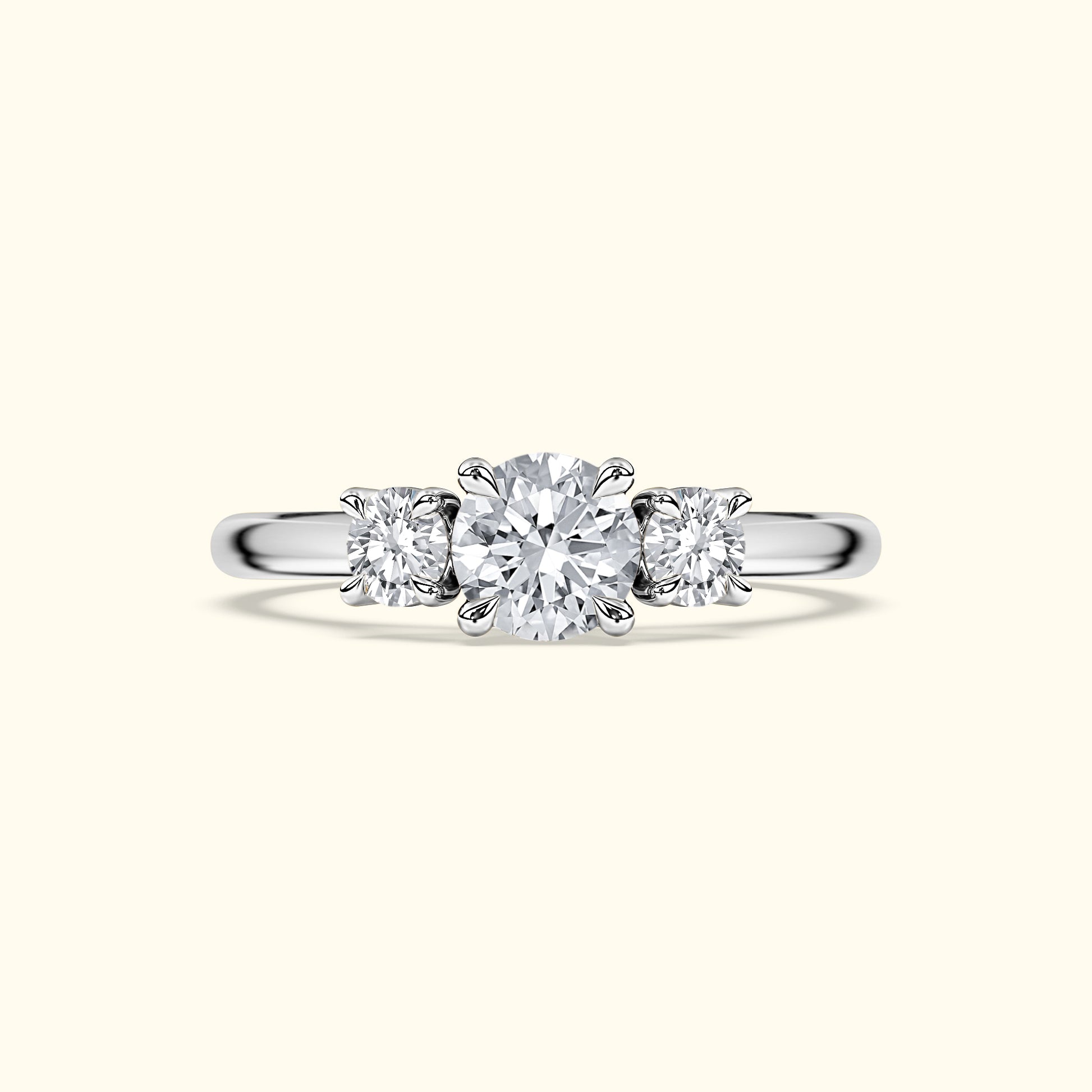 This three-stone ring features a round center diamond with two smaller rounds, symbolizing past, present, and future. Classic prongs keep the look sleek and brilliantly radiant.